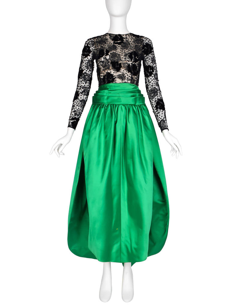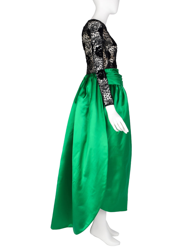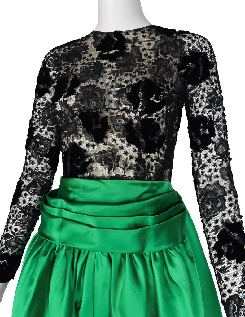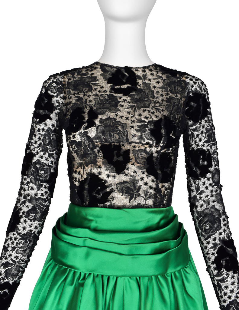 Givenchy Haute Couture Vintage AW 1978 Documented Black Lace and Green Duchess Satin Gown