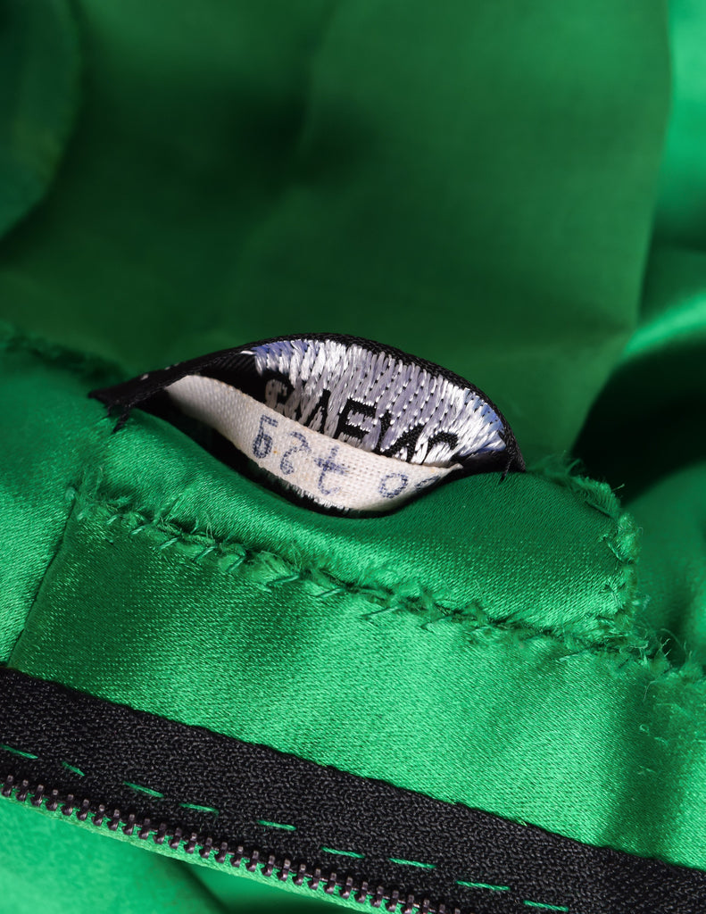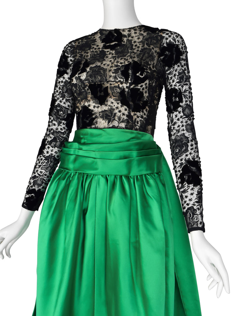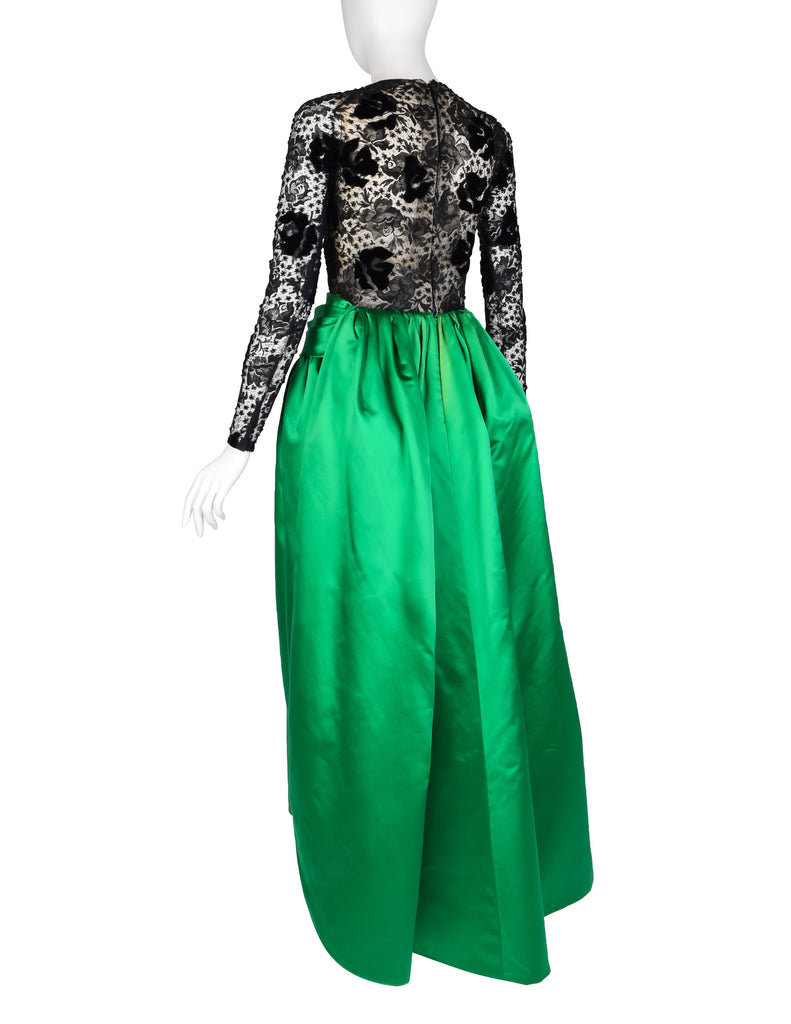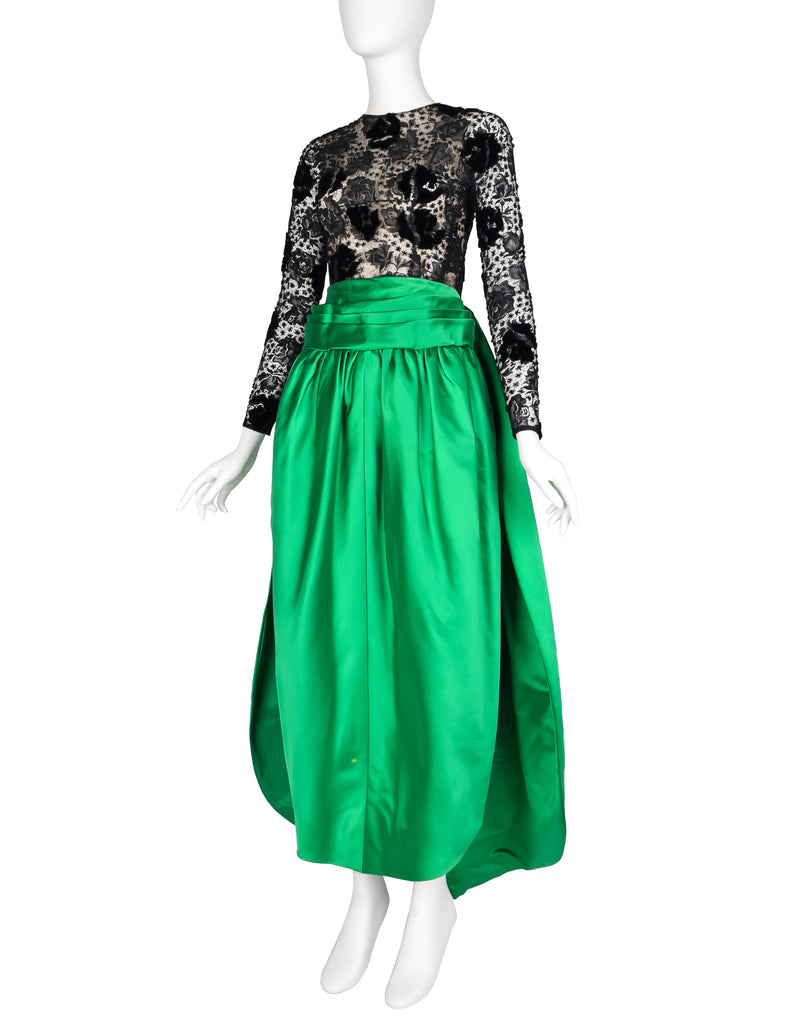 Givenchy Haute Couture Vintage AW 1978 Documented Black Lace and Green Duchess Satin Gown