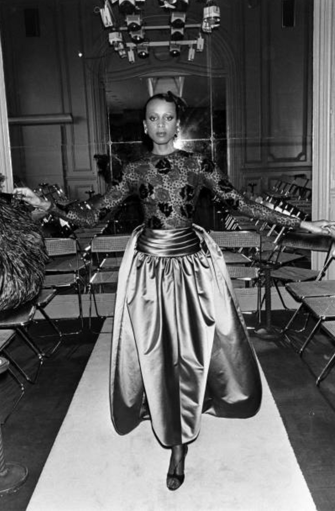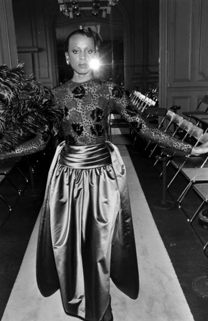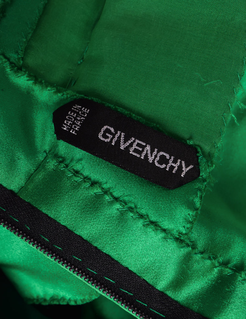 Stunning vintage Givenchy (by Hubert Givenchy) HAUTE COUTURE gown from Fall/Winter 1978, shown here documented on the runway. This phenomenal piece of fashion history has a sheer black lace bodice, with hand cut and hand sewn velvet floral appliques and hand beading throughout. Stitched at under bust in the center for a more precise fit, lined in beige tulle. Bright green duchess silk satin cummerbund and skirt with pleats at the upper and material inside for a fuller look at the hips that lightly tapers toward the hem. Semi-structured overlay at backside that wraps toward the hip. The entire piece and the interior, as you would expect in a Haute Couture piece, is completely hand stitched and hand finished. Zip closure at backside and additional snap closure at outer skirt layer.
