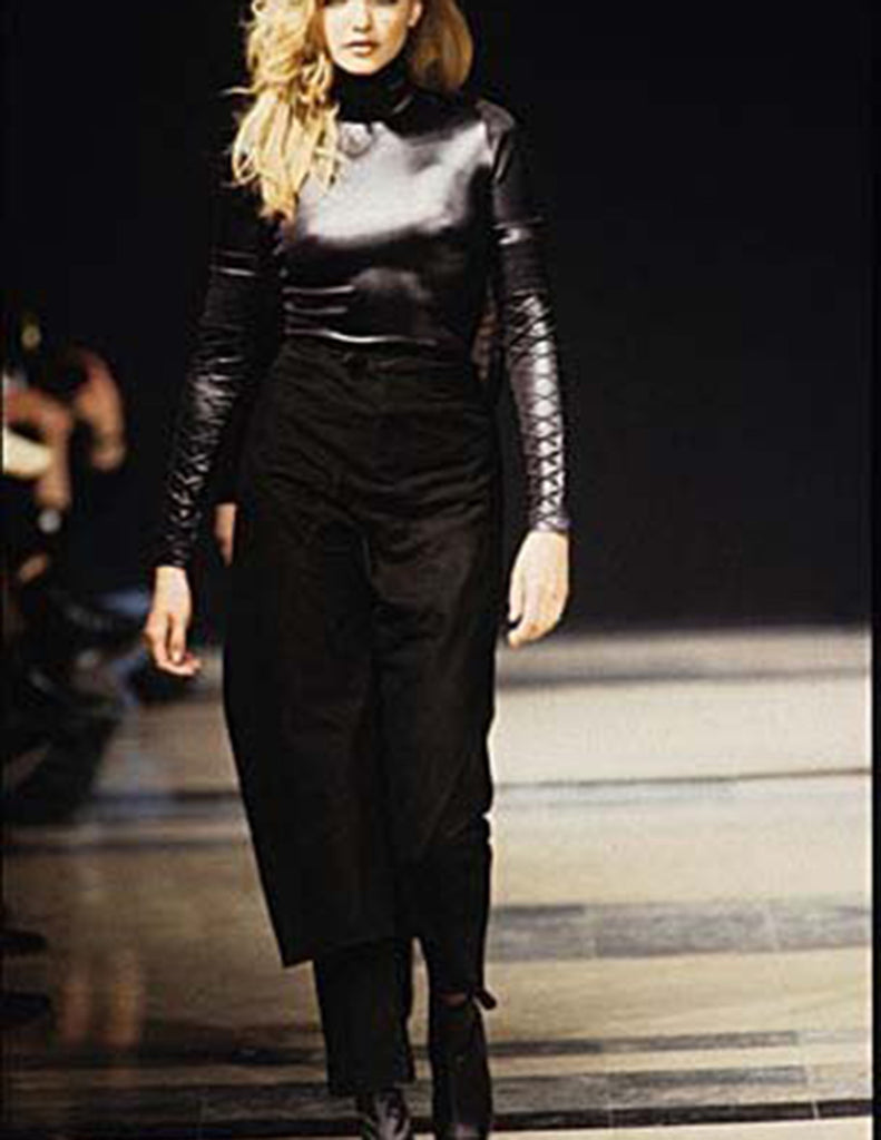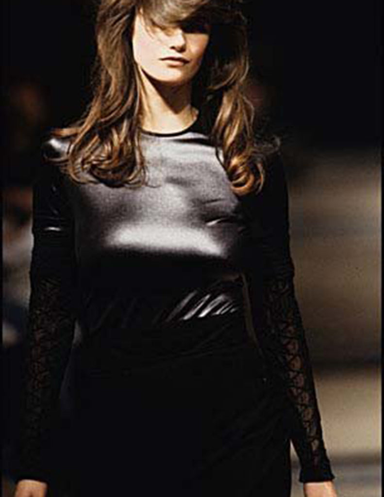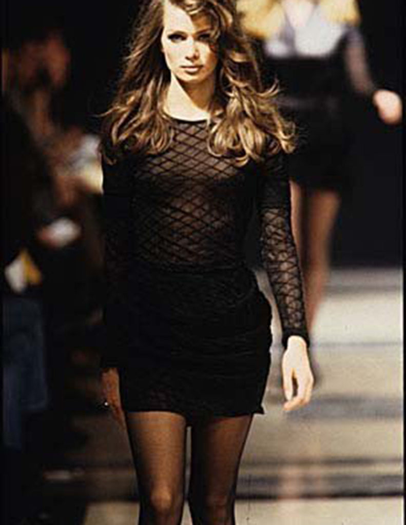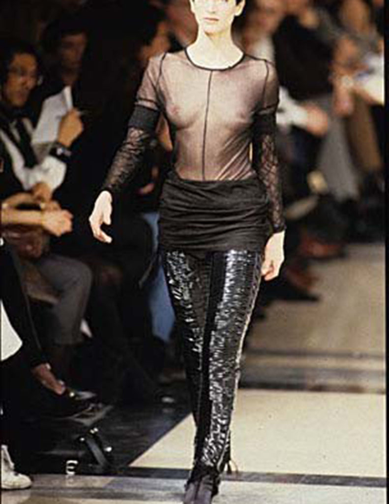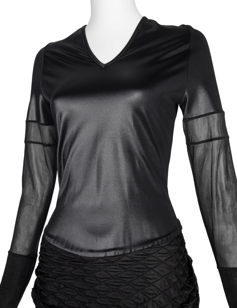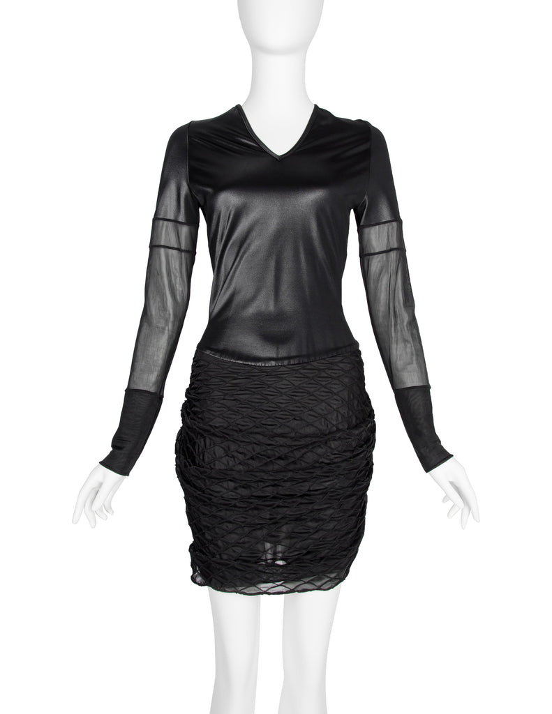 Incredible and noteworthy dress from Helmut Lang, Fall/Winter 1992 (a variety of similar pieces shown here parading the runway). 1992 was an iconic year for Helmut Lang - the reviews were outstanding. Lang was said to provide fashion for the anti-fashion, elevating club wear and minimalism for those who didn't have a staple designer to look toward before him. This dress is a great example of his work from the heyday of an era he helped define. Black liquid stretch spandex bodice with v neck and sheer banded panel sleeves. Stitching at lower waist connects the skirt bottom, which is comprised of diamond stitched sheer layered over double sheer fabric and overlapping in the back to reveal the underskirt. Very interesting details. A fantastic piece that is as rare as it is cool.