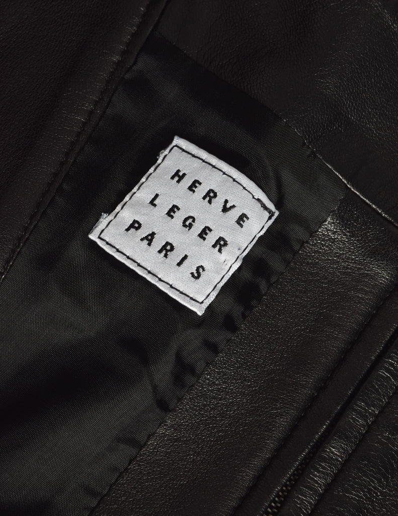 Incredible vintage Herve Leger dress in jet black, supple and smooth leather. This piece boasts a phenomenal fit- featuring a bustier style bodice with molded cups and super sexy v cuts at sides. A line, mini length skirt. Zips closed at backside. Fully lined.