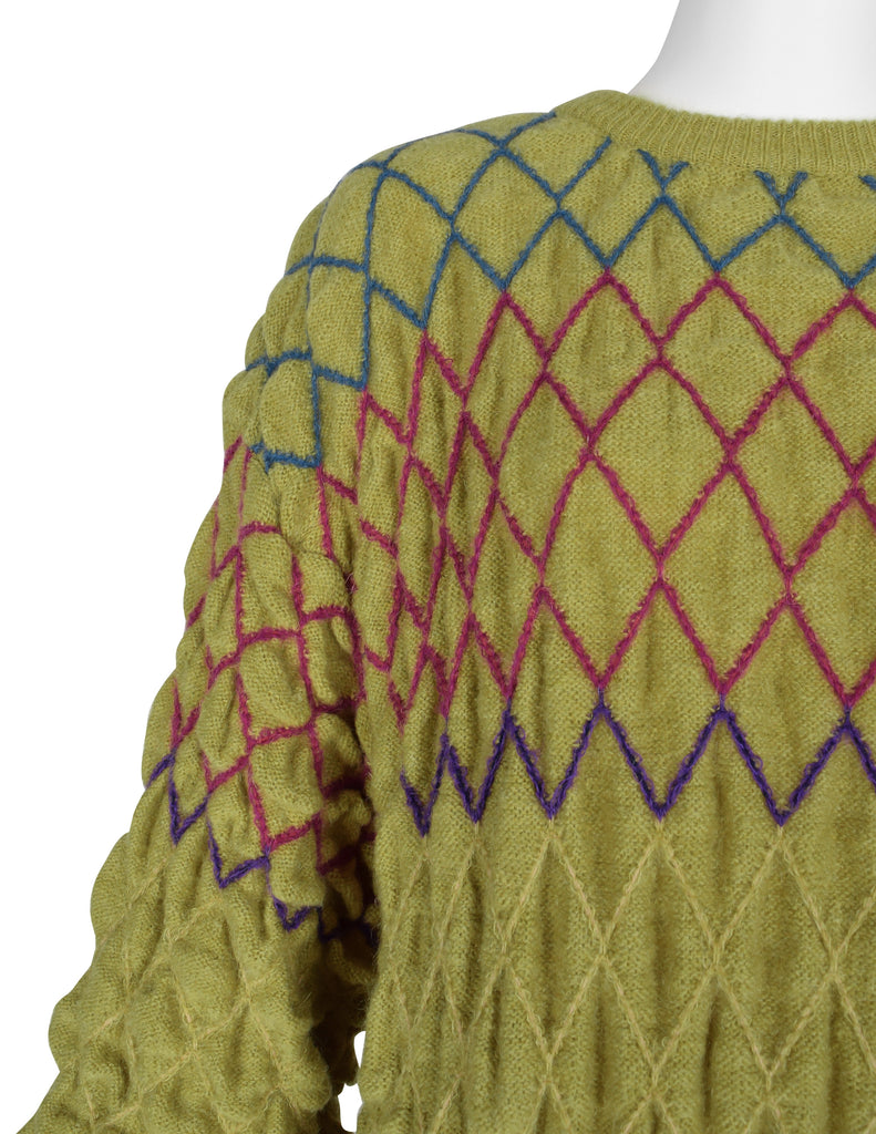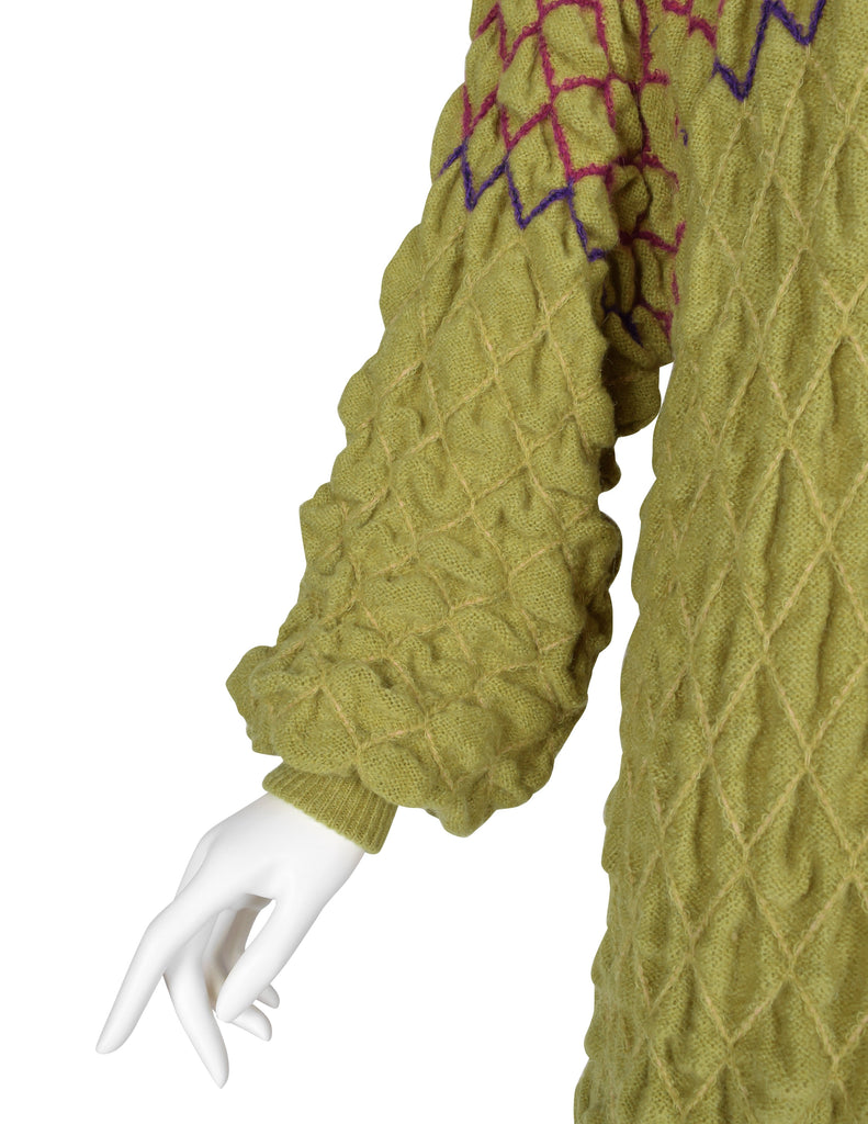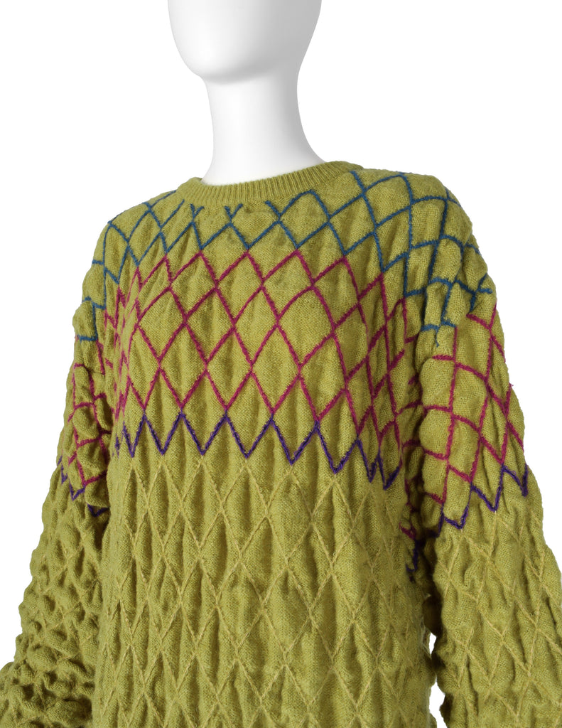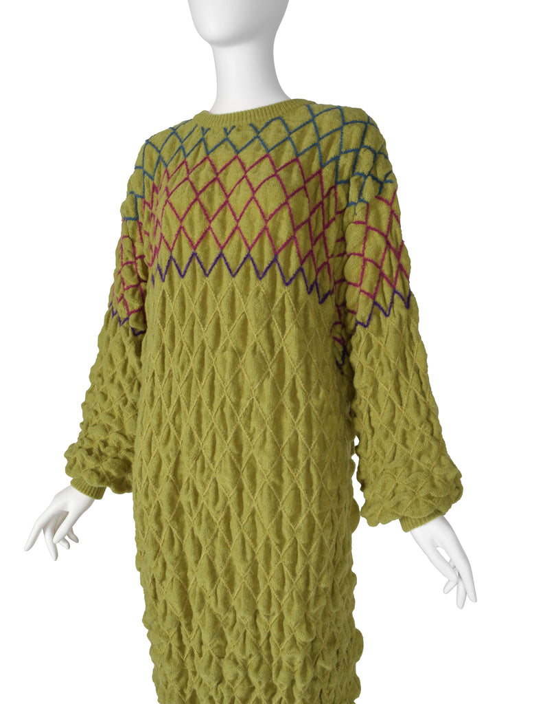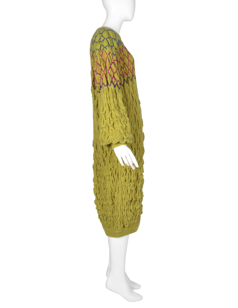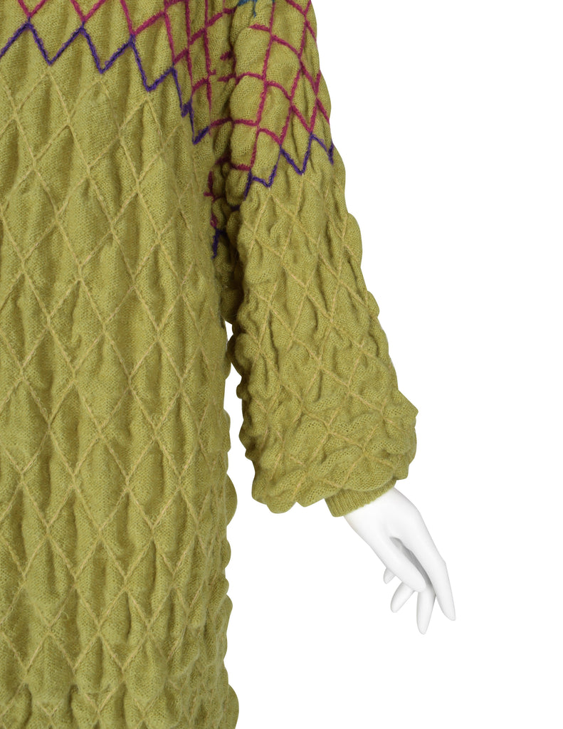 Out of this world vintage Issey Miyake dress from the late 1970s. Hairy chartreuse wool, featured diamond smocking in teal, magenta, purple, and chartreuse, creating a gathered ruched effect that is interesting and eye-catching. Ribbed knit cuff, hem, and neckline. Voluminous sleeve. Lots of stretch. Pulls on, no closures of any kind. Unlined. A total dream!
