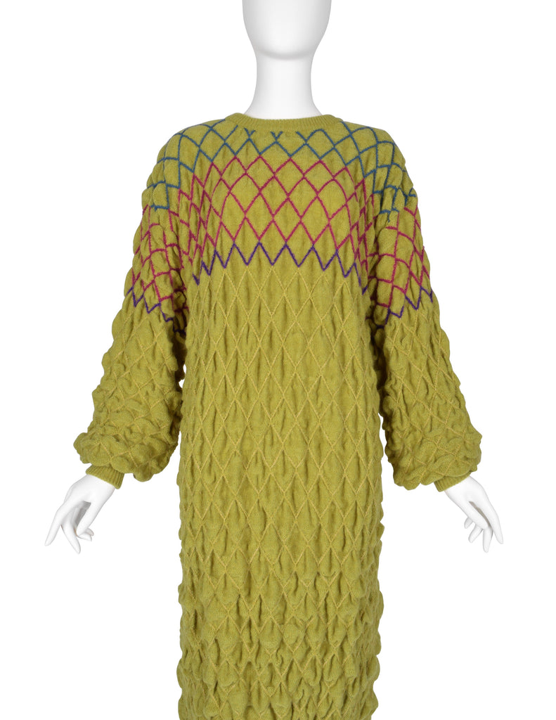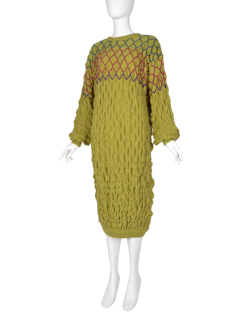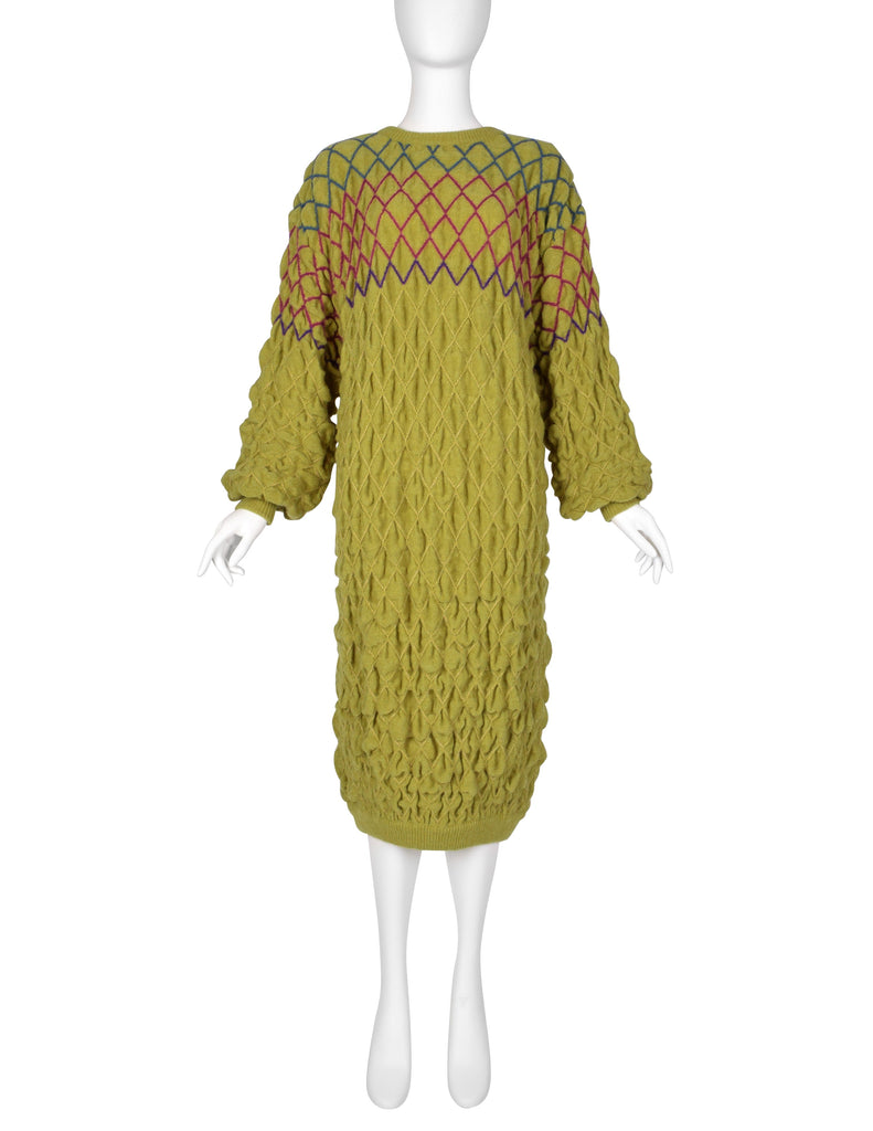 Issey Miyake Vintage Late 1970s Chartreuse Diamond Smocked Ruched Wool Knit Sweater Dress