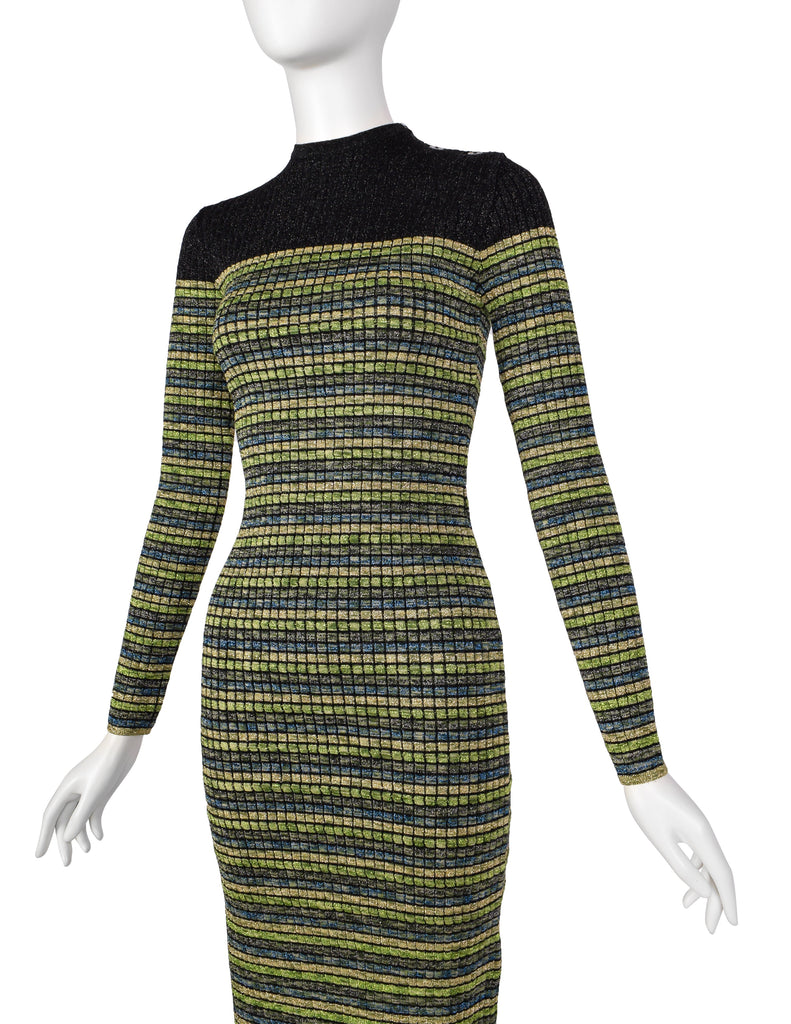 Jean Paul Gaultier Vintage AW 1990 Green Blue Black Gold Sparkly Striped Knit Mini Dress