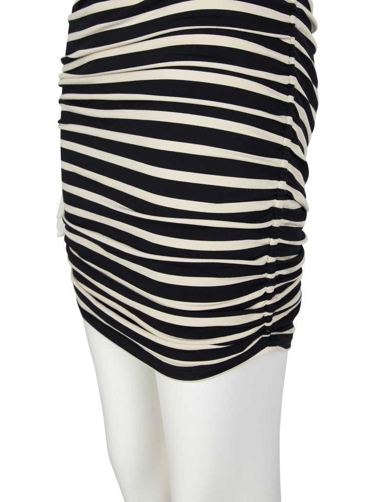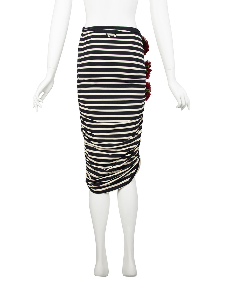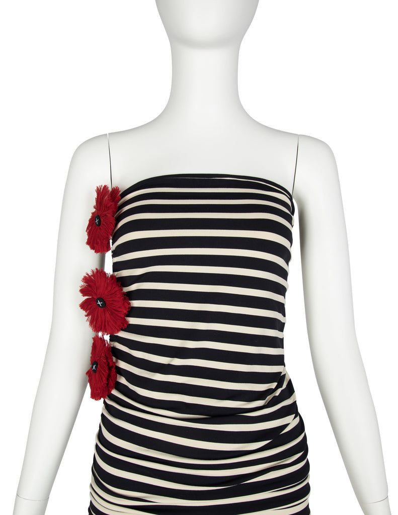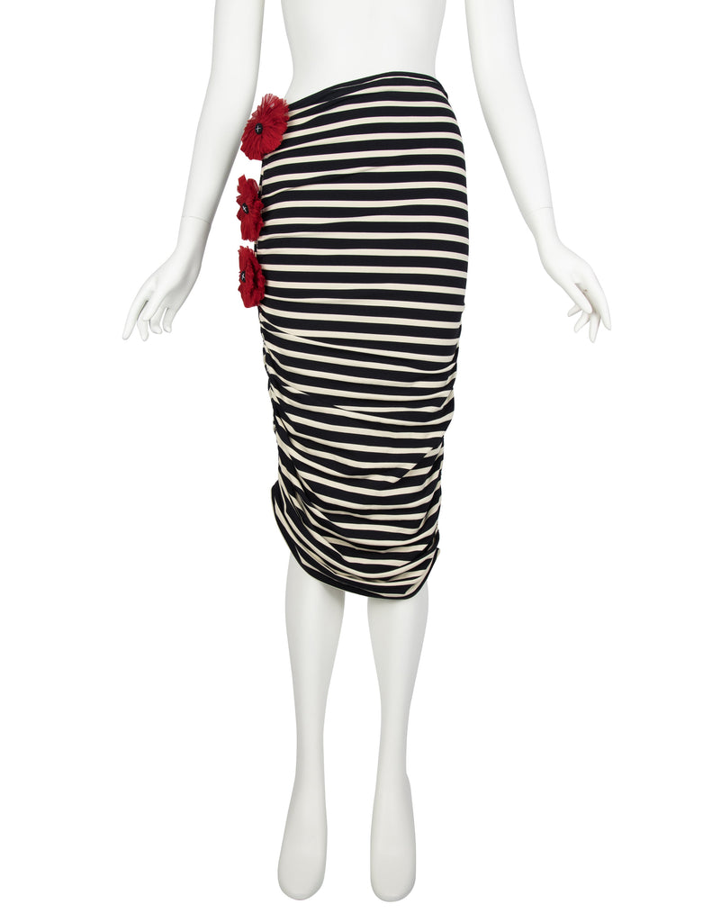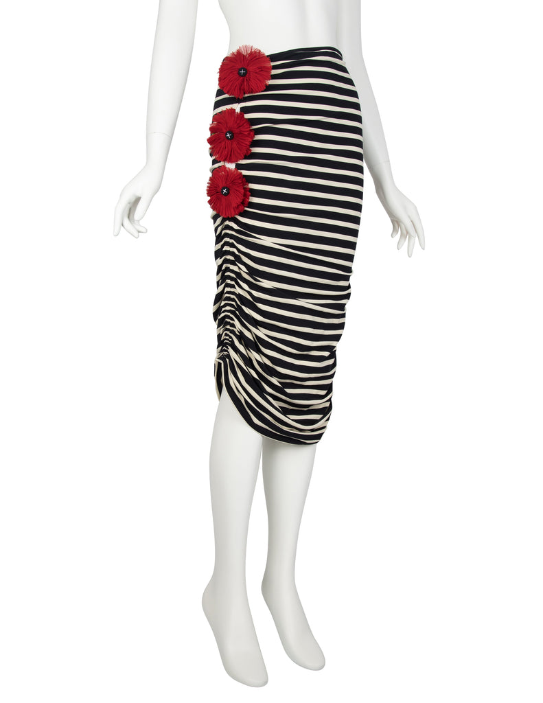 Fantastic vintage Jean Paul Gaultier piece from the early 2000s. This incredible number is suitable to be worn as a mini dress or skirt, as shown here. Black and off-white striped stretch body con fit with ruched sides, in a lycra blend. Cutest lil' cut outs at upper right side with gorgeous red plated silk flowers that snap on and act as closures.