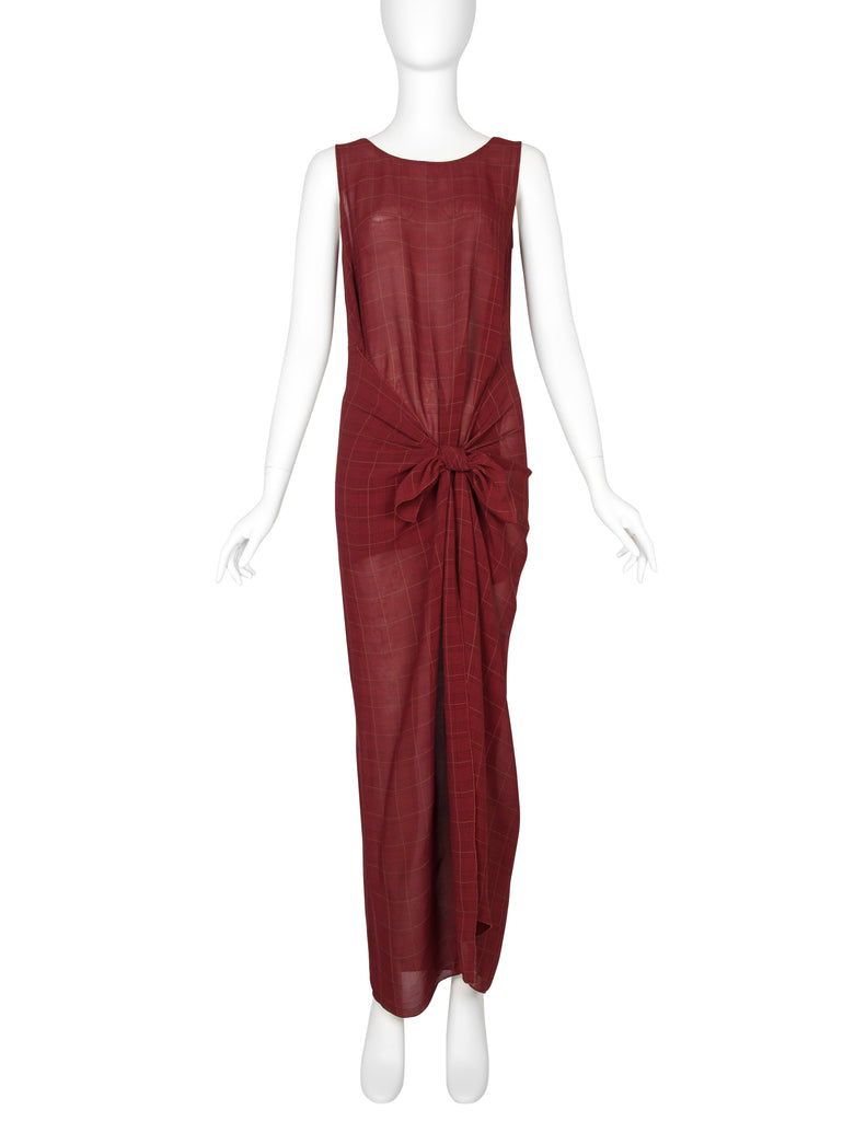 Rare, iconic vintage Jean Paul Gaultier dress from the treasured Spring/Summer 1994 'Les Tatouages' collection, shown here documented on the runway. This total knockout comes in a sheer burgundy plaid rayon. Pulls over the head, with a mini length at front and extended sides that span from the back and wrap and knot at the hip. This gorgeous piece transcends any season, and is sure to become one of the favorites in your closet.
