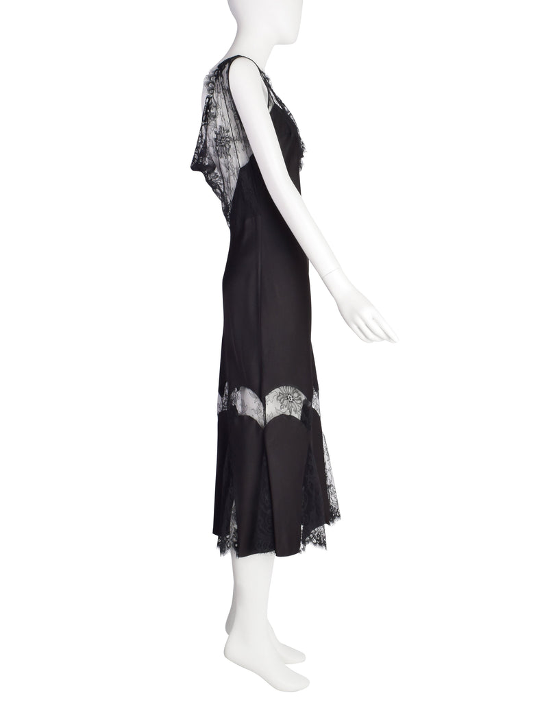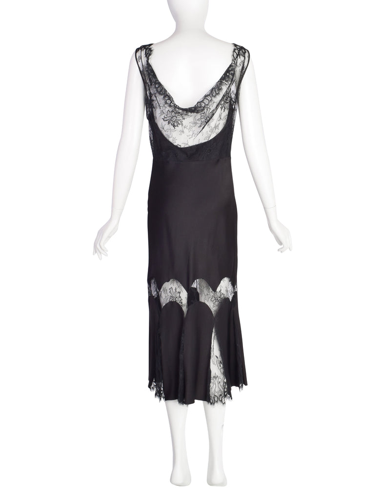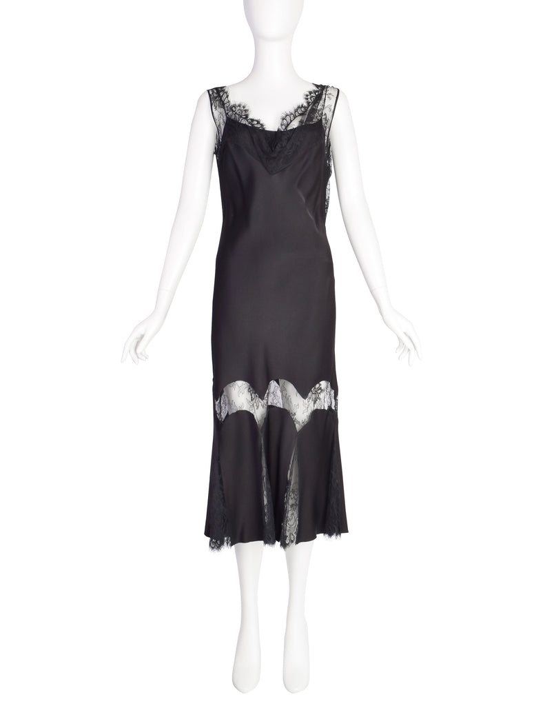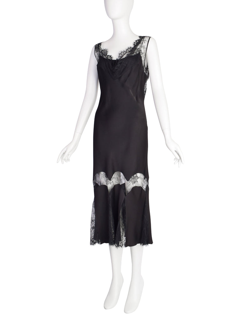 Breathtaking vintage John Galliano gown from Fall/Winter 2003. Black, hammered satin in Galliano's signature bias cut. Spaghetti straps, with a draping lace overlay that spans the front of the bodice to the back, with gorgeous scalloped edge details. Flouncy skirt bottom with matching scalloped and triangular lace insets, giving a little peek at some legs and exhibiting incredible movement as you strut. This versatile dress has the ability to be both cocktail and red carpet worthy.