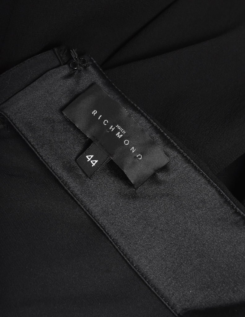 Incredible vintage dress by John Richmond. This breathtaking sleeveless mini dress is made of sheer black silk chiffon, layered over solid black silk charmeuse lining, strapless, ut connected. Attached, the most insane and dramatic scarf cape that can be styled in a variety of ways, as shown here. A gorgeous beaded and sequin dragon motif spans the front. Zipper closure at backside.
