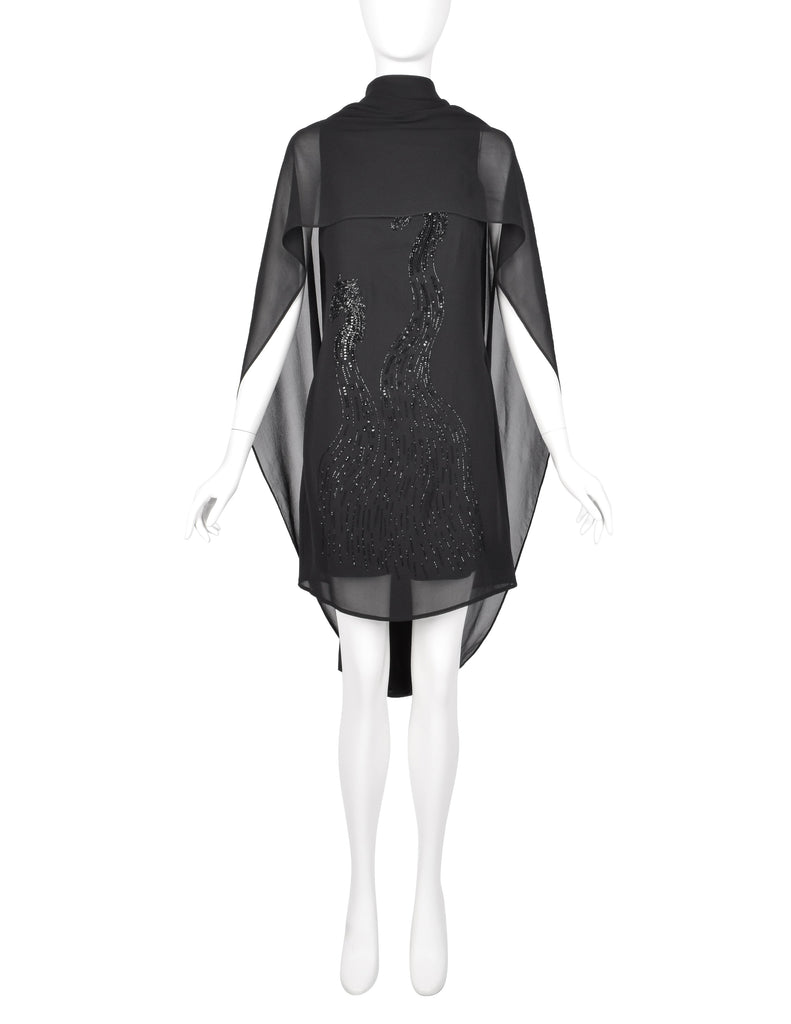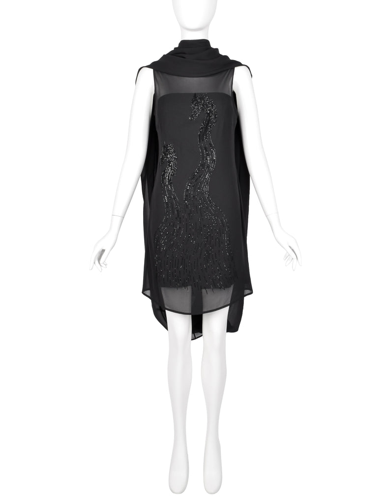 John Richmond Vintage Black Sheer Silk Beaded Dragon Mini Dress with Attached Scarf Cape