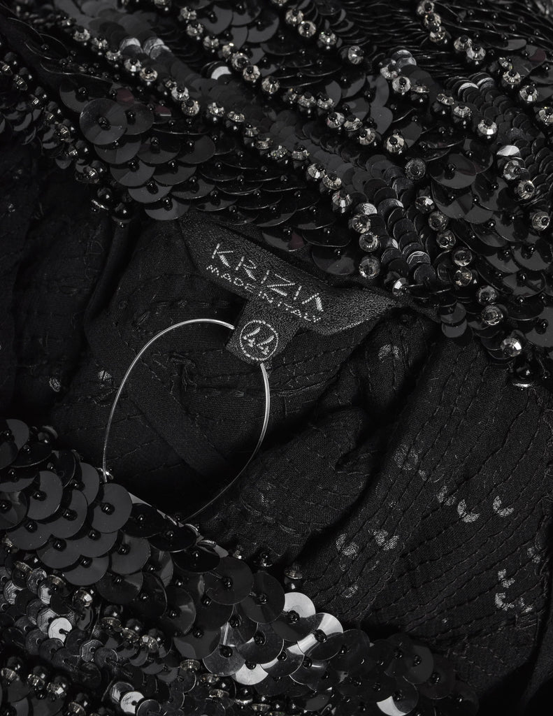Fantastic vintage Krizia gown from Fall/Winter 2006, shown here documented on the runway. This dress is heavily and fully embellished with high quality sequins of varying sizes in black, detailed in silver and black crystals and beads throughout - all on a silk mesh. A column silhouette, with a one shoulder, single short sleeve. Sexy, high slit at left side. Zipper closure at right side. A unique and phenomenal red-carpet worthy piece.