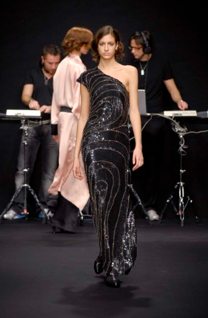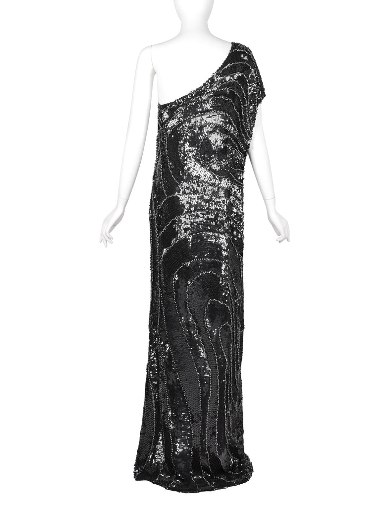 Krizia Vintage AW 2006 Black Silver Beaded Sequin Silk One Shoulder Gown