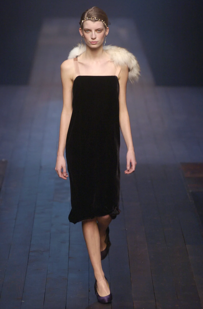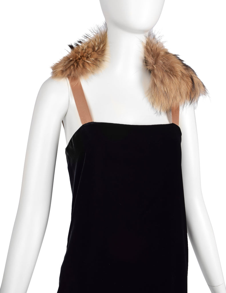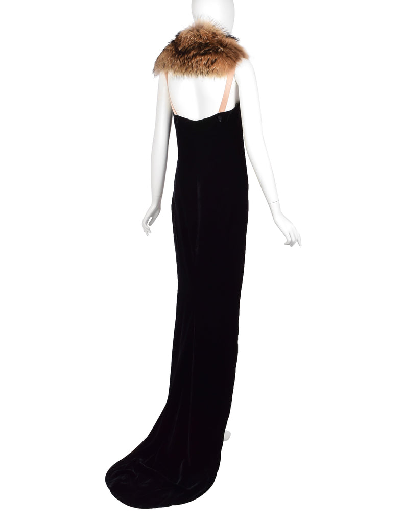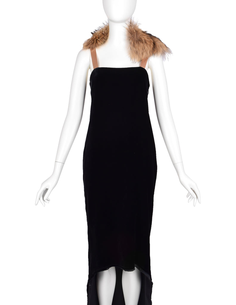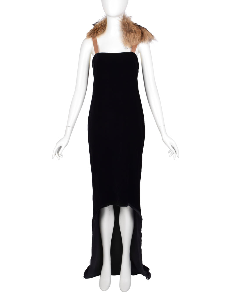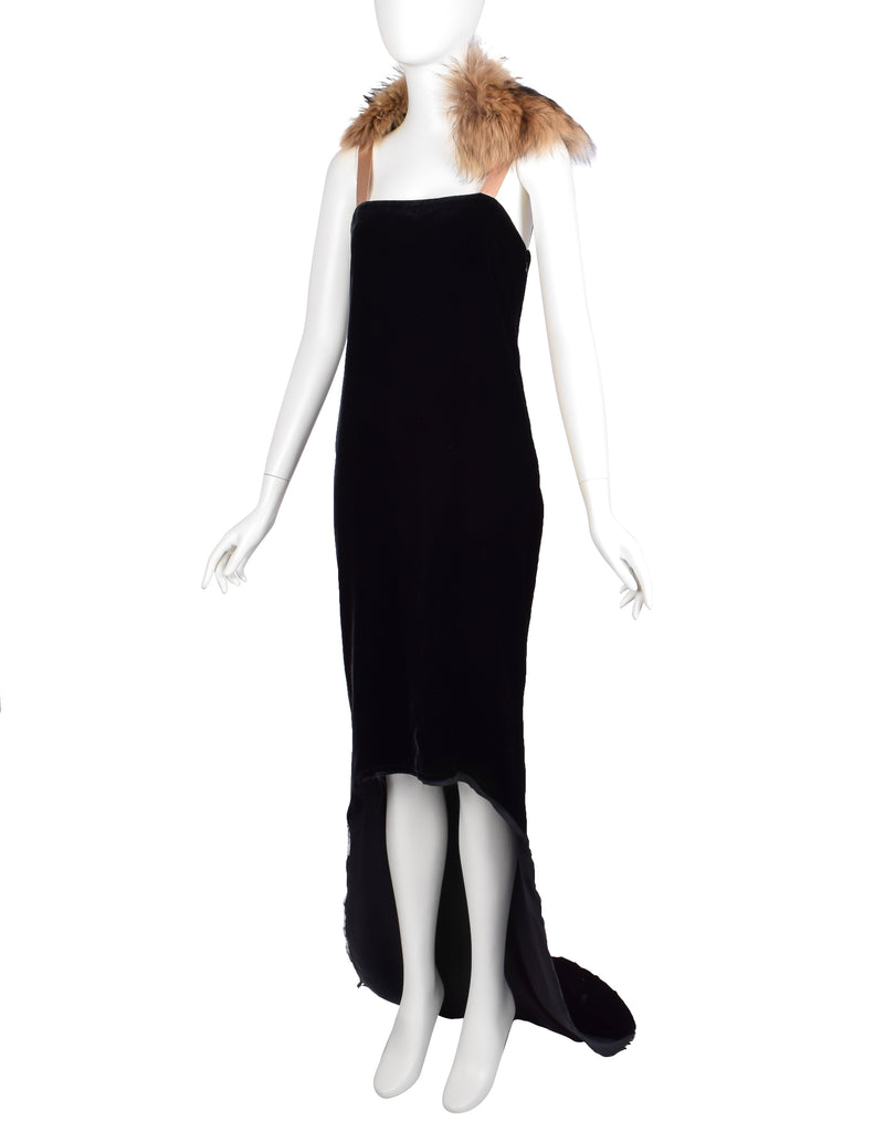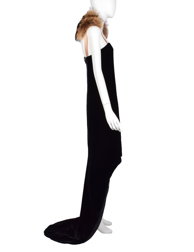 Absolutely stunning vintage Lanvin gown, from Fall/Winter 2004, by Alber Elbaz, shown here documented on the runway as the closing look of the collection. Loveliest black silk velvet column gown with an asymmetrical, high/low hemline that extends to a dramatic train. The train has button holes toward the hem, to fasten it to the button at the backside of the dress to form bustle - a convenient feature for converting the look! Lined in black silk satin, with both layers having an intentionally distressed edge at the hem. Gorgeous almond silk satin straps with hooks to accommodate the beautiful varying shade marmot fur collar, allowing you to re-place and style it in a variety of ways. Invisible zipper closure at side. We're in love with it and you will be, too!