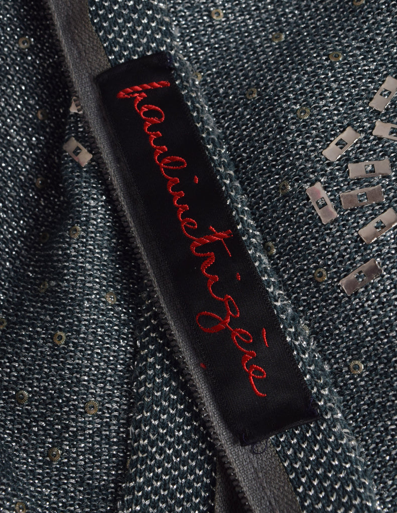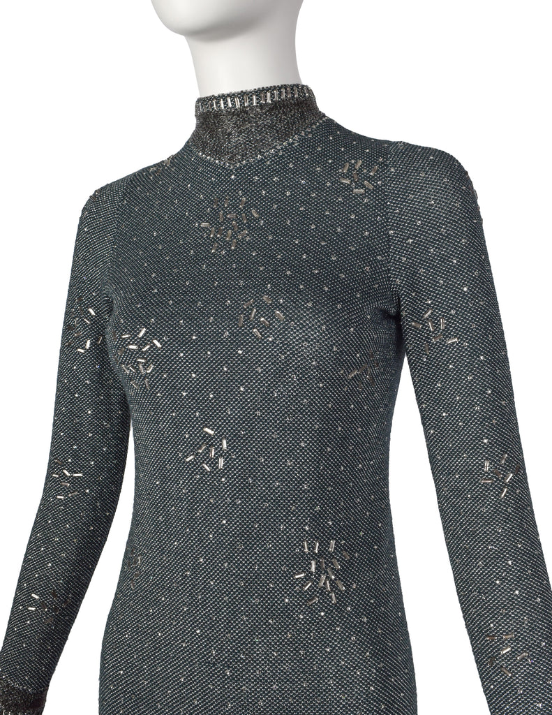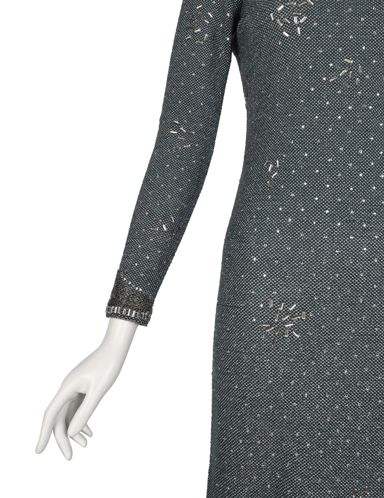 Phenomenal vintage Pauline Trigere gown from the early 1970s. The most beautiful, deepest teal green knit wool with silver thread throughout, a medium-weight stretch that hugs the body. Rhinestone and crystal embellishments throughout, with the most fabulous detailed neckline and cuffs adorned with gunmetal bugle beads. Zip up closure at backside. Comes with matching shawl. It truly sparkles and shines in person, and is a unique holiday, party, or red carpet dream! Unlined. This remarkable piece was part of the personal collection of Lucie Porges, Pauline's closest collaborator and right hand.