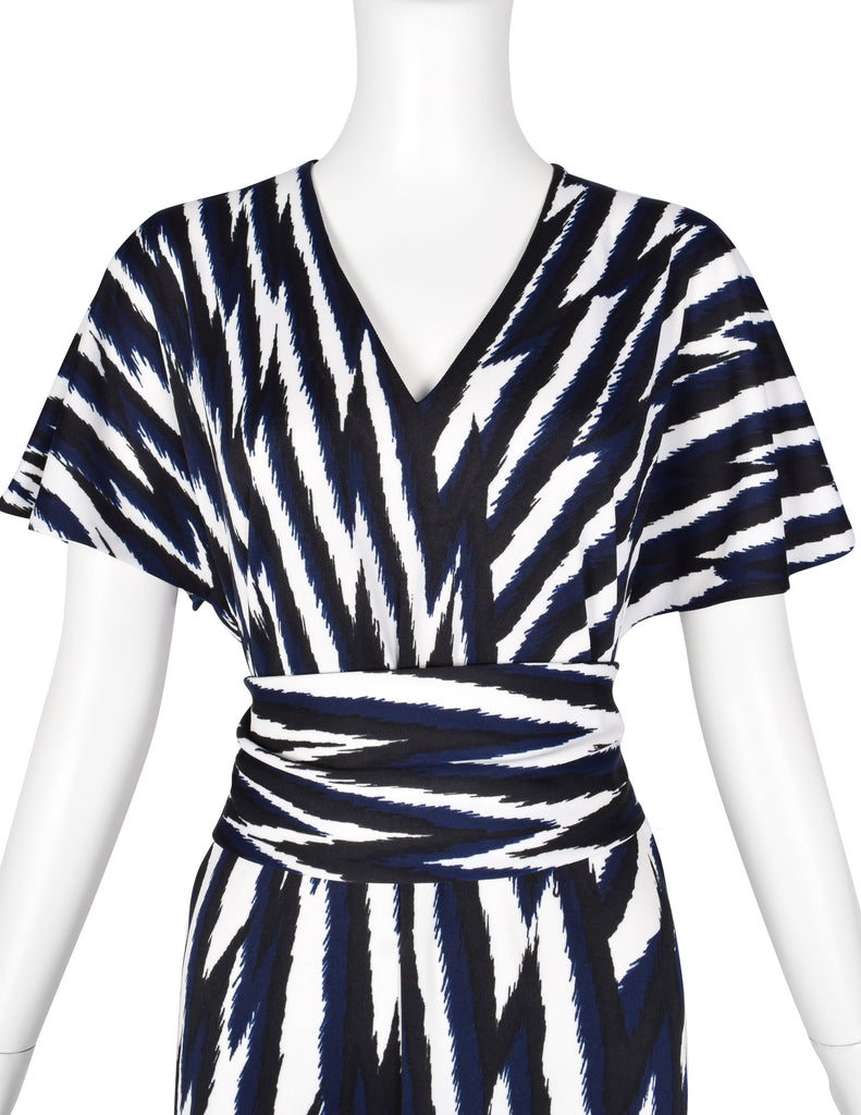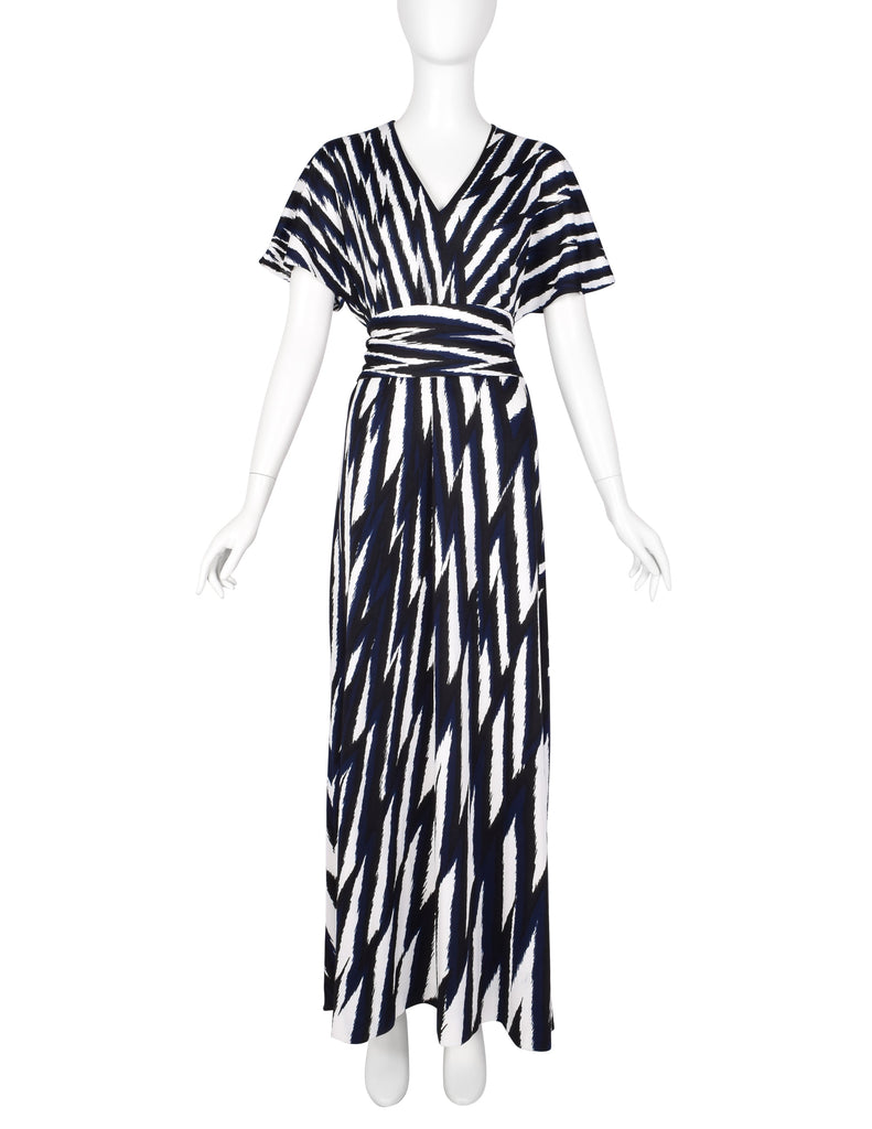 Roberta di Camerino Vintage 1978 Black Blue & White Zig Zag Print Jersey Maxi Dress
