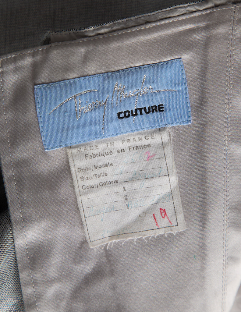 Absolutely epic vintage Thierry Mugler Couture dress, circa 1998-2002. Fantastic medium weight, structured metallic silver lame. Fitted bodice featuring pointed bust cups, complete with a boned inner corset at the upper lining. Hooked closure at corset back, zipper closure at backside of dress. Lined in silver satin and acetate. A total treasure, sure to get you all the compliments whenever and wherever you wear it.