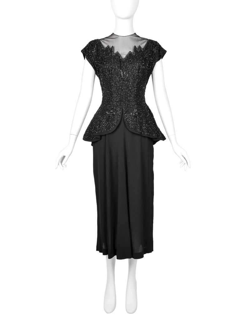 Vintage 1940s Black Beaded Rayon Peplum Dress
