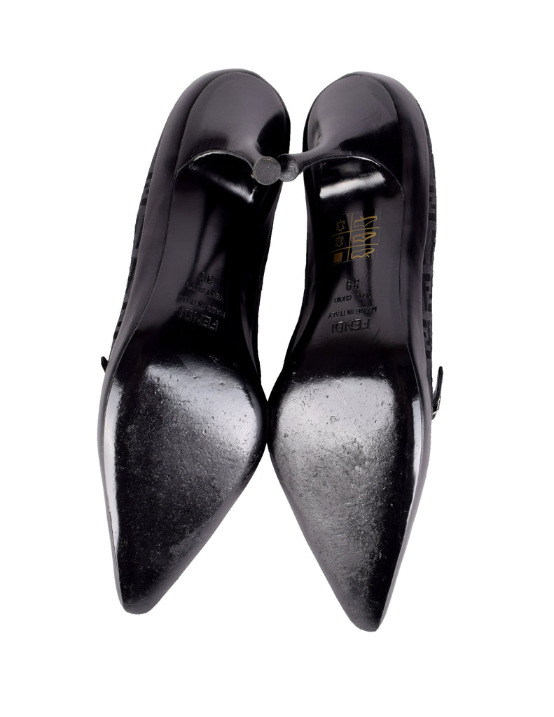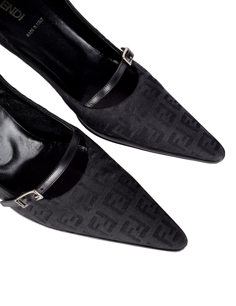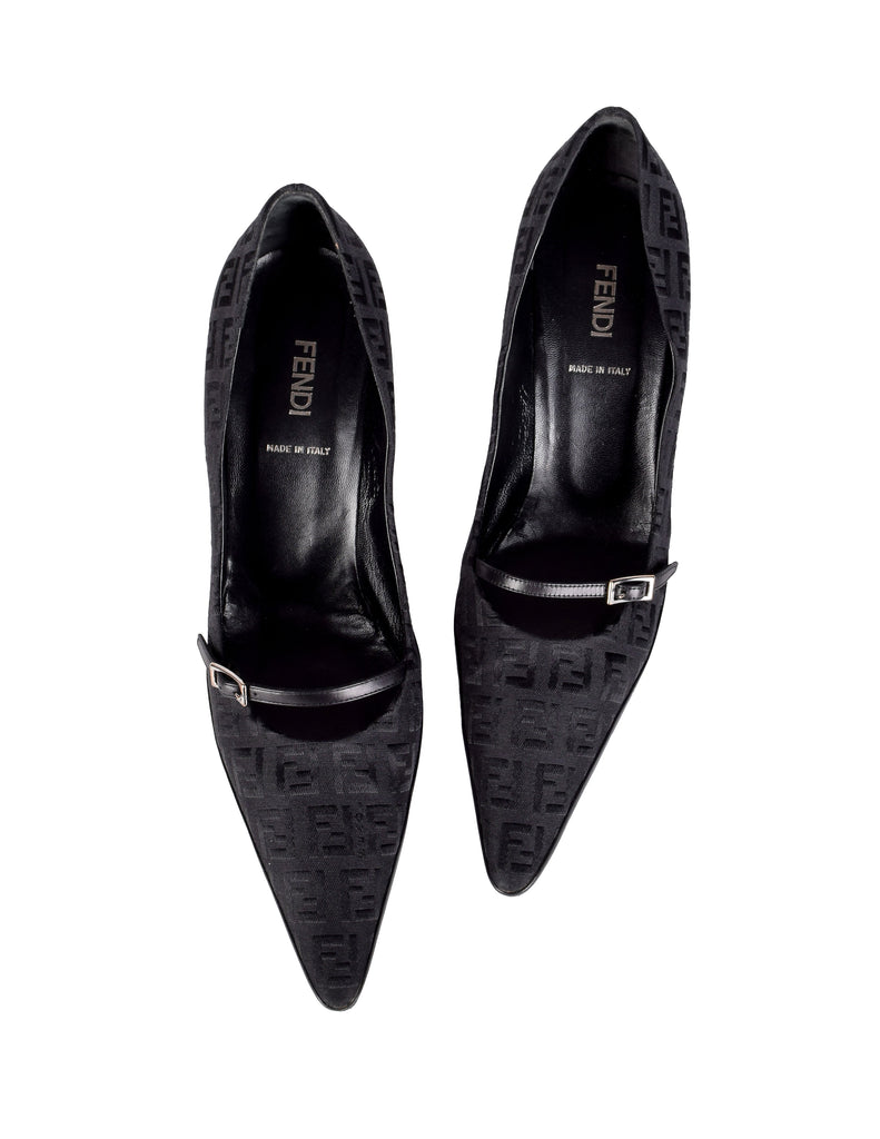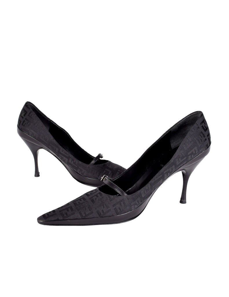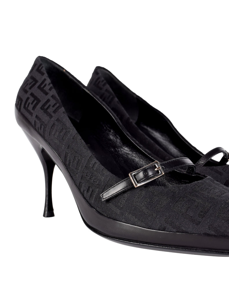 Gorgeous, cool vintage Fendi heels from the late 1990s/early 2000s. Black zucchino FF logo fabric, detailed in black leather. Pointed toe. Stiletto heel. Mary Jane buckle detail across the top of the foot. Complete with original box.