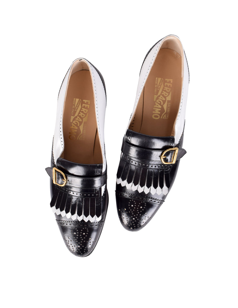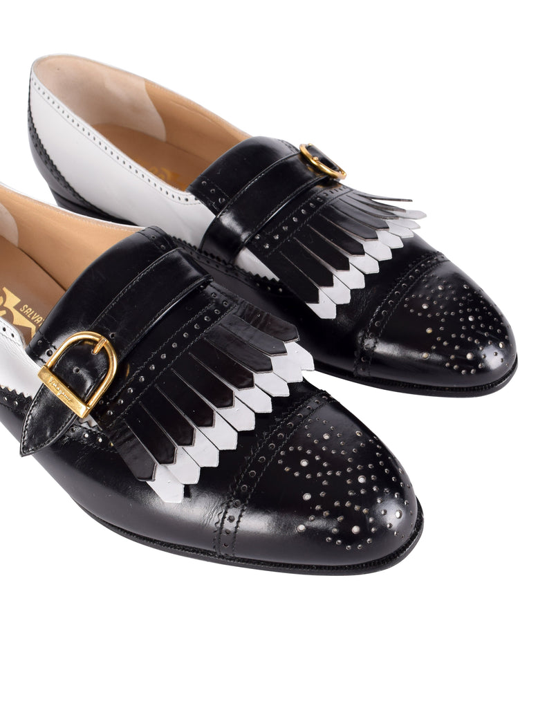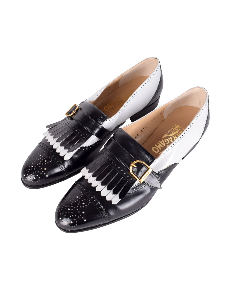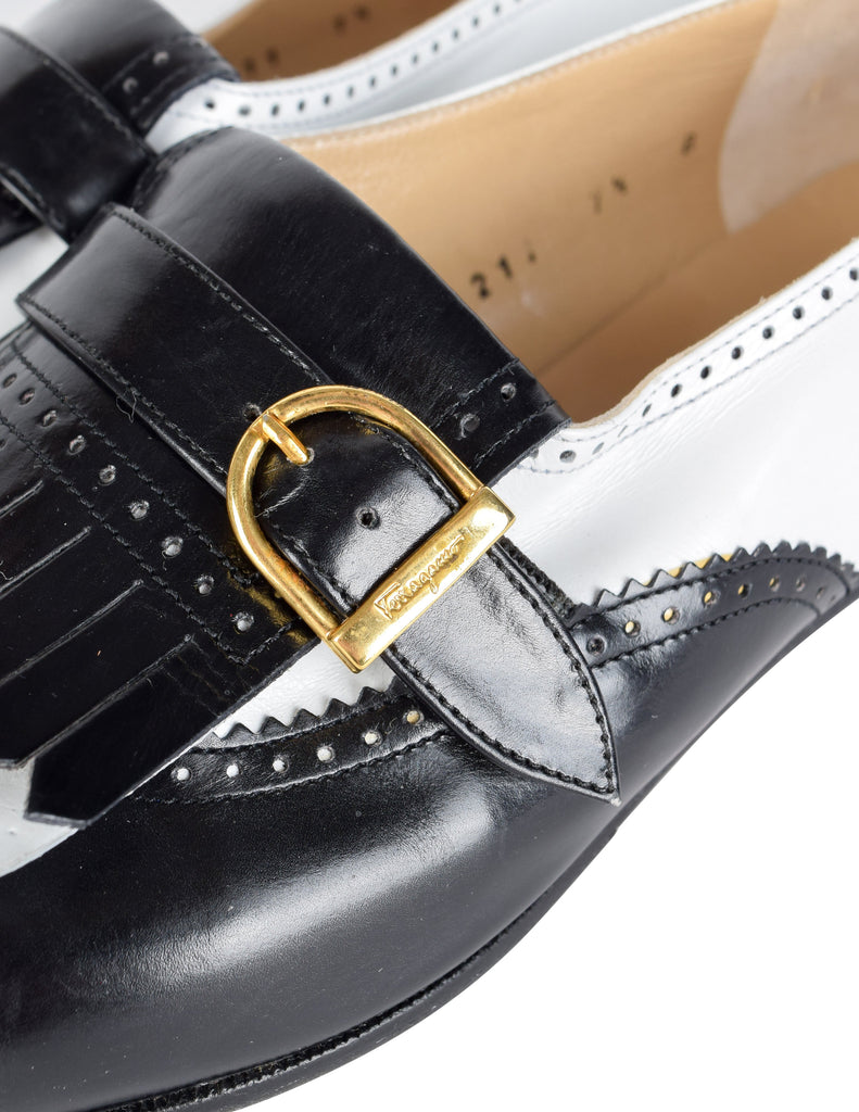 Ferragamo Vintage Black and White Leather Kiltie Buckle Shoes