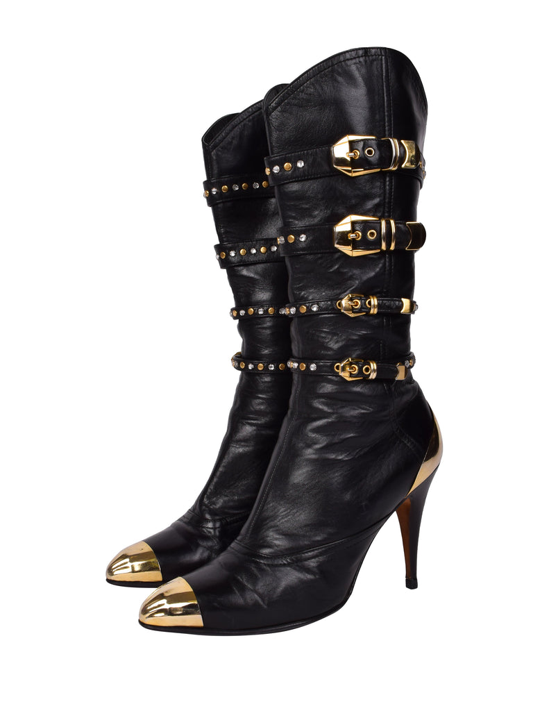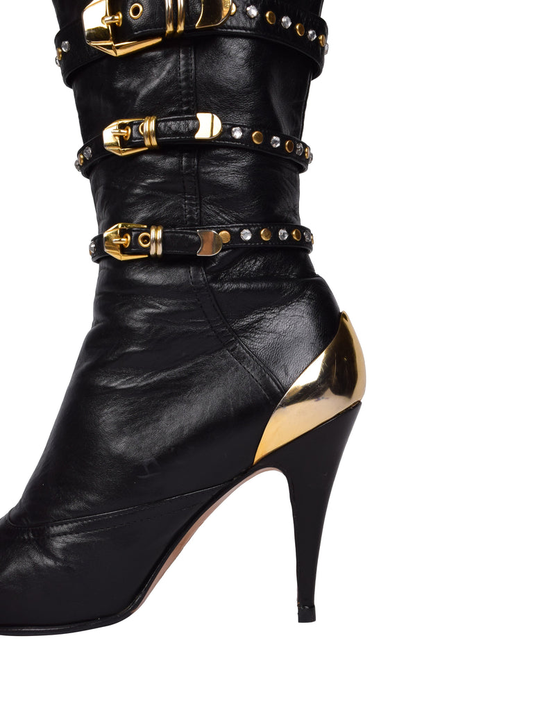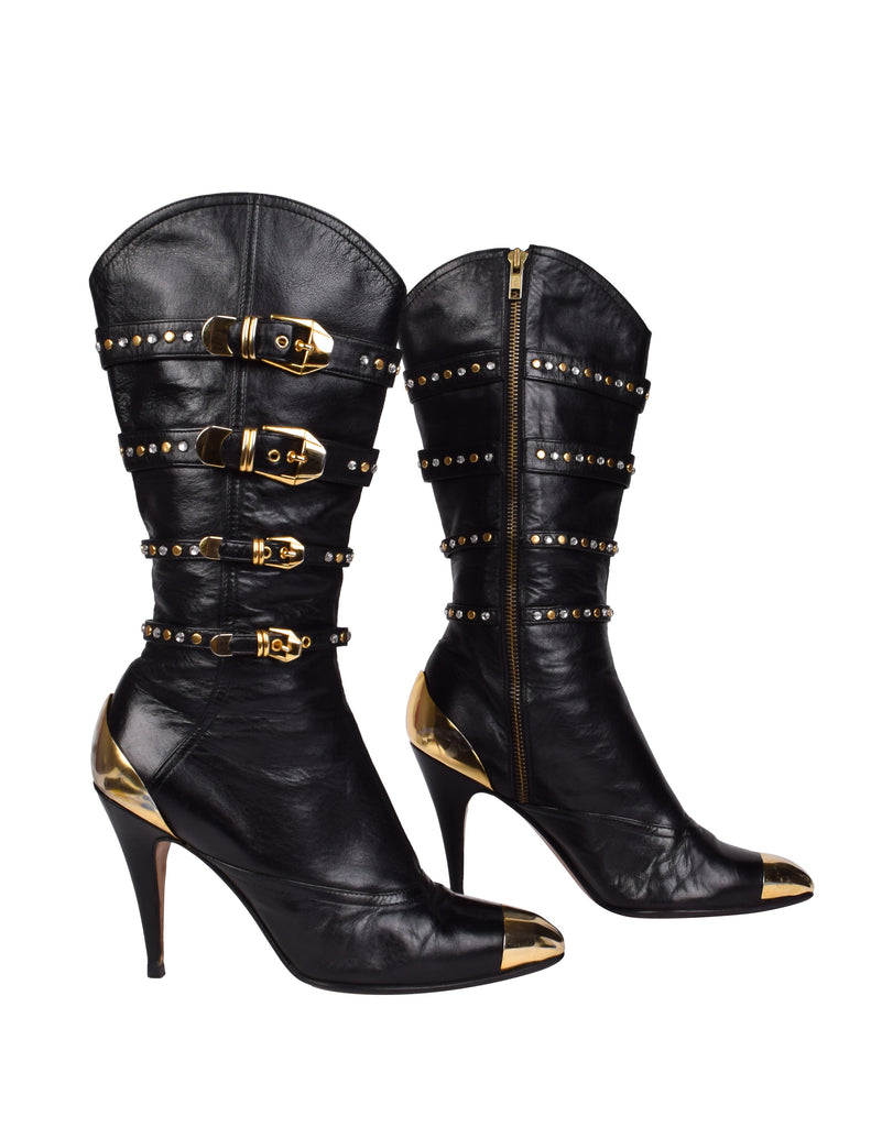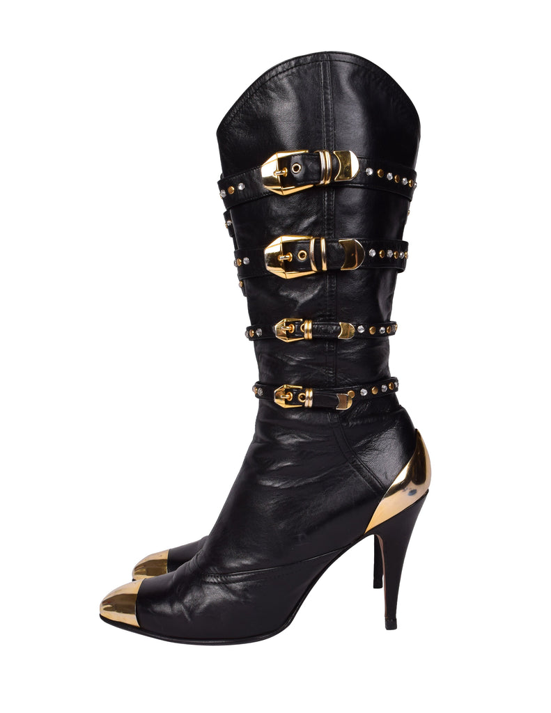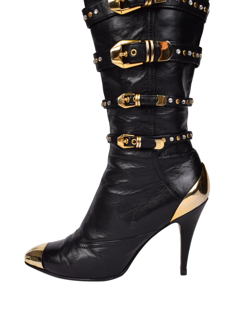 Phenomenal and ultra iconic vintage Gianni Versace boots from the legendary Fall/Winter 1992 'Miss S&M' collection, shown here documented on both the runway and in the ad campaign. Soft black leather, featuring attached straps with golden metal buckles, studs, and rhinestones throughout. Golden metal capped toe and ankle. Mid calf shaft. Zipper at inner side. Stiletto heel. Leather sole.
