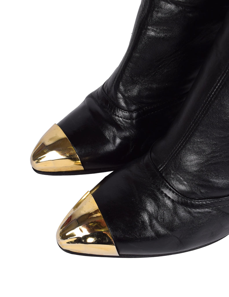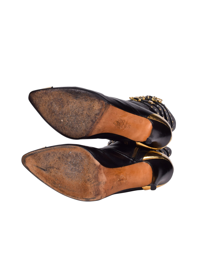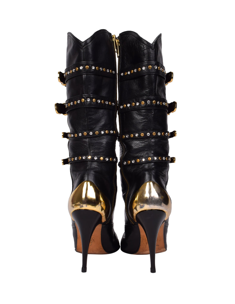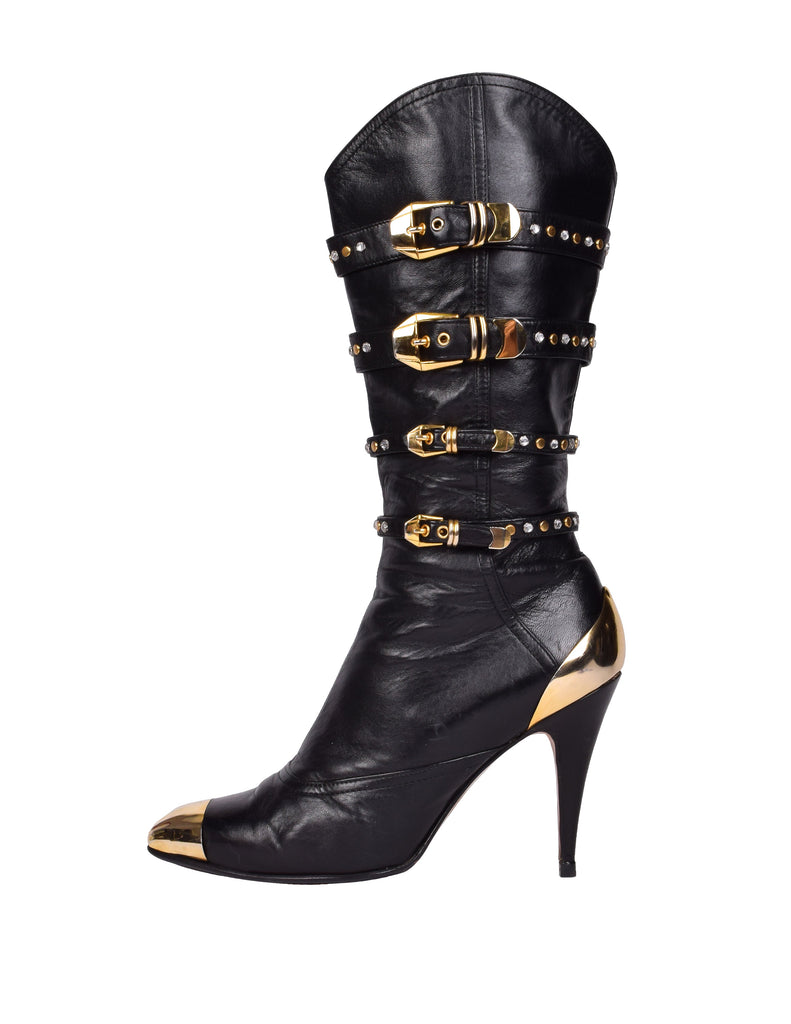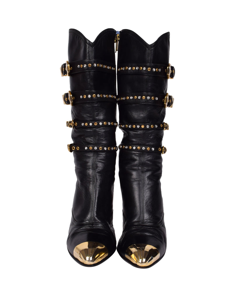 Phenomenal and ultra iconic vintage Gianni Versace boots from the legendary Fall/Winter 1992 'Miss S&M' collection, shown here documented on both the runway and in the ad campaign. Soft black leather, featuring attached straps with golden metal buckles, studs, and rhinestones throughout. Golden metal capped toe and ankle. Mid calf shaft. Zipper at inner side. Stiletto heel. Leather sole.