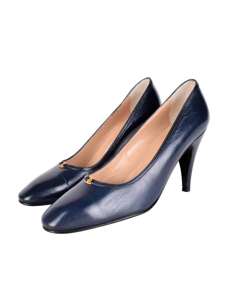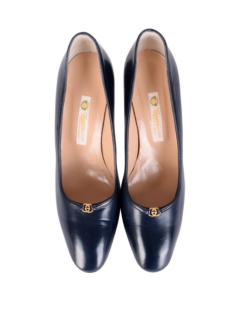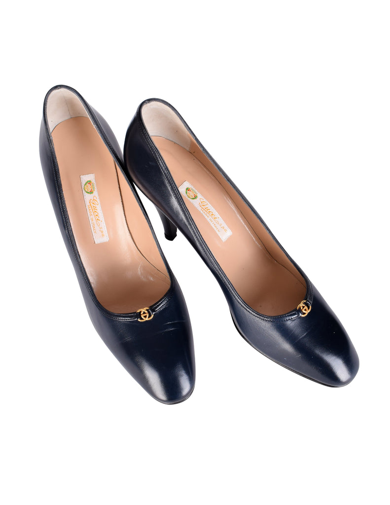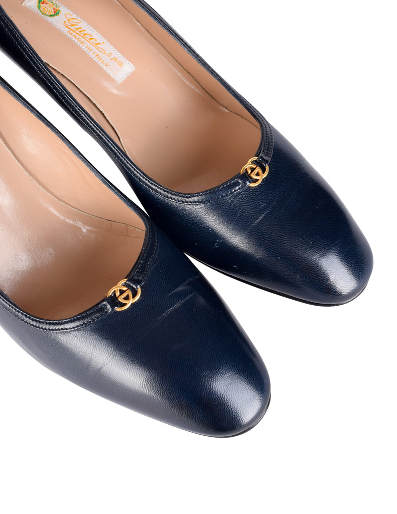 Gucci Vintage AW 1985 Navy Blue Leather Golden Logo Heels