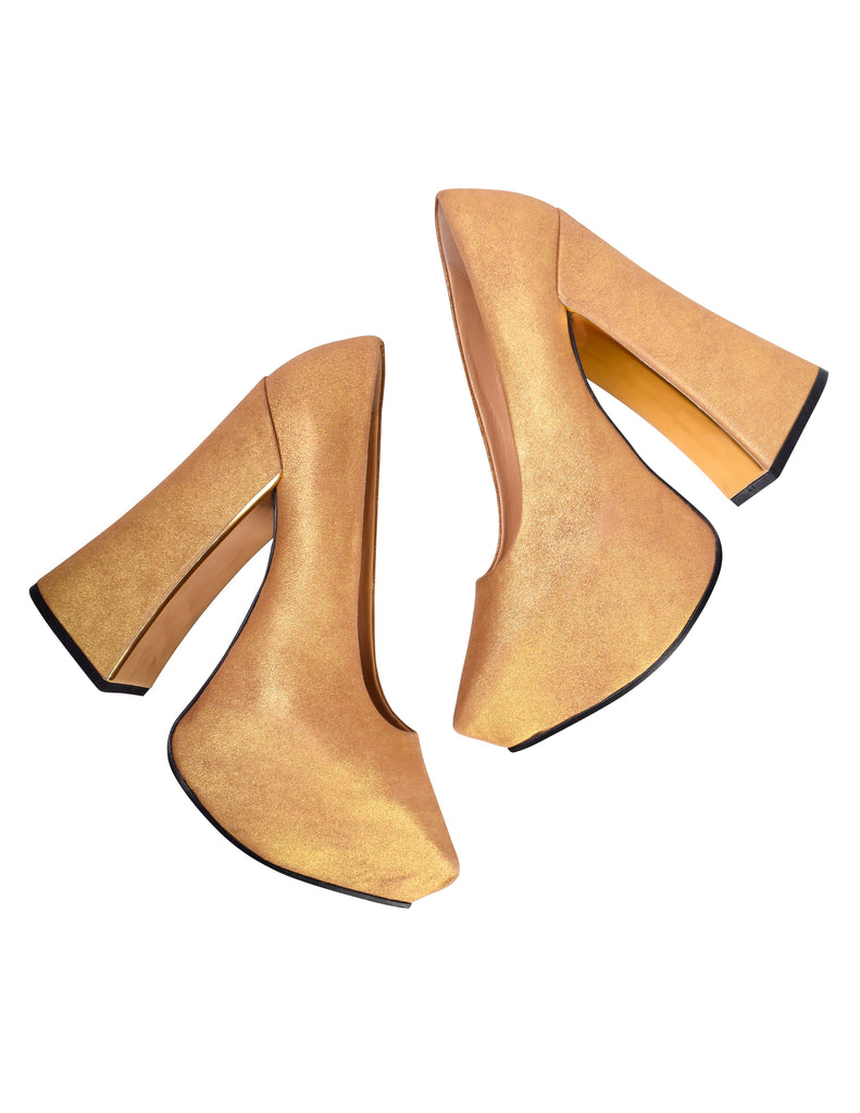 Incredible *future vintage* shoes by Vivienne Westwood. This fantastic pair of platform heels features a super chunky heel, platform front, and pointed toe. Amazing dusty gold nubuck leather/calf suede that feels almost like velvet to the touch. Mirrored, metal gold leather at the inside of the heel. Leather lined, leather soled. Comes with original box and packaging.