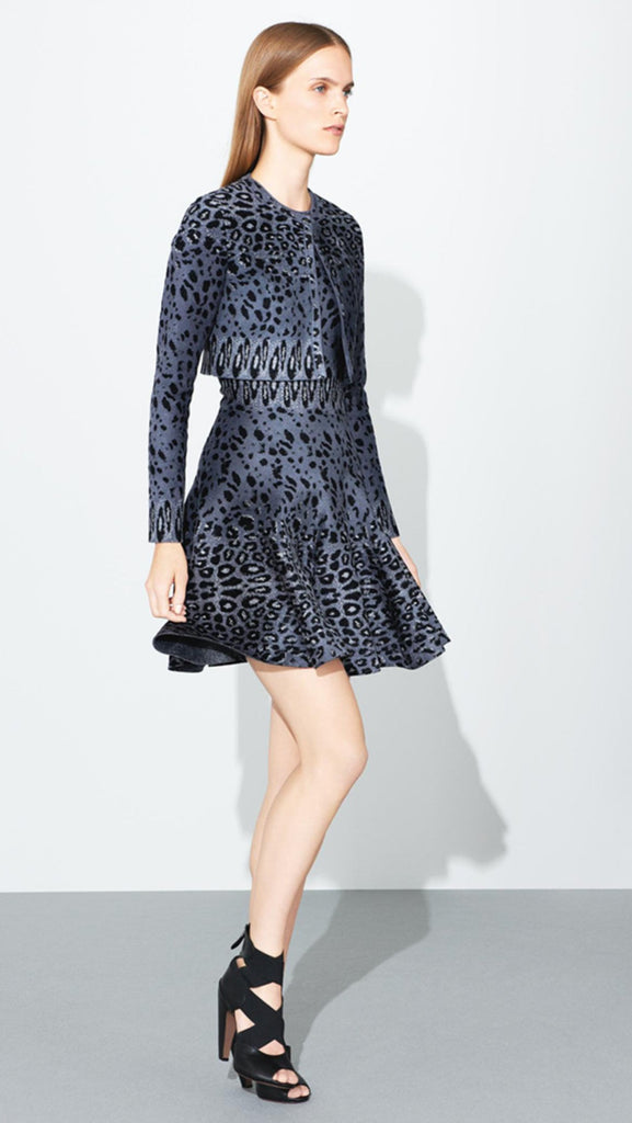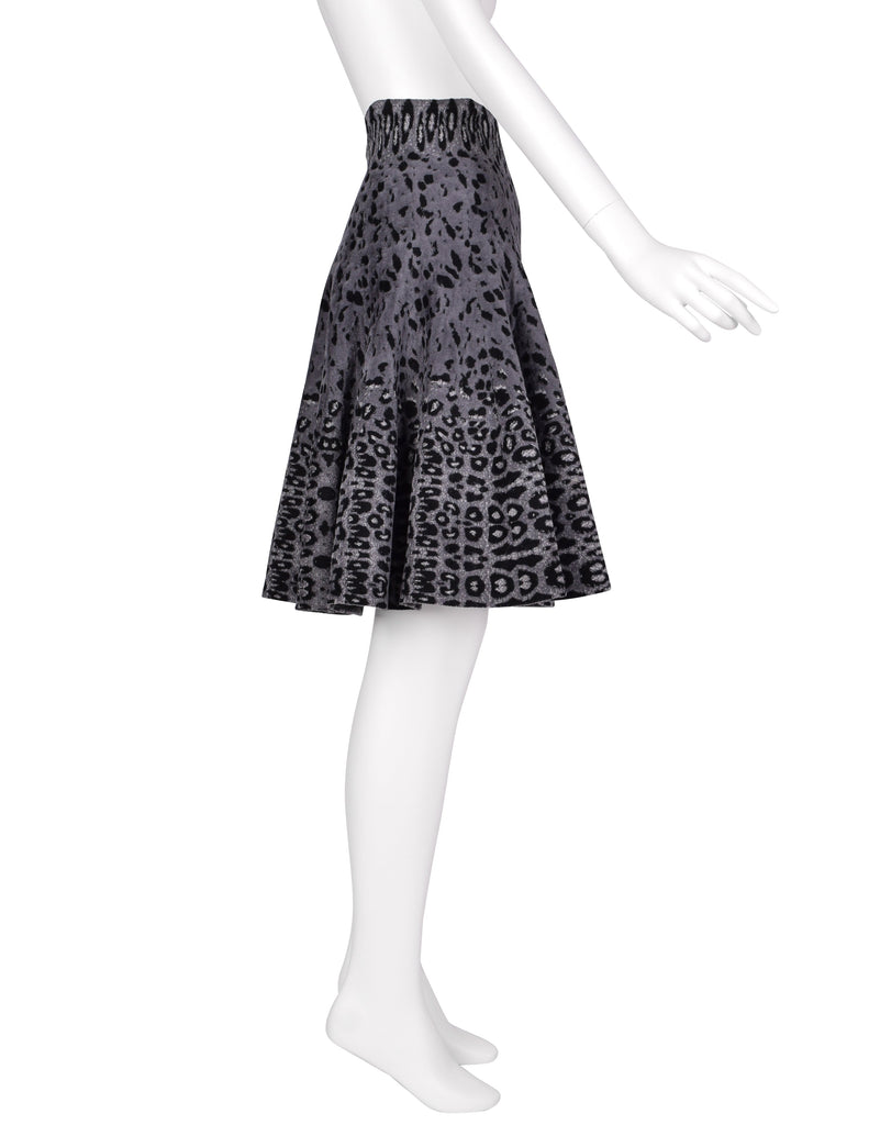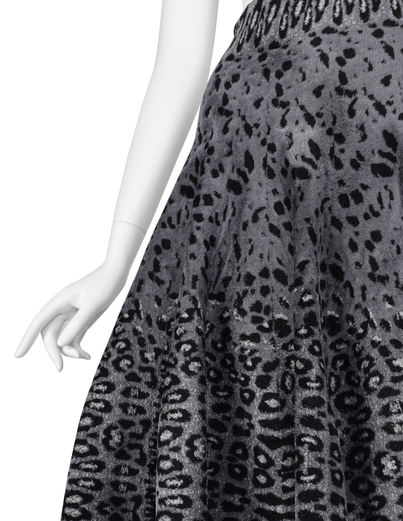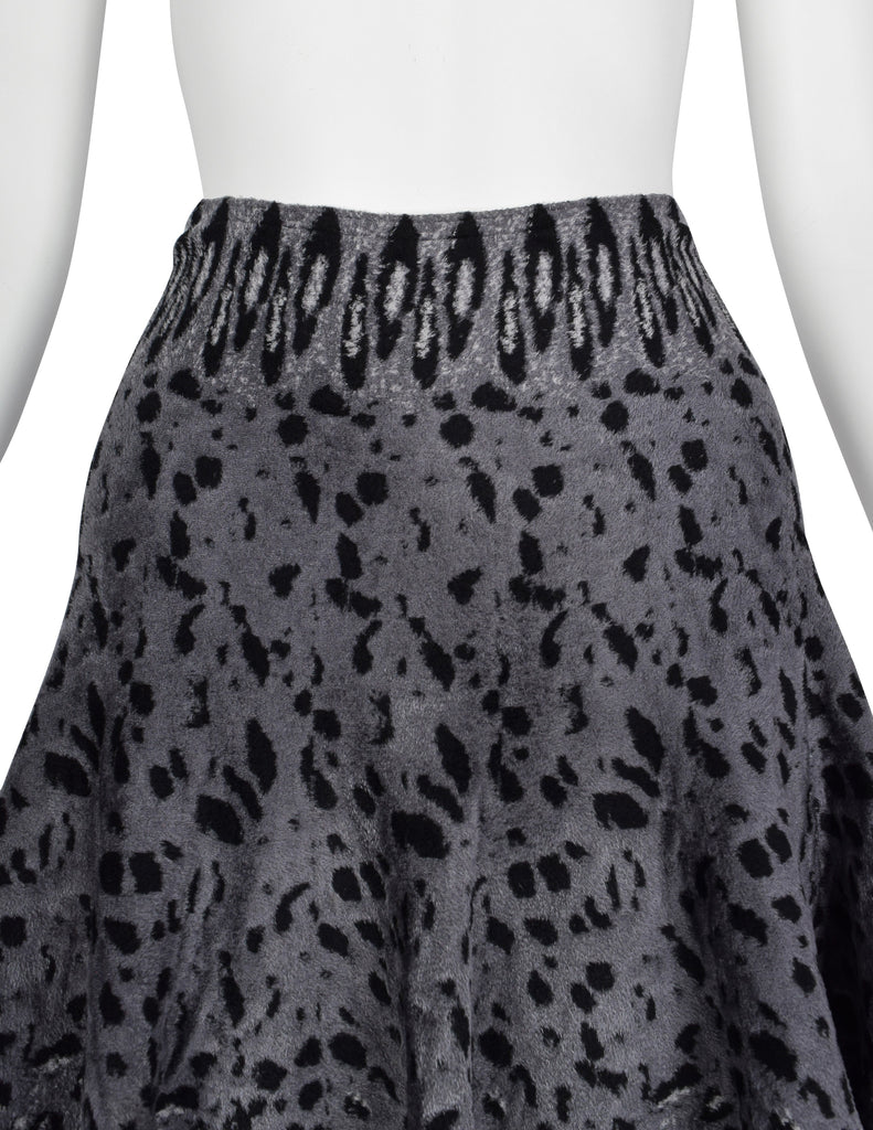 Stunning future vintage skirt by Azzedine Alaia, from Fall/Winter 2011, shown here documented within Azzedine's showroom presentation/lookbook. Incredibly soft, almost chenille-like, medium to heavy weight, stretch viscose blend knit. Leopard print in black and varying shades of grey, on a beautiful deep steel grey background. Fluted silhouette that hugs the waist and hip and flounces outward. Zip closure at back center.