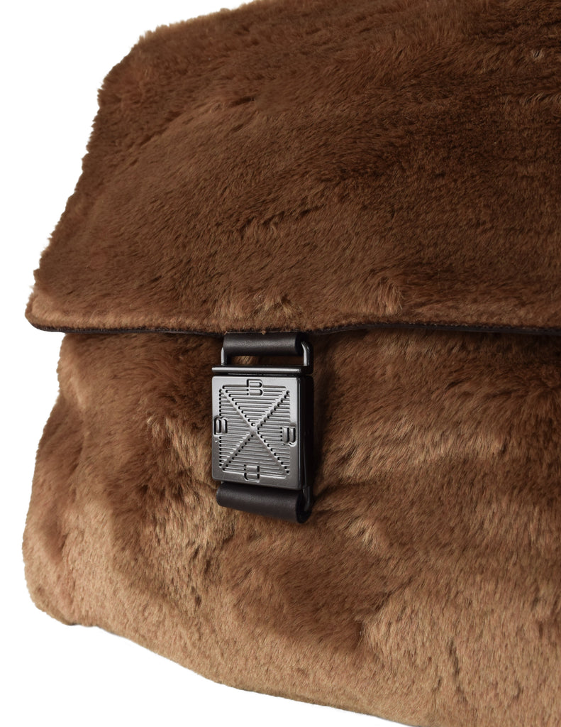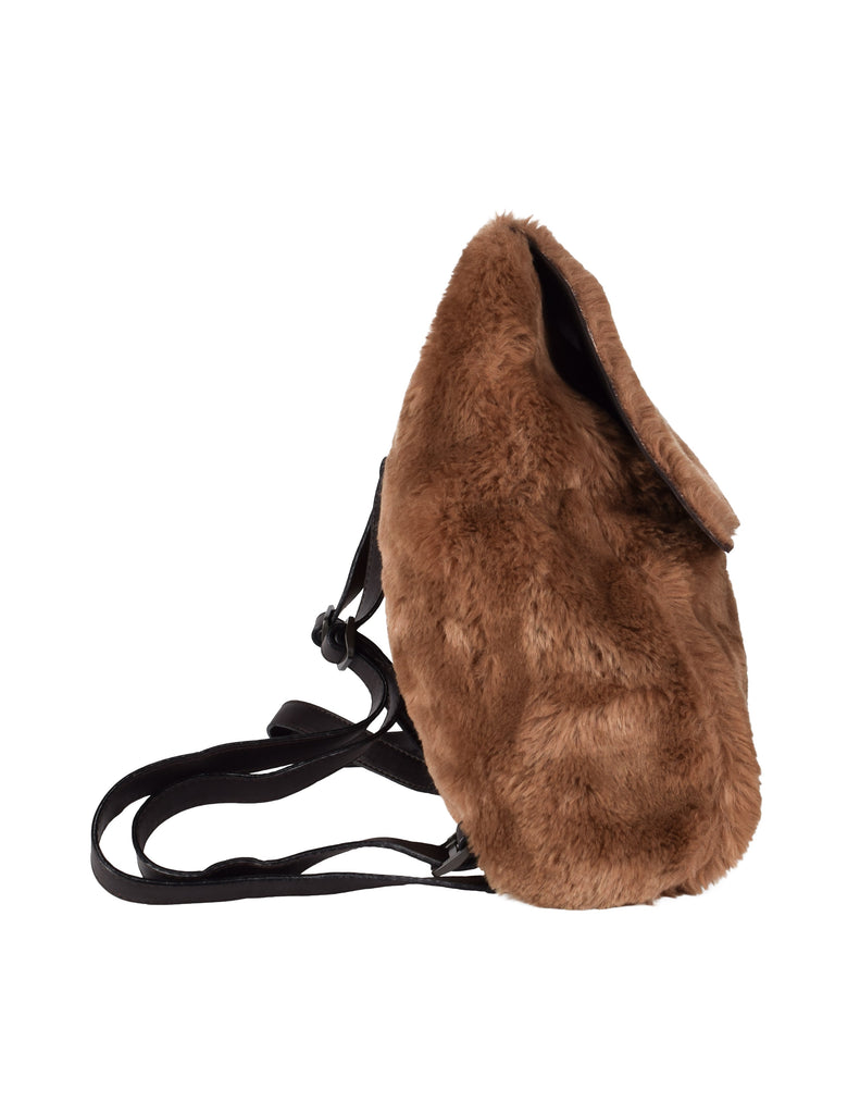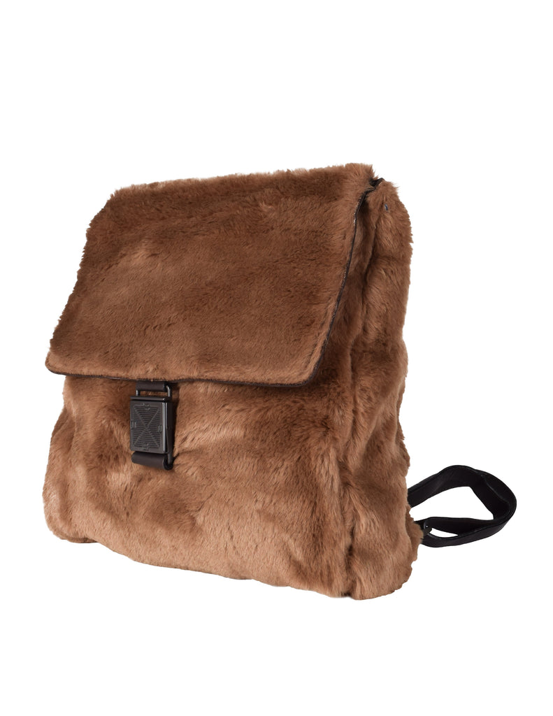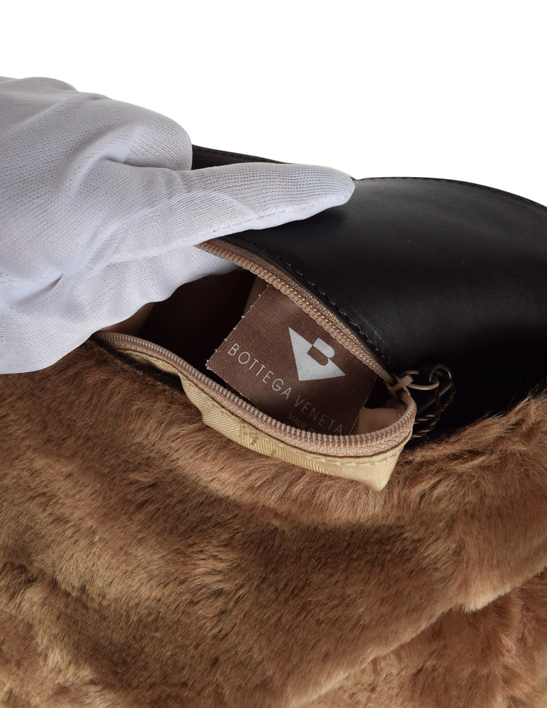 Super cool and rare vintage Bottega Veneta backpack. A gorgeous shade of chocolate brown faux fur, with brown leather accents and cross over adjustable straps. Embossed metal latch closure with BV design. Fully lined in brown leather golden monogram fabric. Fits all of your daily essentials, and then some. Comes with original branded dust bag.