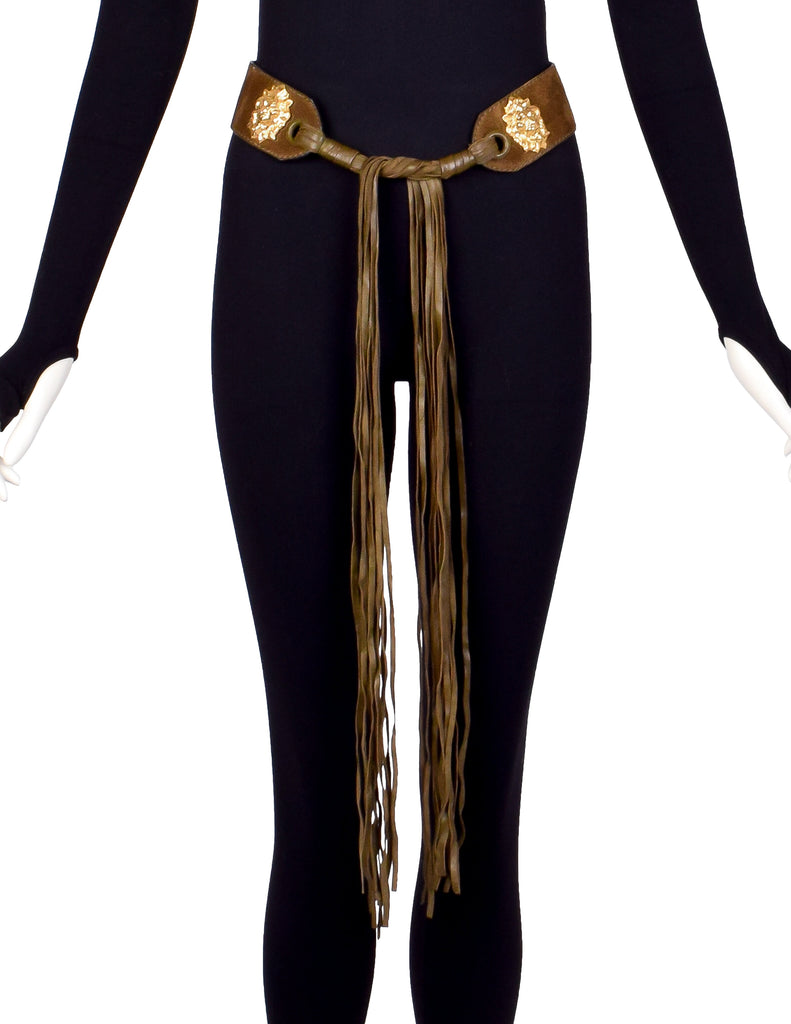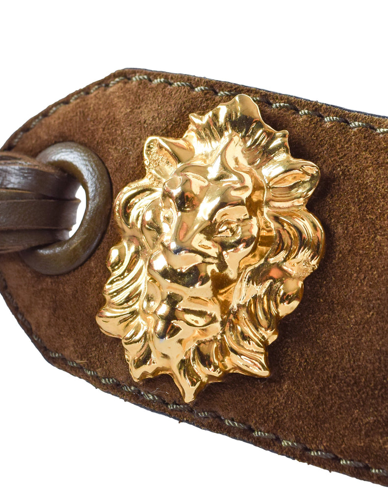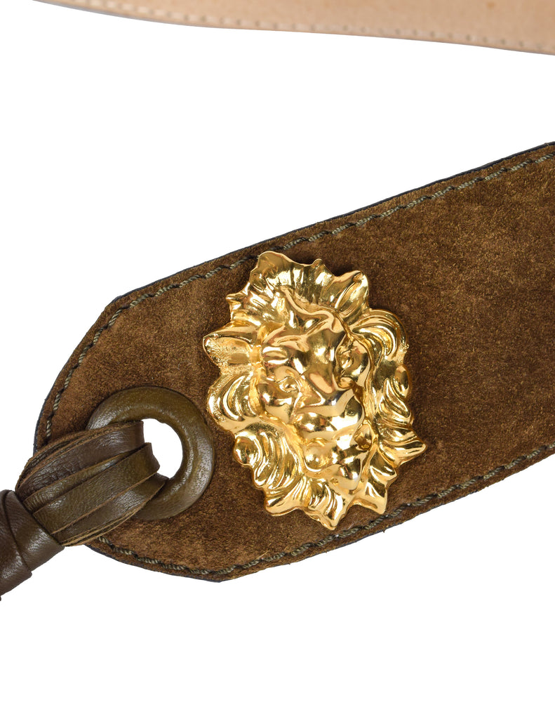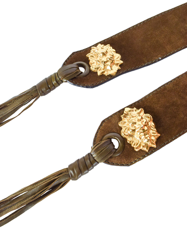 Incredible vintage Bottega Veneta belt from the early 1990s. Lovely deep olive green suede, each end adorned with a 3D gold tone lion's head. Self tying closure via the extra long fringe tassels made of the most buttery leather.