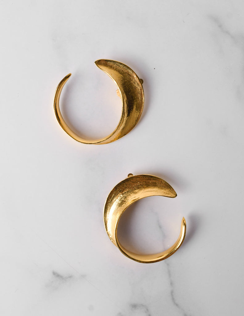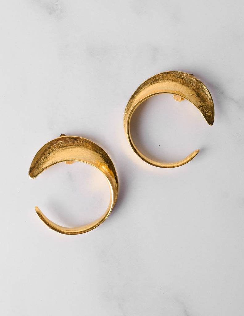 Gorgeous vintage earrings from French jewelry designers Cecille et Jeanne. Shiny gold tone hammered, tapered swirls. Oversized, statement size. Clip on. Signed.