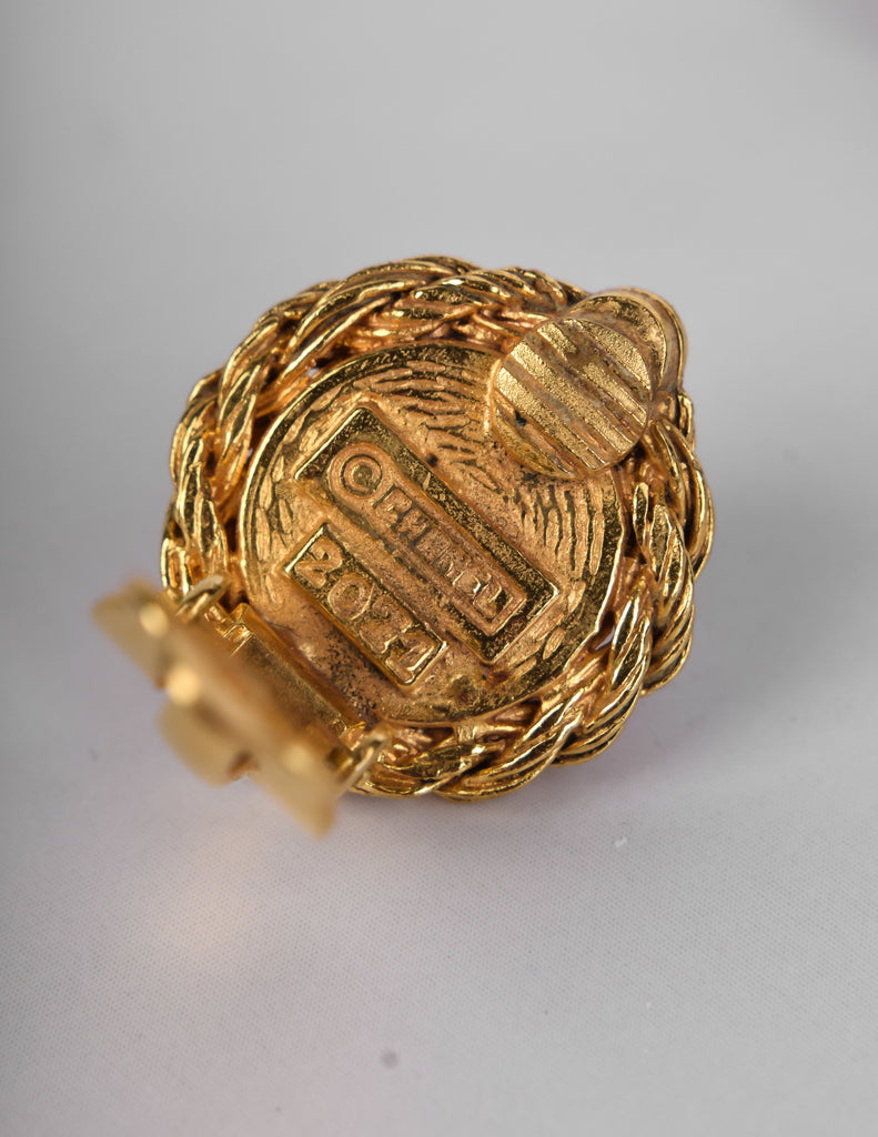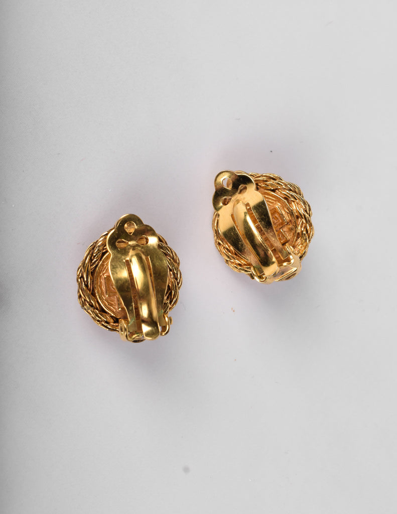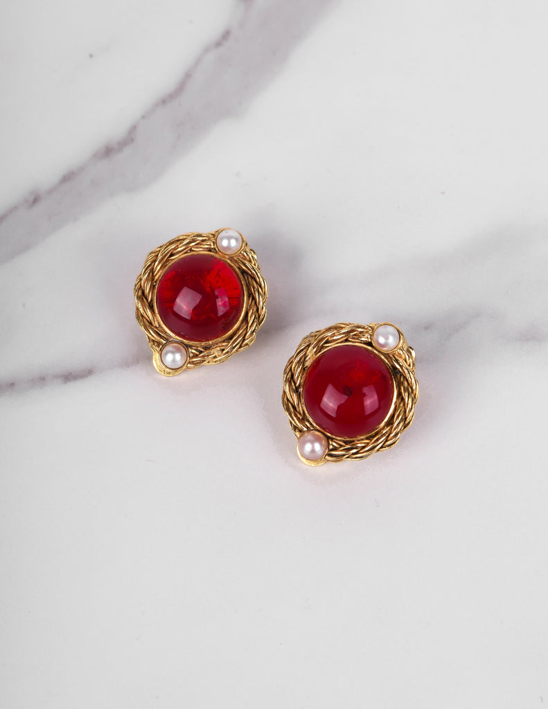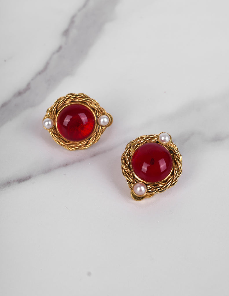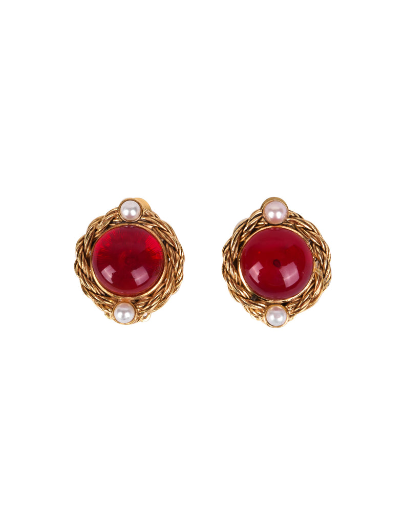 Stunning vintage Chanel earrings, circa 1971-1980 (per the marking). Golden, ornate, twisted round setting frames the red Gripoix cabochon centers. Teeny simulation seed pearl details. Signed. Clip on back.