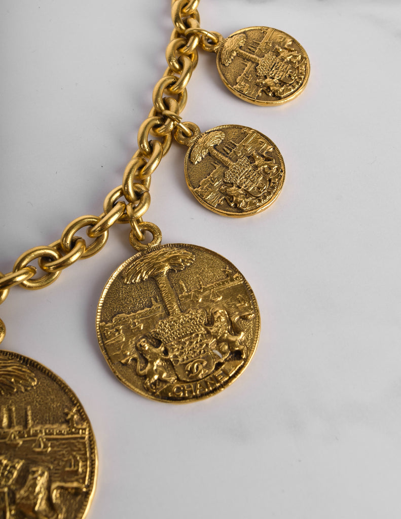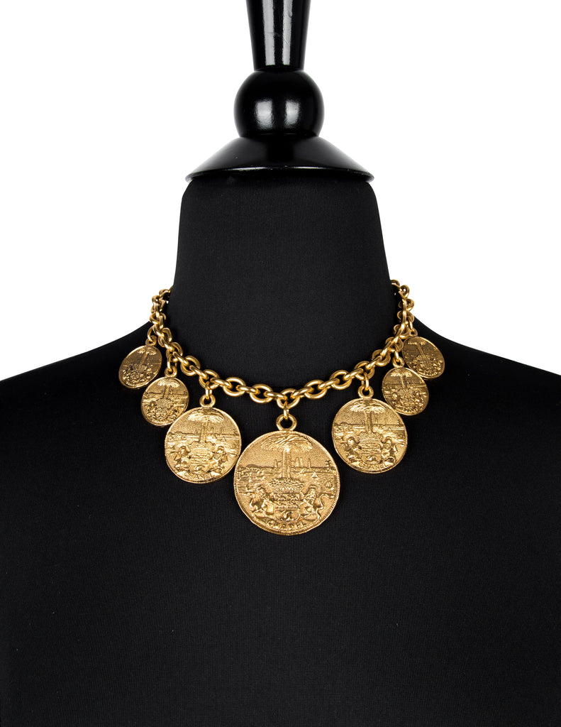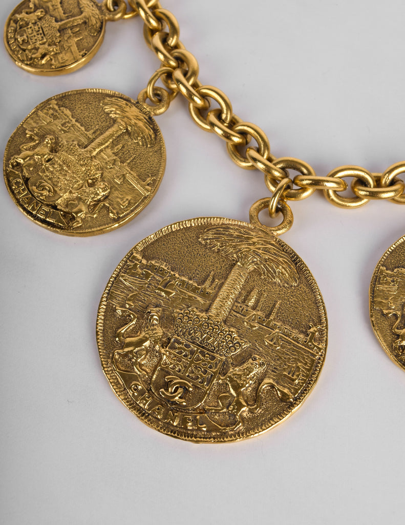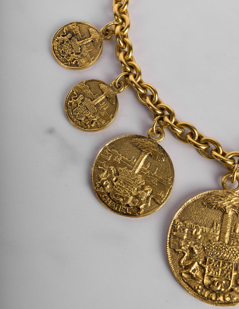 Beautiful and rare vintage Chanel necklace from the 1980s. Stunning multi medallion pendants, graduating in size toward the center, each with fixed attachment to the chain. The coins features both Chanel and a CC logo crest held by lions against a scenic backdrop. Darkened, brassy gold plated finish. Circular clasp closure with dangling Chanel cartouche at the back.