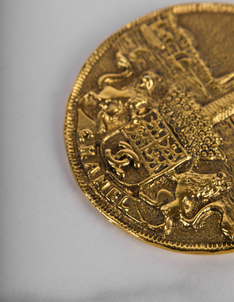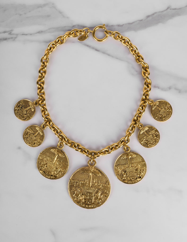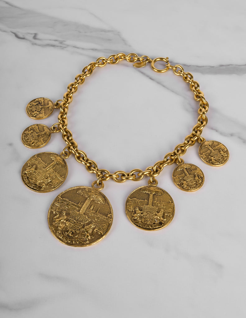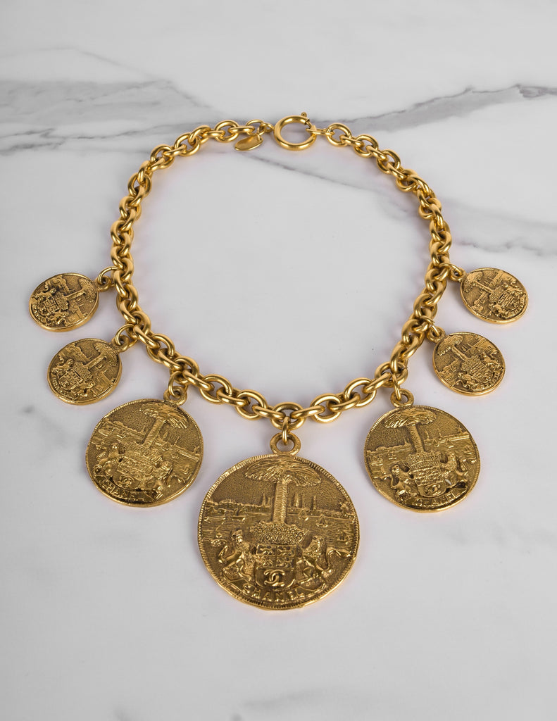 Beautiful and rare vintage Chanel necklace from the 1980s. Stunning multi medallion pendants, graduating in size toward the center, each with fixed attachment to the chain. The coins features both Chanel and a CC logo crest held by lions against a scenic backdrop. Darkened, brassy gold plated finish. Circular clasp closure with dangling Chanel cartouche at the back.