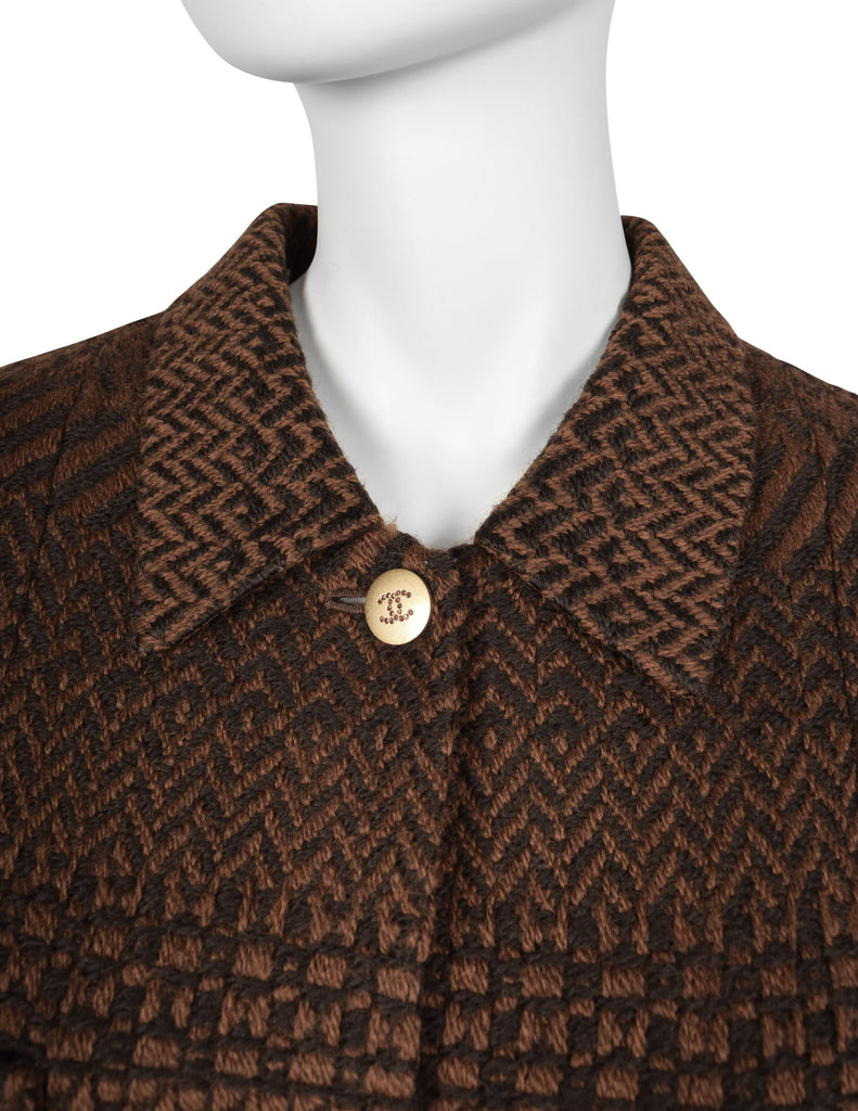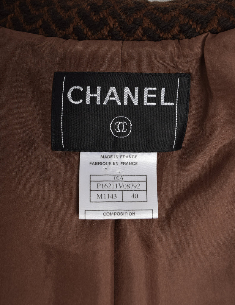 Stunning vintage Chanel jacket from Fall/Winter 2000. Geometric wool tweed in a medium and dark brown tonal colorway. Button up closure at front with brassy, brushed light gold buttons featuring CC logos in orange rhinestones. Four patch pockets at front. Brown leather belted waist with matching metal CHANEL etched buckle. Fully lined in brown silk. Signature chain at inner hem. Gorgeous!