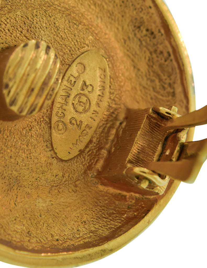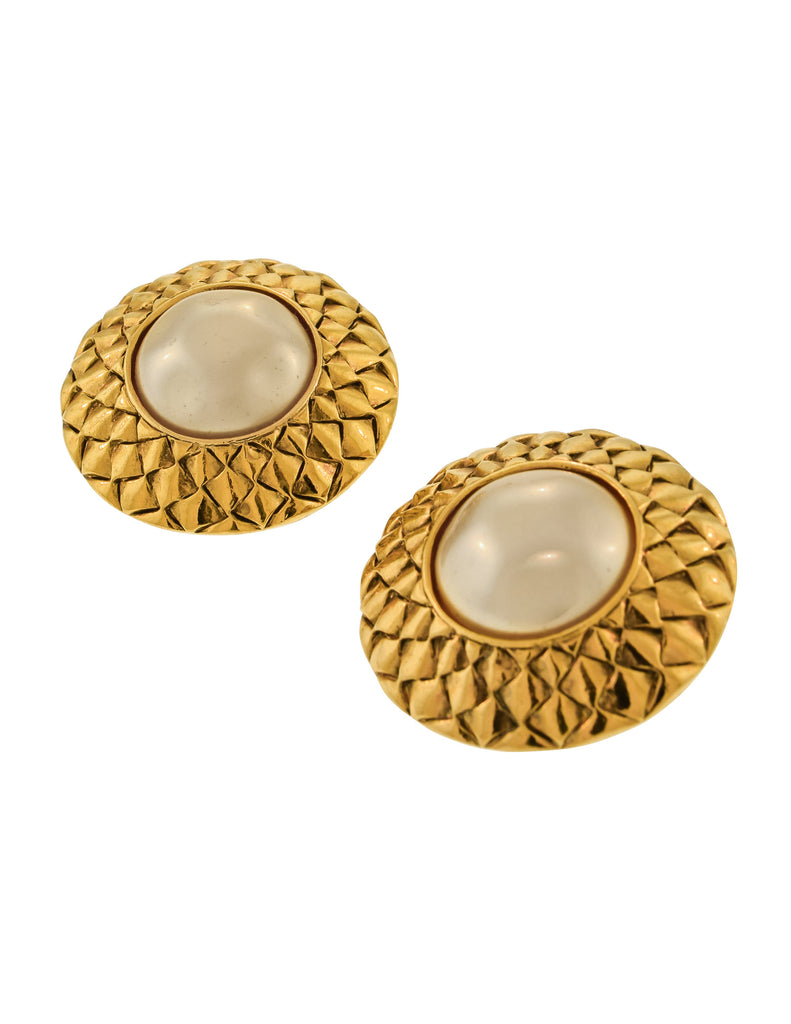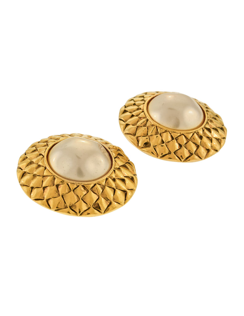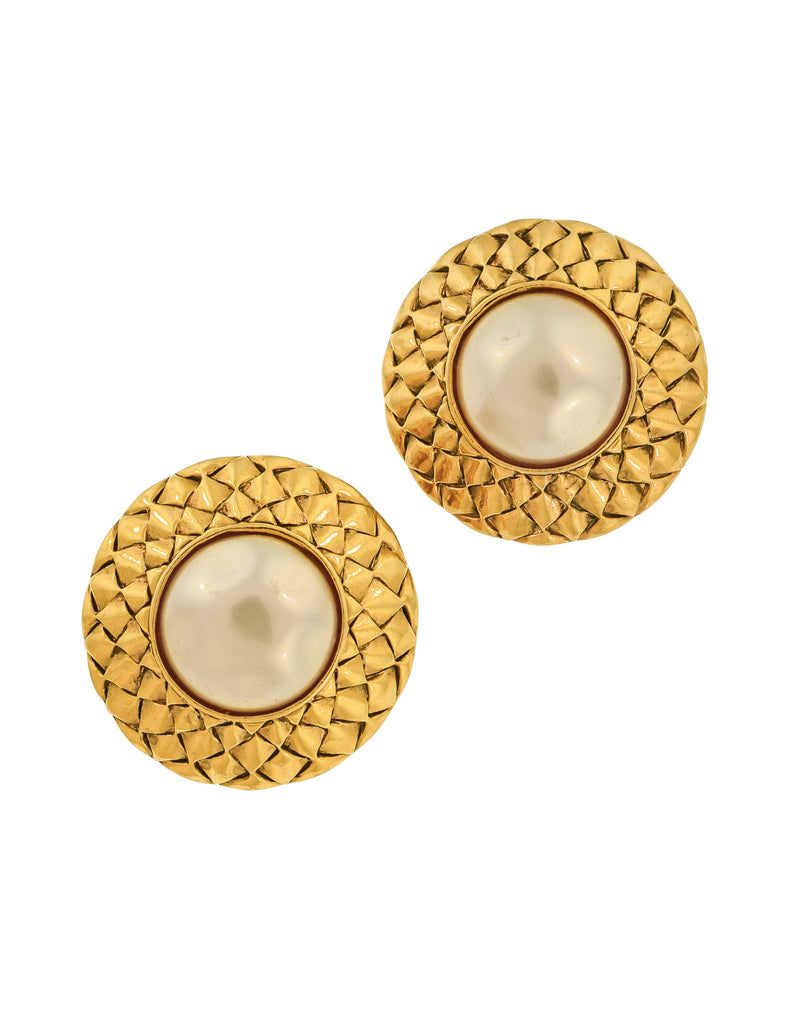 Lovely, classic vintage Chanel earrings from the late 1980s, collection 23. Gold plated basket-weave style relief that wraps and frames the faux baroque pearl center. Chanel cartouche at backside. Clip on.