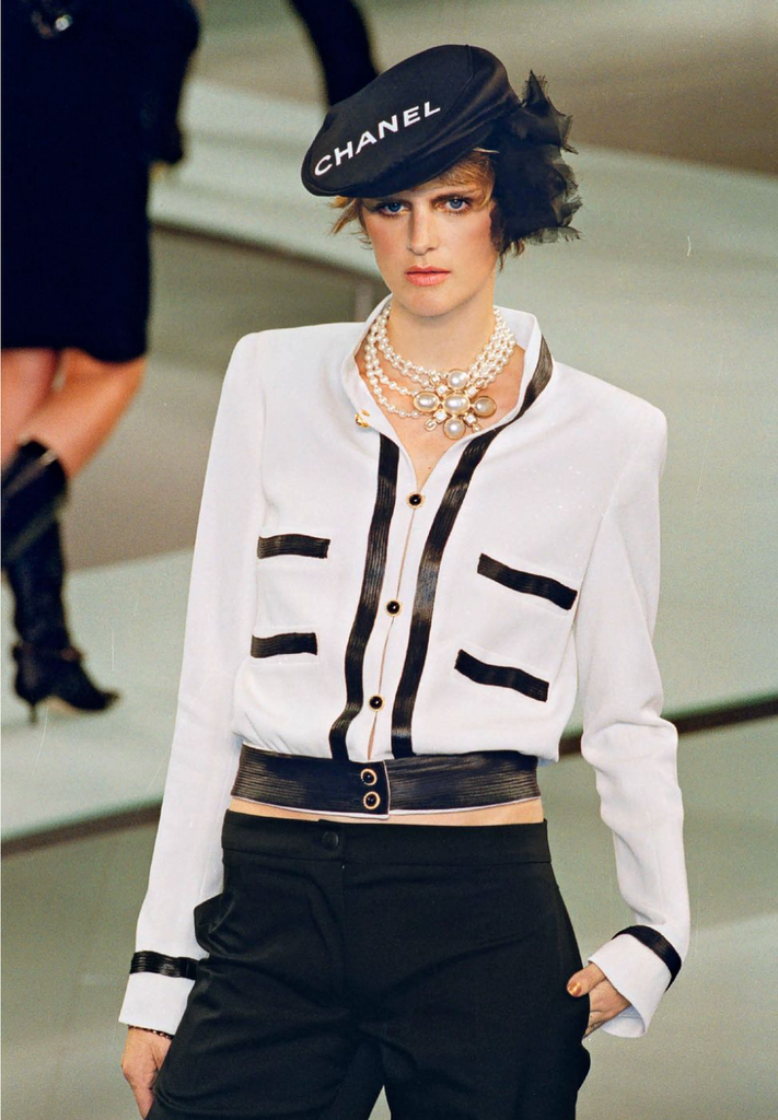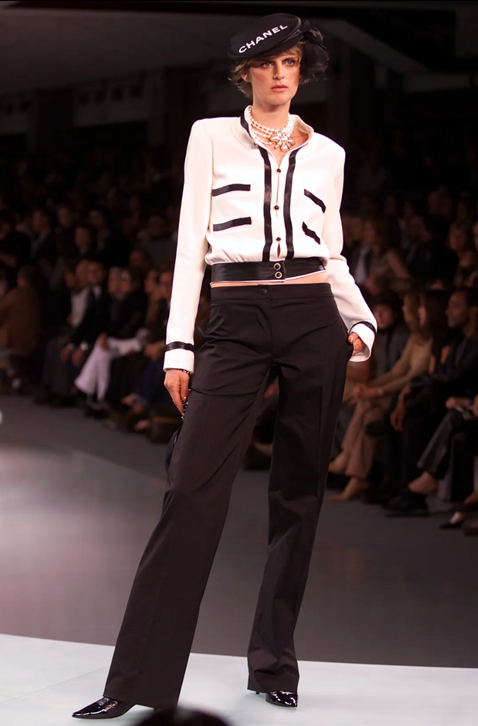 Stunning vintage Chanel jacket from Spring/Summer 2002, shown here documented on the runway and in the ad campaign, modeled by Stella Tennant. Creamy wool gabardine, with tight pleated black silk trimmings throughout. Decorative pocket slits at front. Brushed, brassy golden CC logo near cuff. Interesting cufflink-like button closure at front center featuring faux seed pearls framing glass cabochons in brushed, nrassy golden settings. Cropped silhouette. Fully lined in Camellia and CC logo jacquard silk.
