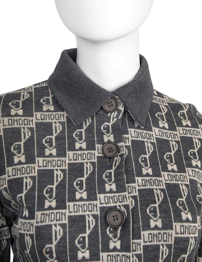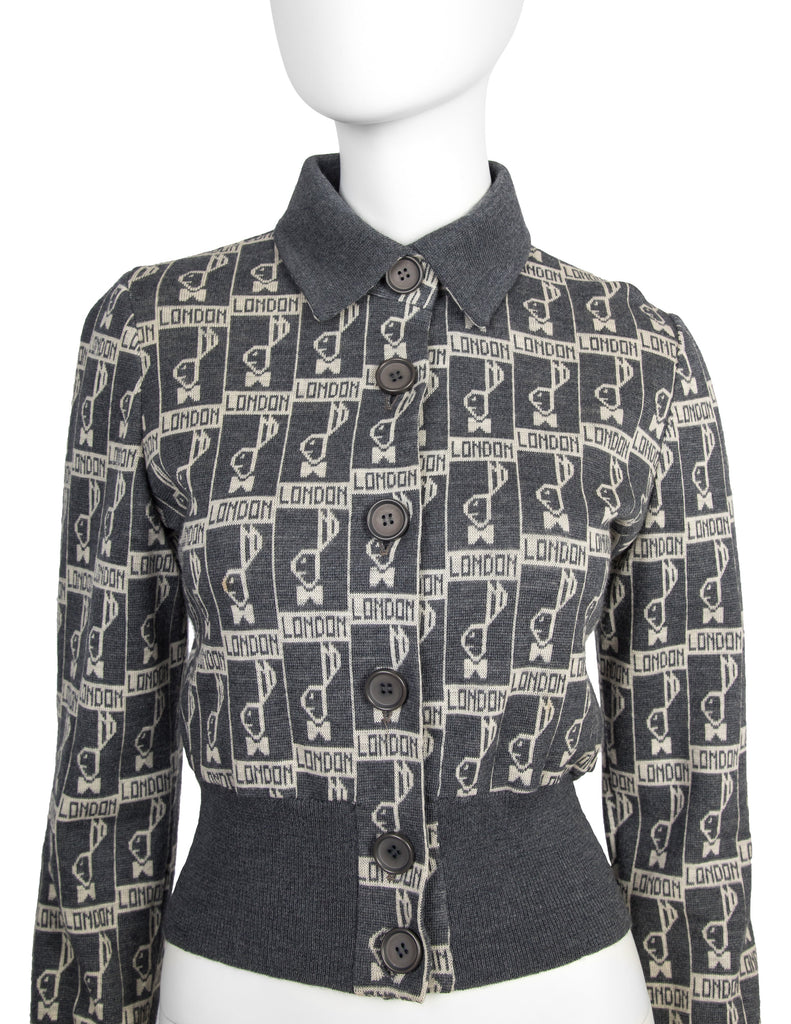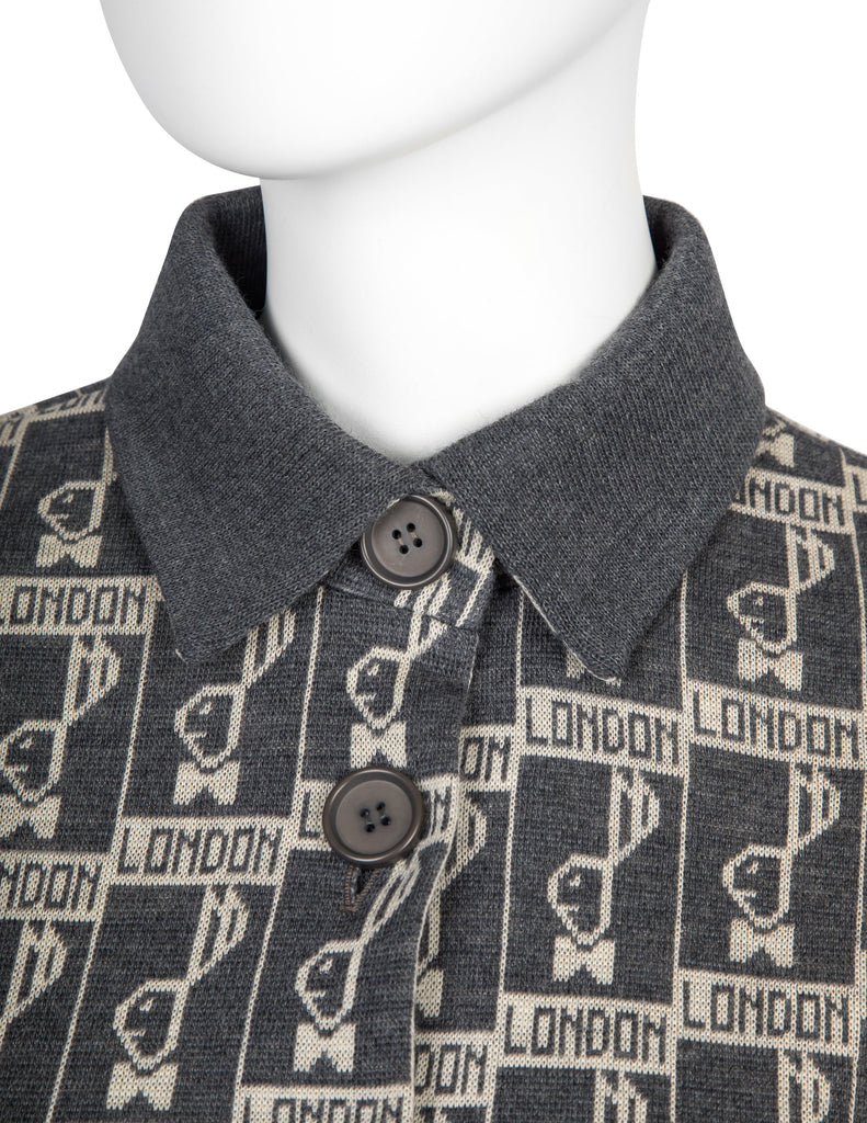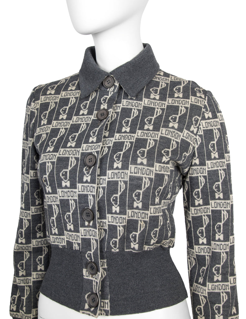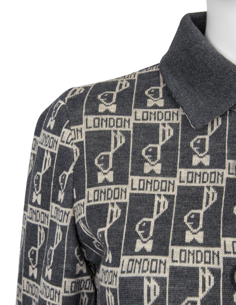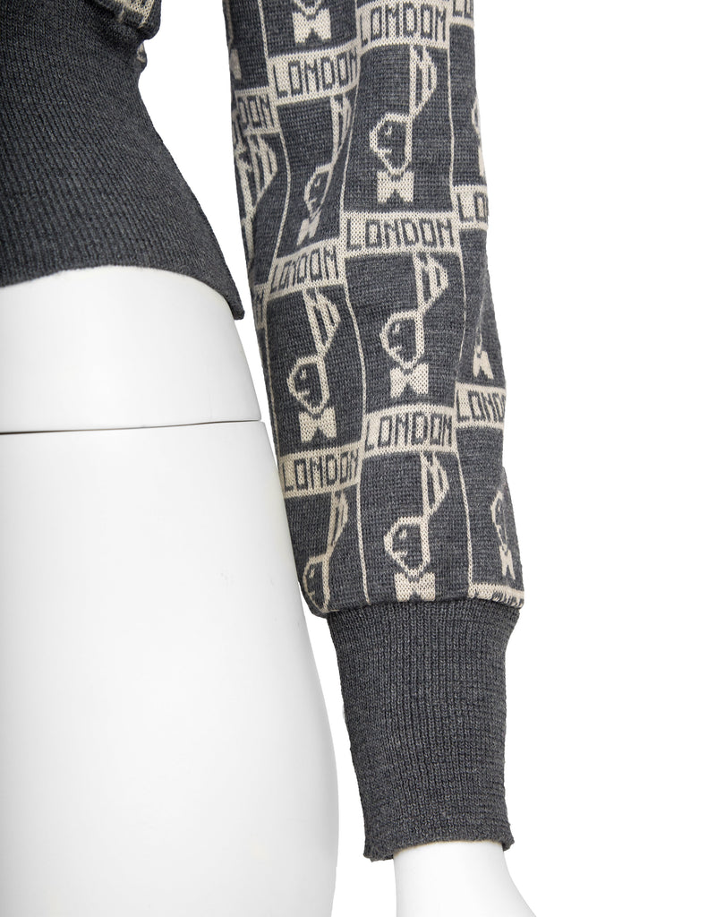 - Charcoal grey knit wool sweater with and ivory novelty intarsia comprised of a Playboy-eque bunny and London throughout.