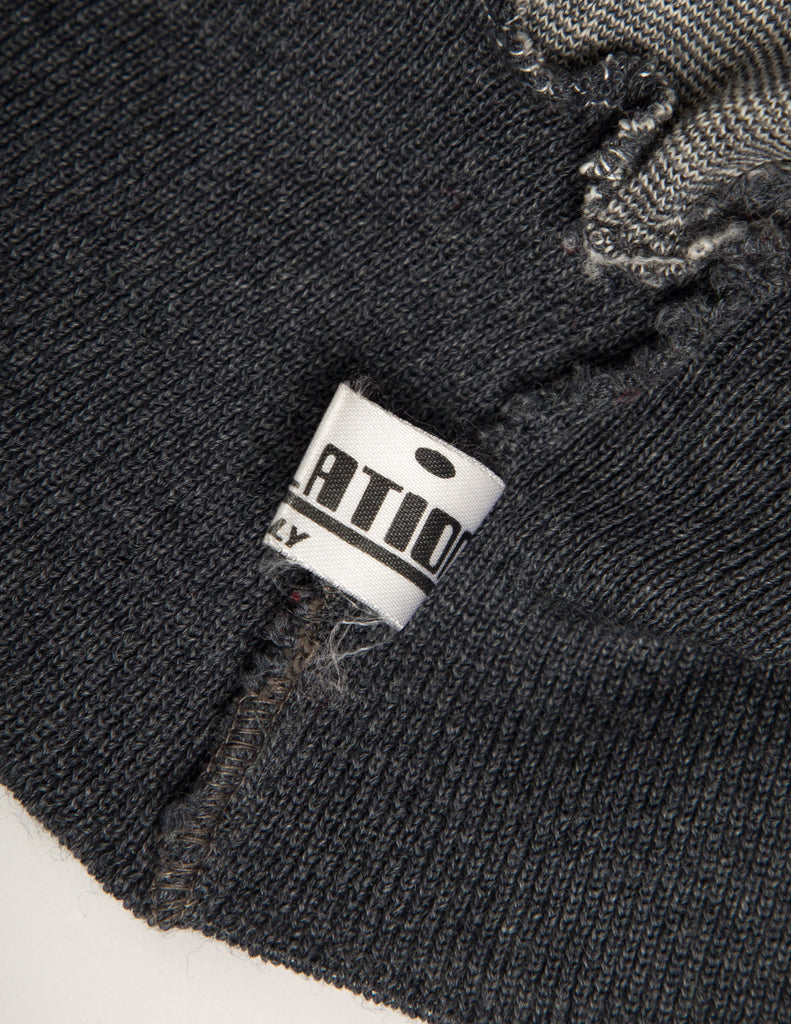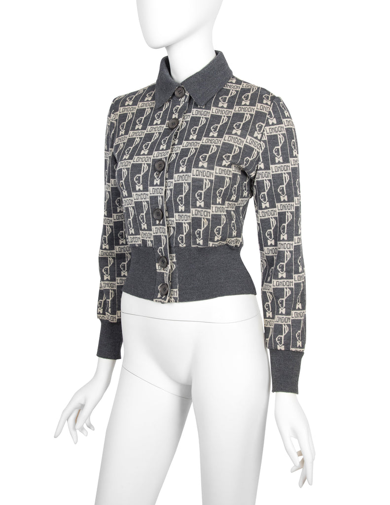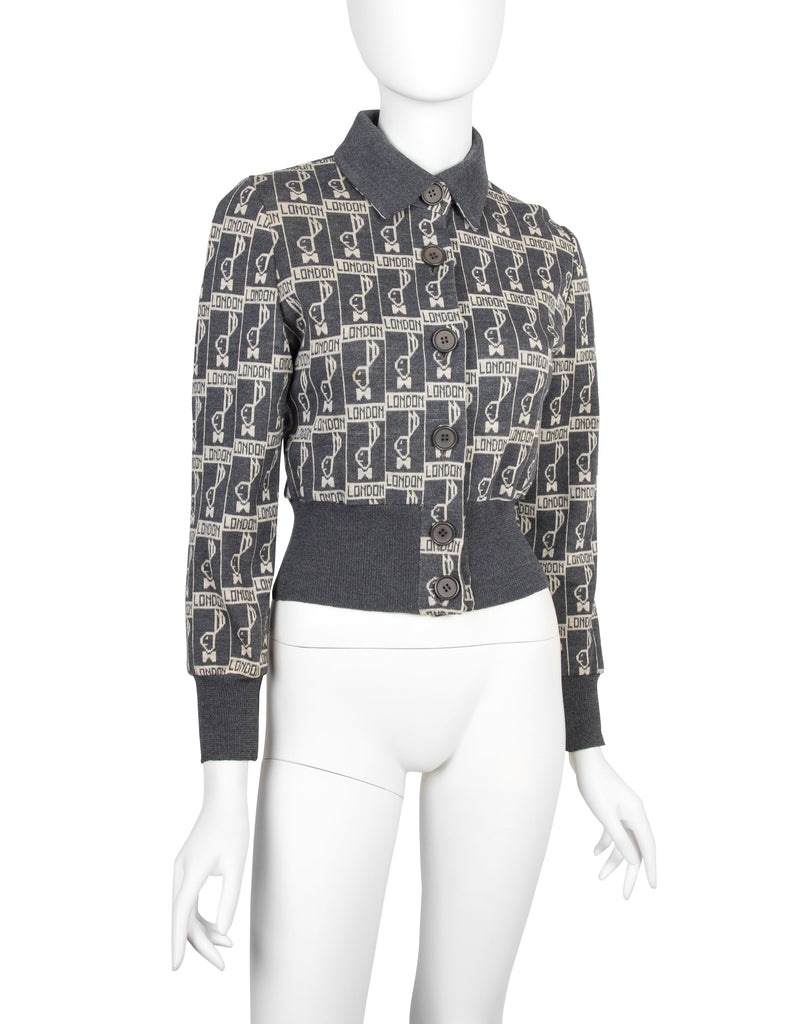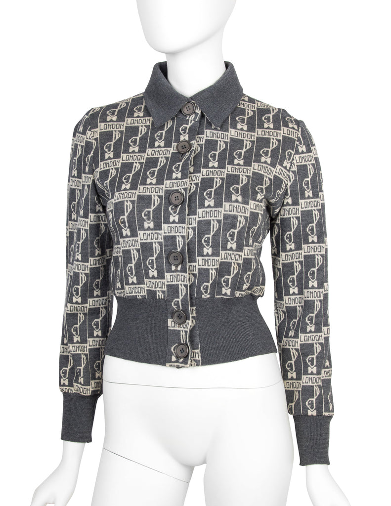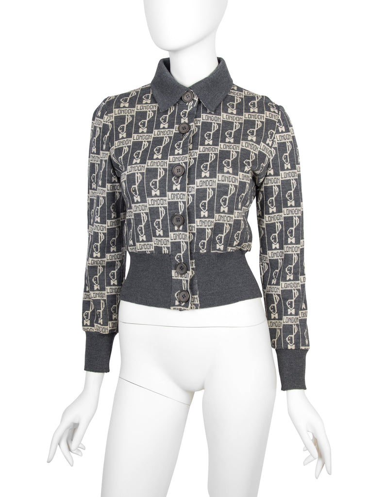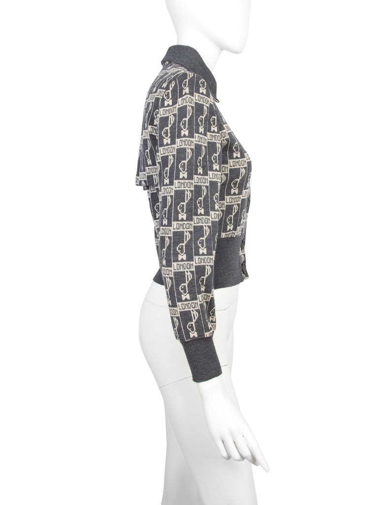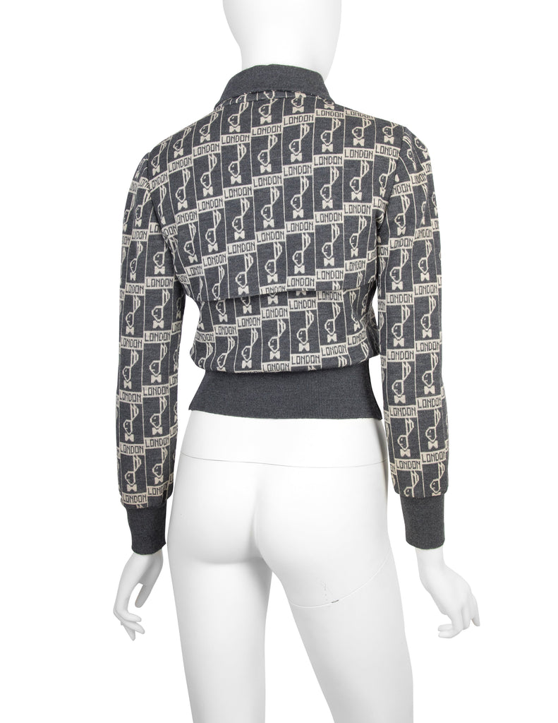 - Charcoal grey knit wool sweater with and ivory novelty intarsia comprised of a Playboy-eque bunny and London throughout.