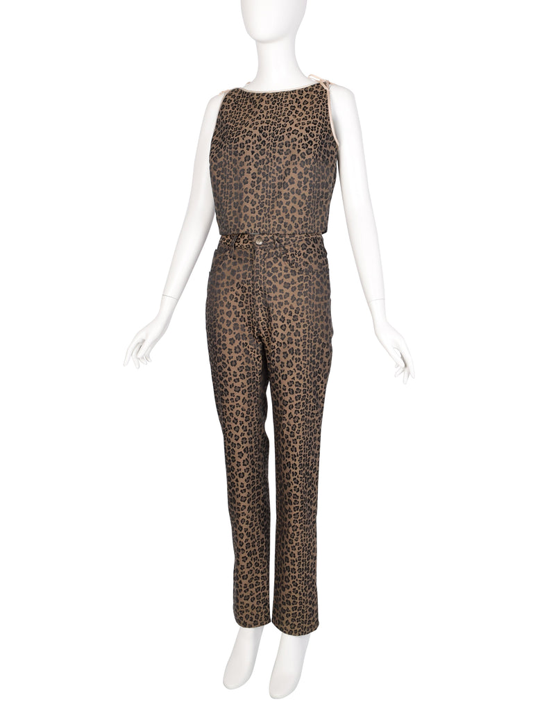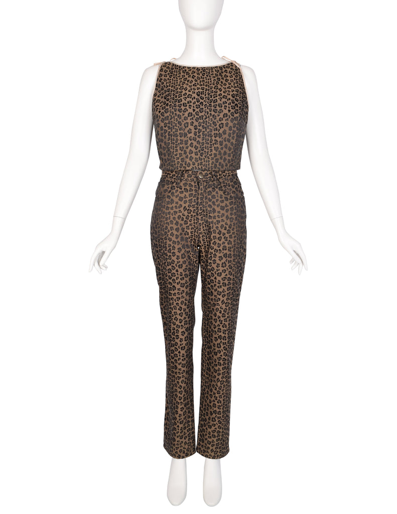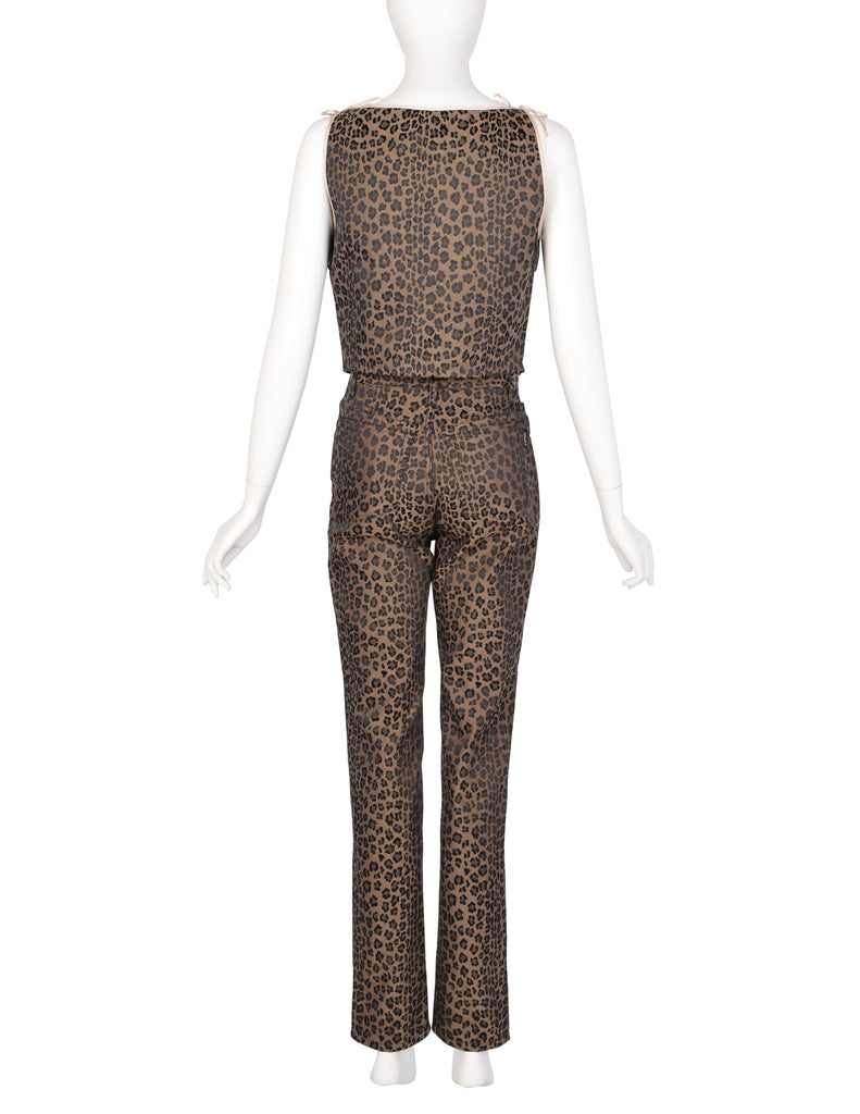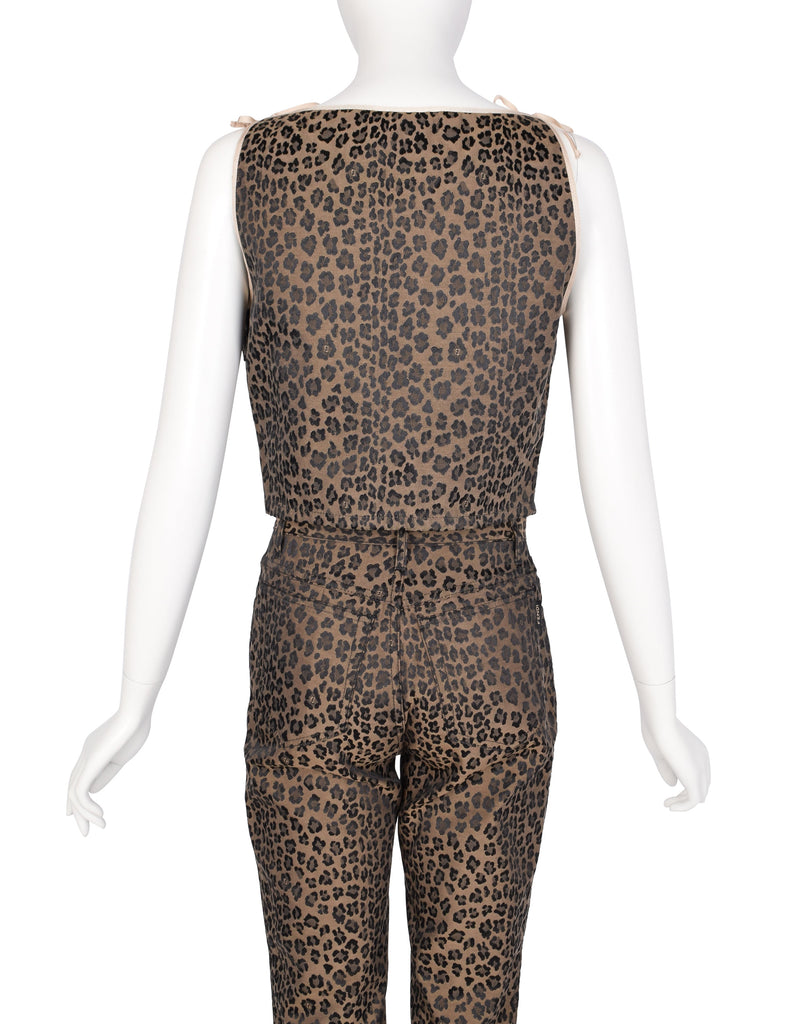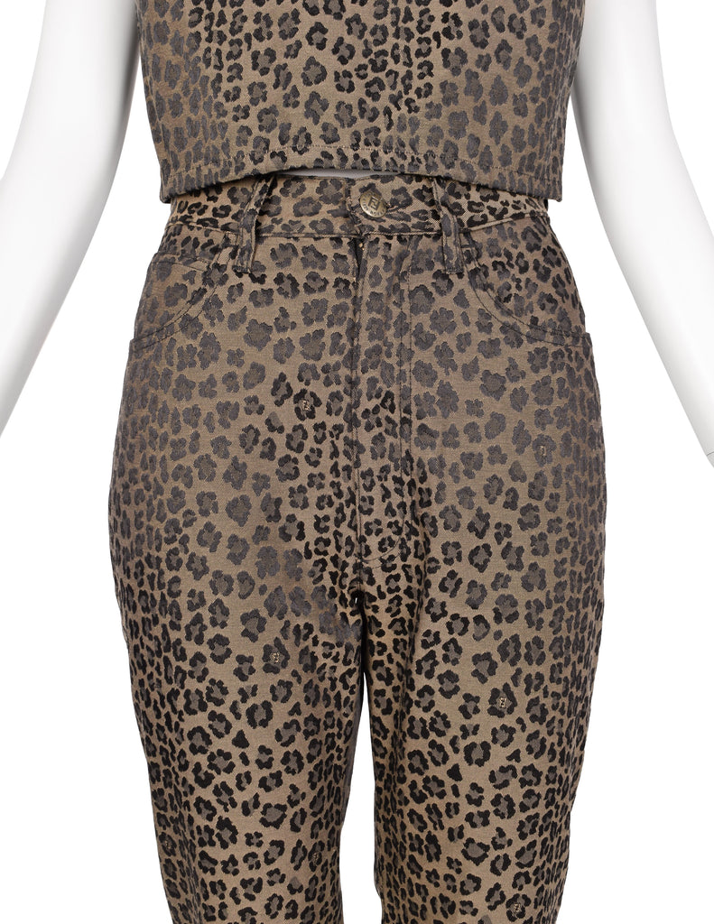 Magical vintage Fendi ensemble from the early 1990s. Remarkable leopard print in shades of brown and black with mini FF logos throughout. Denim styled pants with typical pockets and zip fly closure, high waist. Cutest cropped shell top trimmed in beige grosgrain ribbon that extends into straps that self tie at each shoulder, zip closure at side. Medium-weight and suitable for any season. Wear them together or on their own to maximize their potential within your wardrobe.