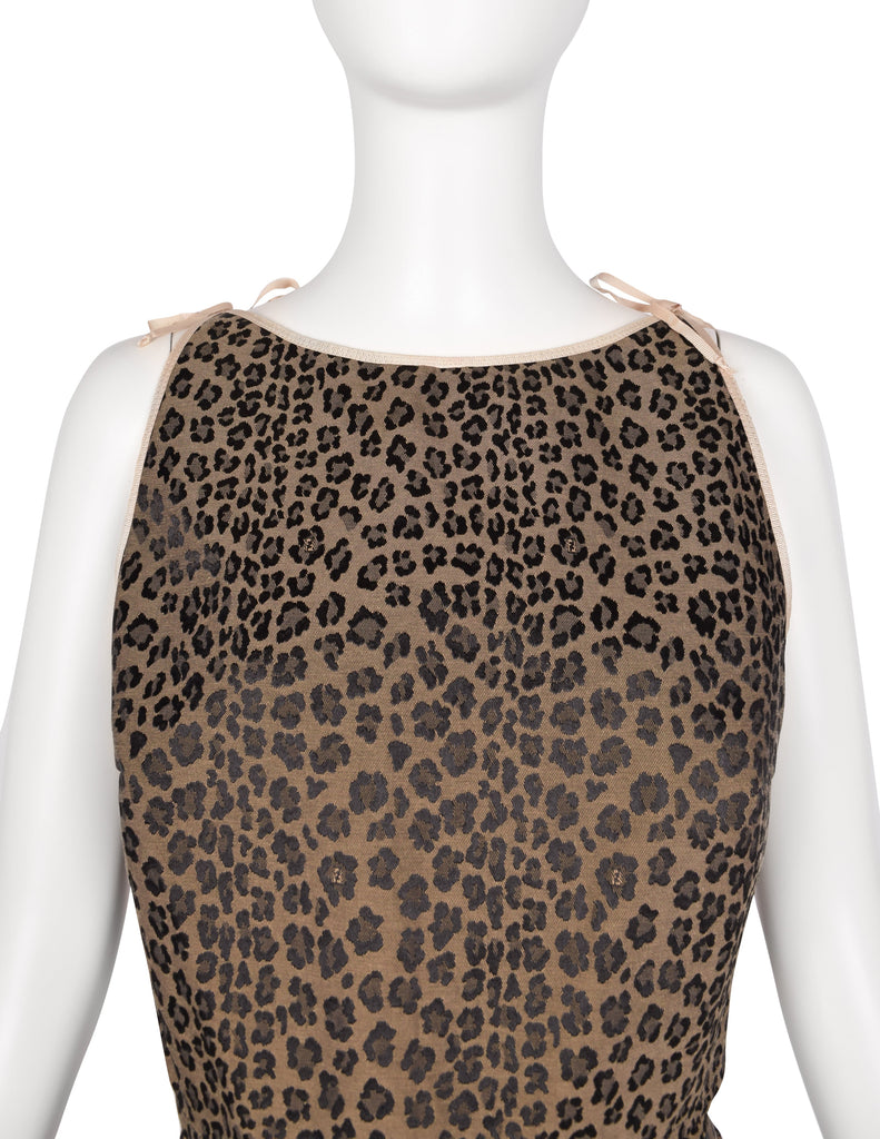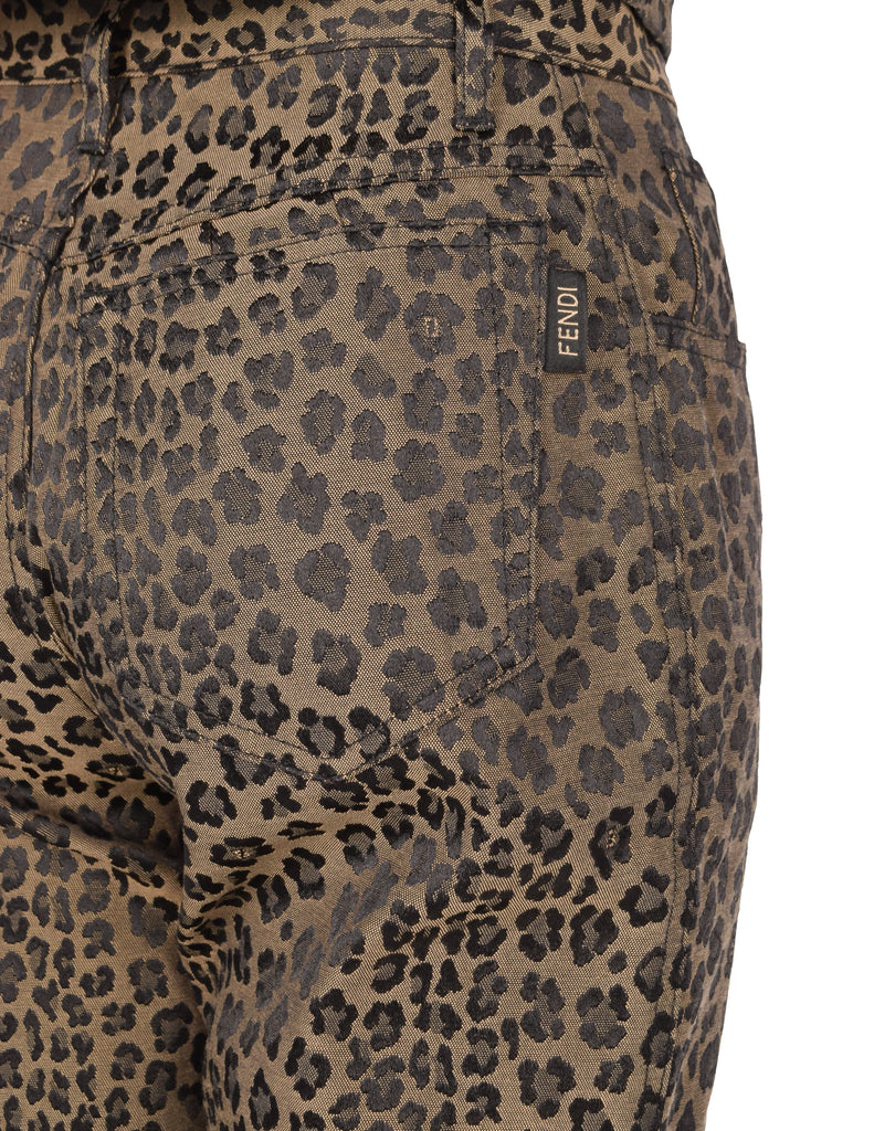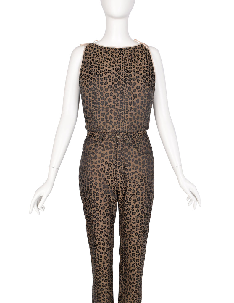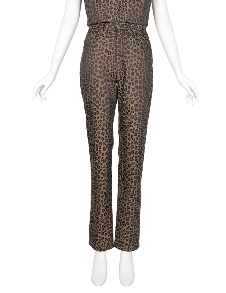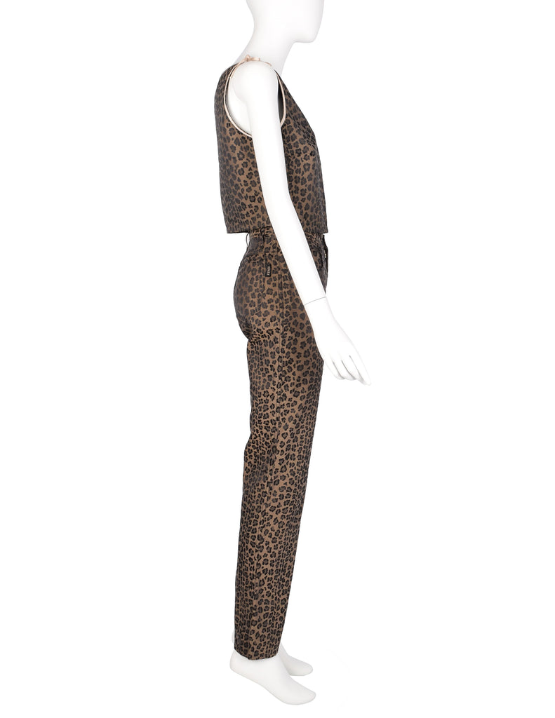 Magical vintage Fendi ensemble from the early 1990s. Remarkable leopard print in shades of brown and black with mini FF logos throughout. Denim styled pants with typical pockets and zip fly closure, high waist. Cutest cropped shell top trimmed in beige grosgrain ribbon that extends into straps that self tie at each shoulder, zip closure at side. Medium-weight and suitable for any season. Wear them together or on their own to maximize their potential within your wardrobe.