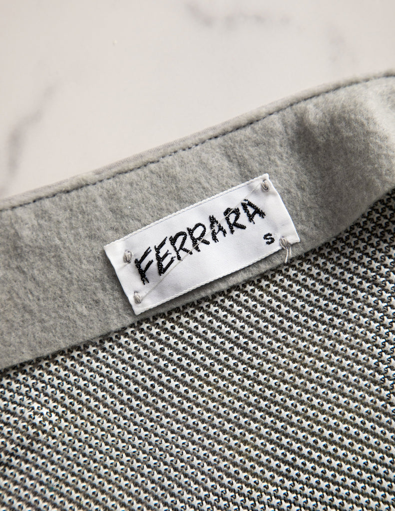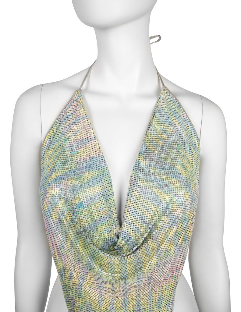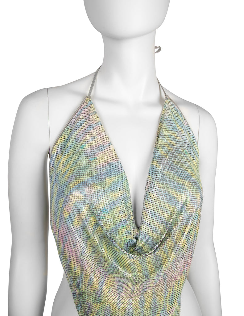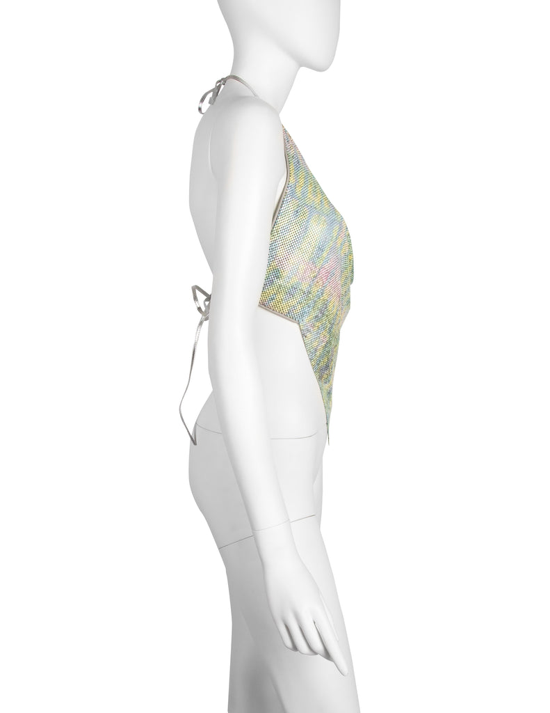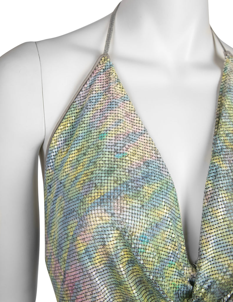 Out of this world halter top by the iconic metal mesh master, Anthony Ferrara. Sourced directly from the designer's personal archive, this unique beauty is a wearable work of art and a treasure to behold. Super sexy draping cowl neckline with a pointed V front that forms to the body like no other. Hand joined and hand printed metal mesh featuring a subtle animal print in the most gorgeous pastel palette. Detailed in grey cotton, with silver leather adjustable self tie straps at the neck and back. Felt facing at the sides of the bust for comfort. This one of a kind piece has never been worn.
