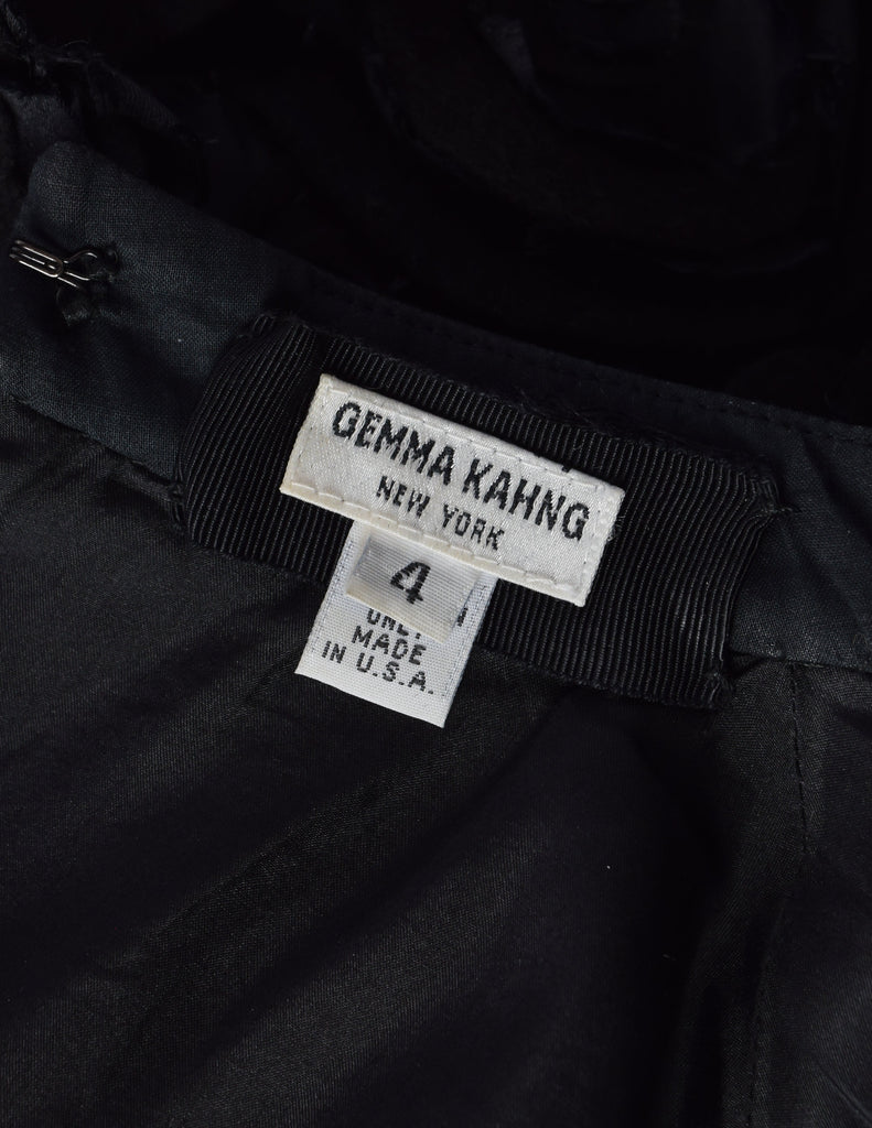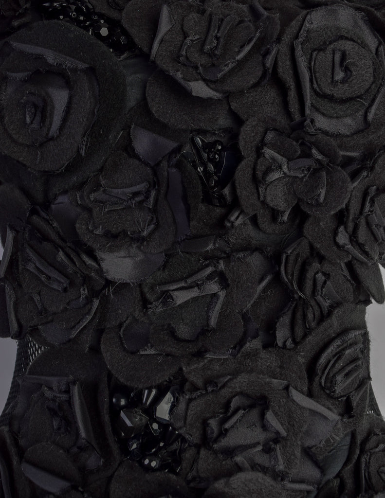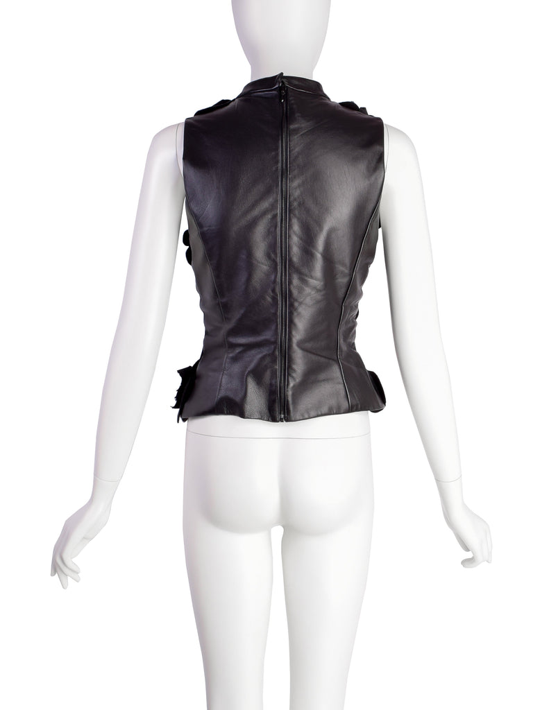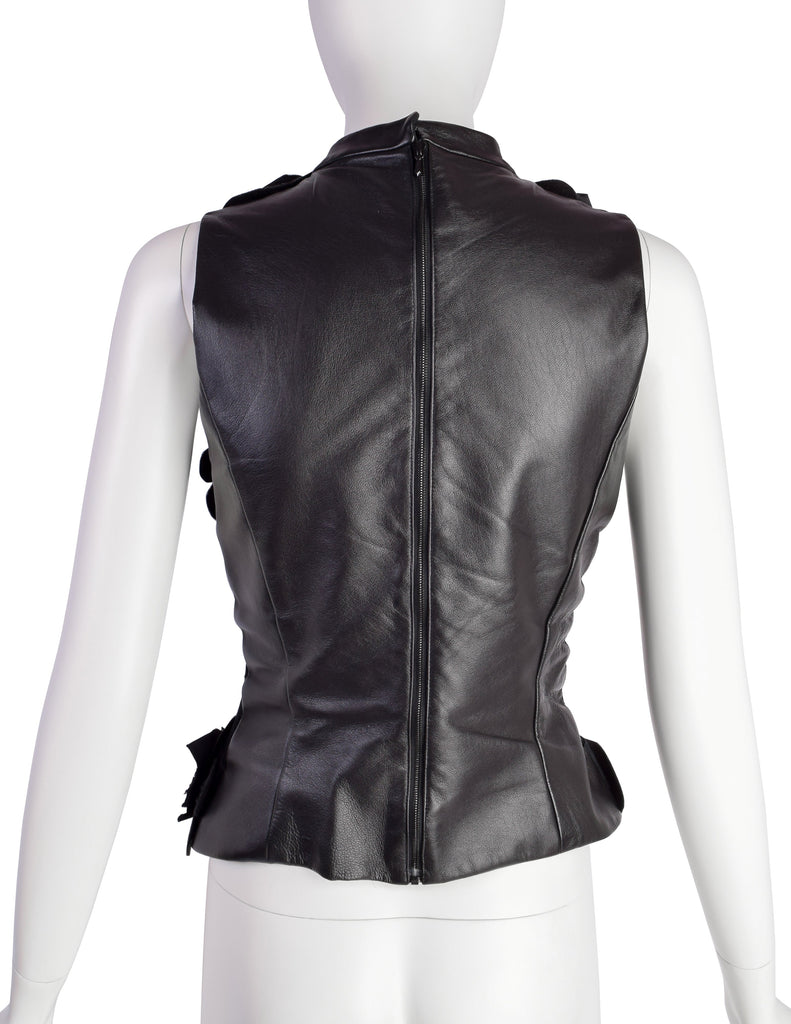 Rare and incredible vintage 1990s top by Gemma Kahng. This piece is out of this world, featuring three dimensional felt and silk floral embellishments all over the front side (on top of silk). See-through fishnet siding that cuts in toward the ribs/stomach. Solid backside consisting of soft leather, with a zip closure along the middle. Fully lined in black silk and acetate, with the exception of the fishnet siding. This exceptional piece would look just as great paired with jeans as it would with a ball skirt.