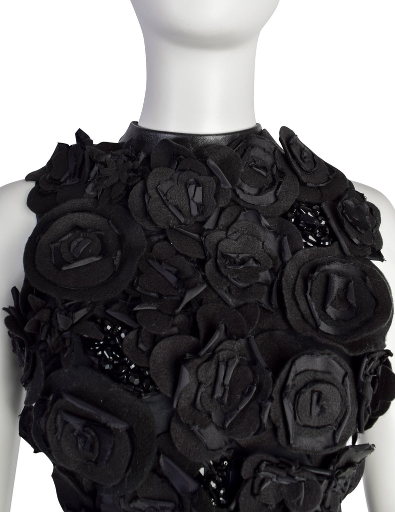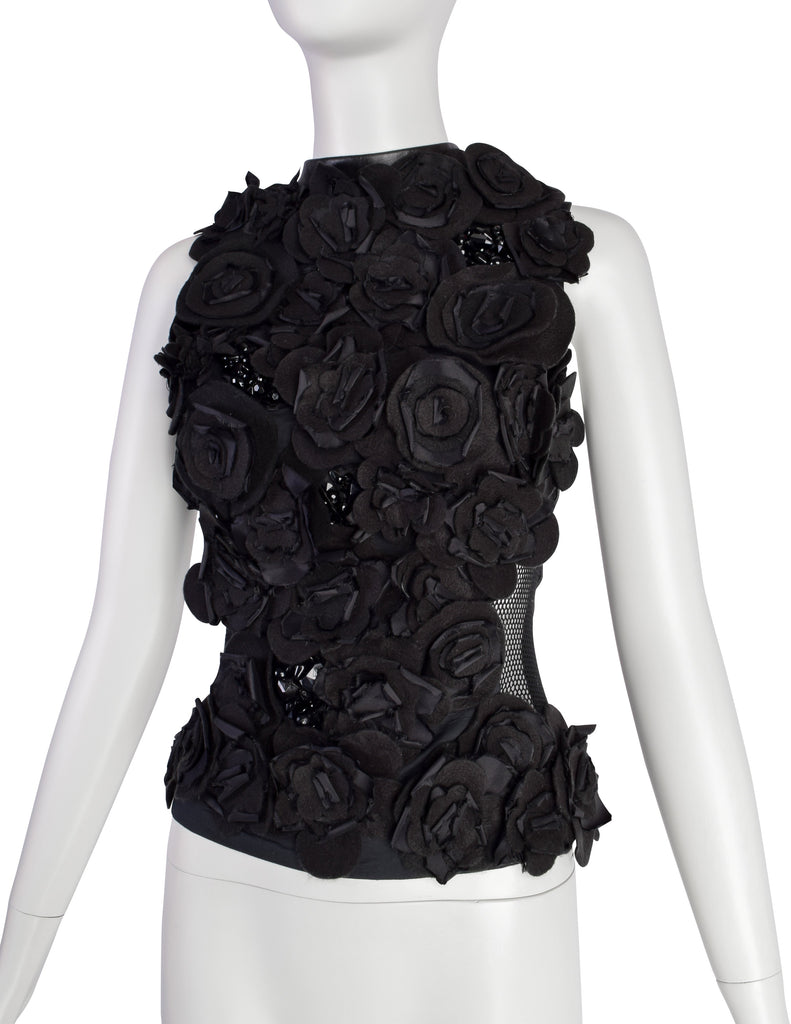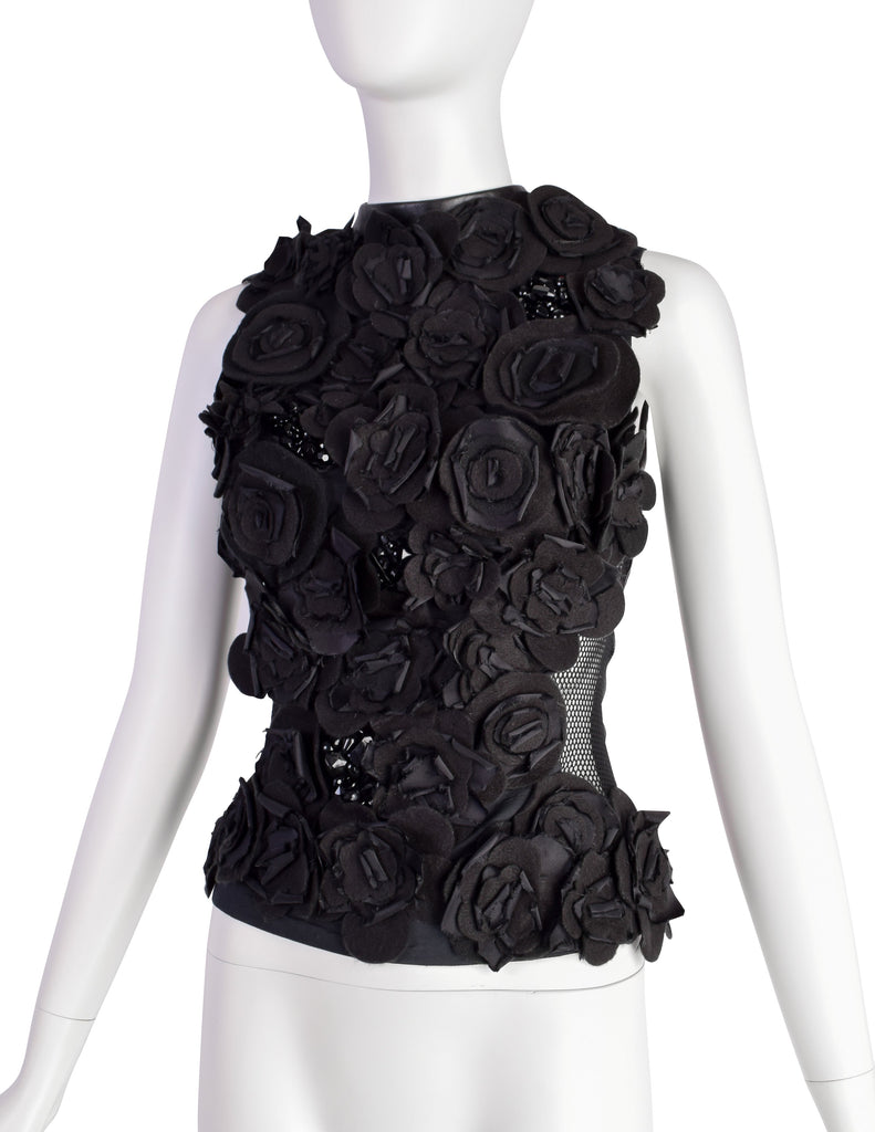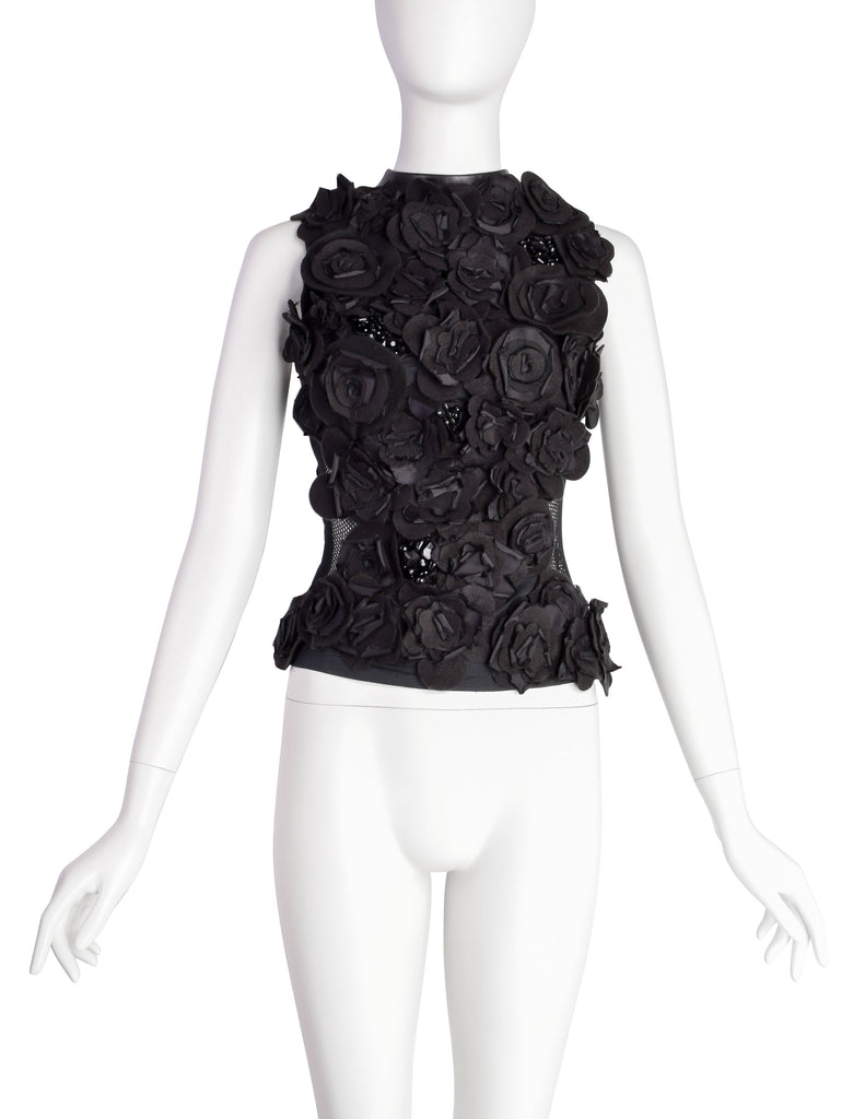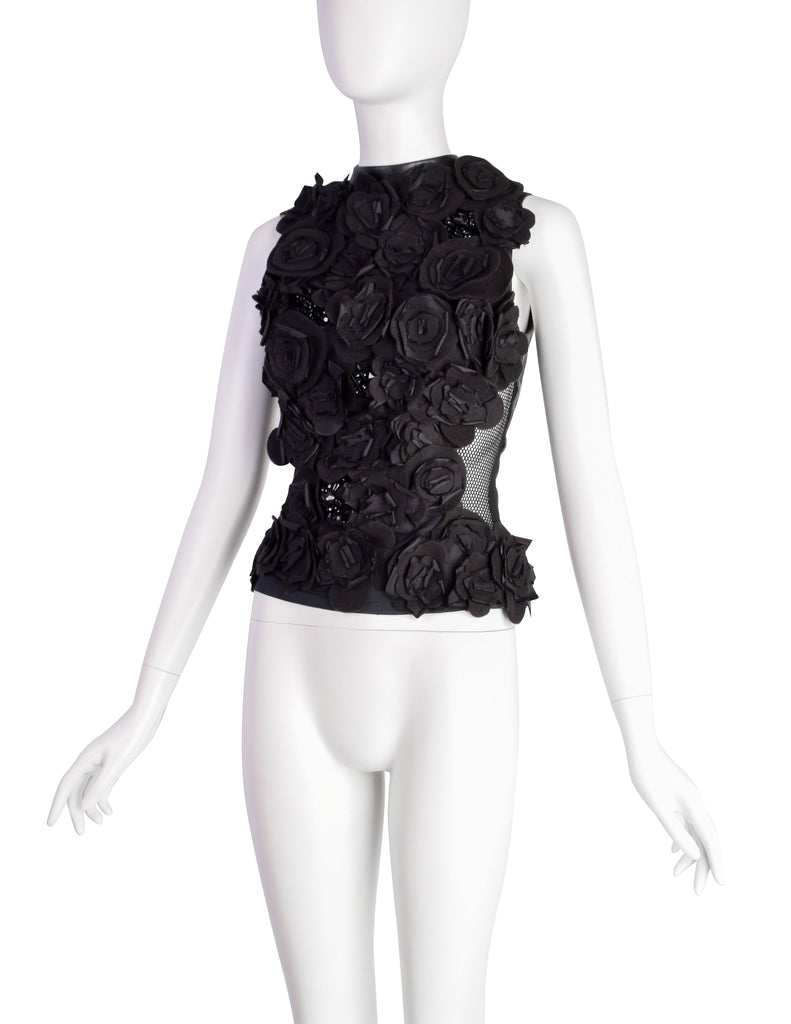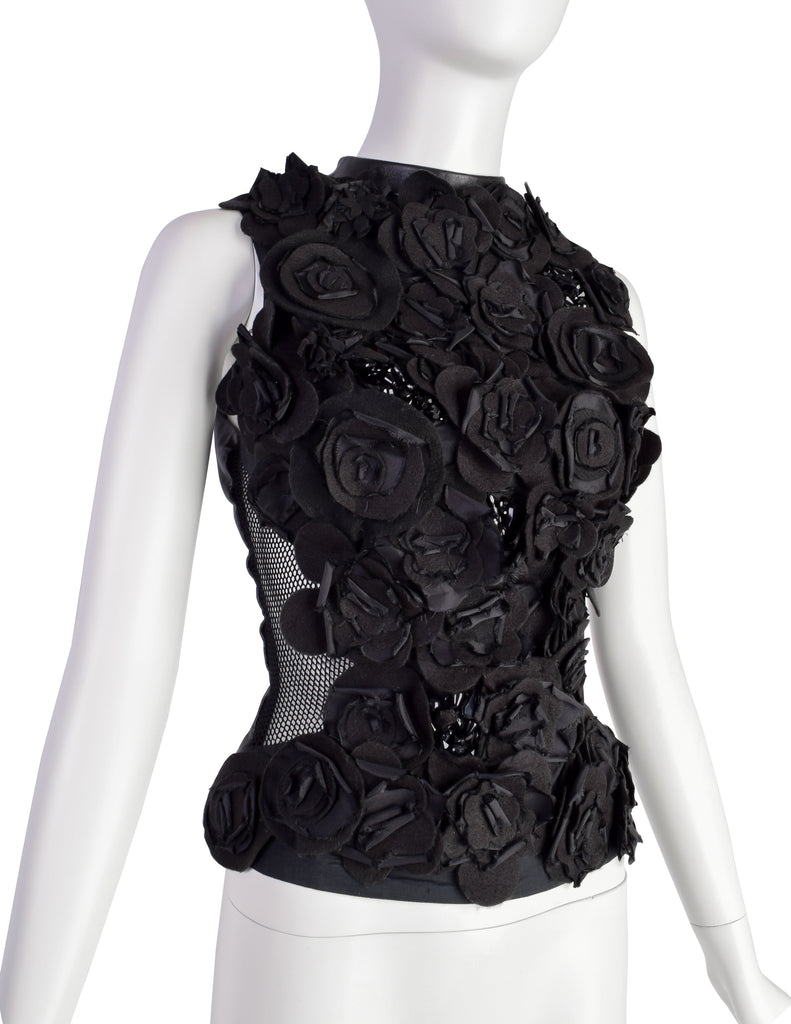 Gemma Kahng Vintage 1990s Black Flower Beaded Embellished Leather Fishnet Top