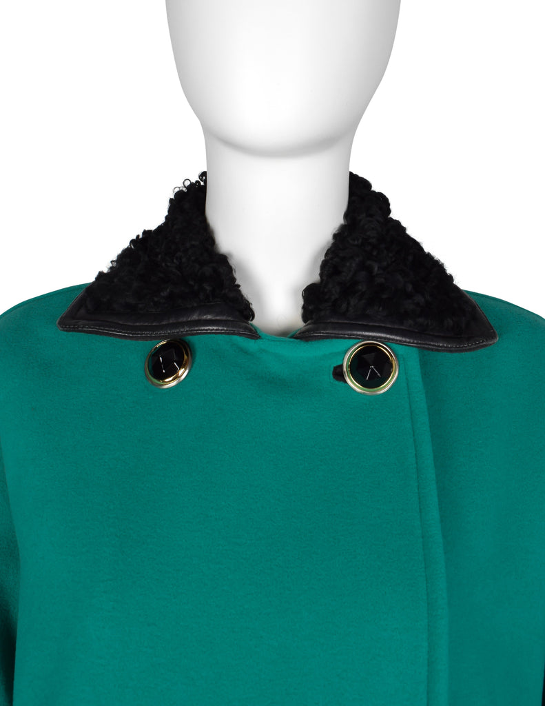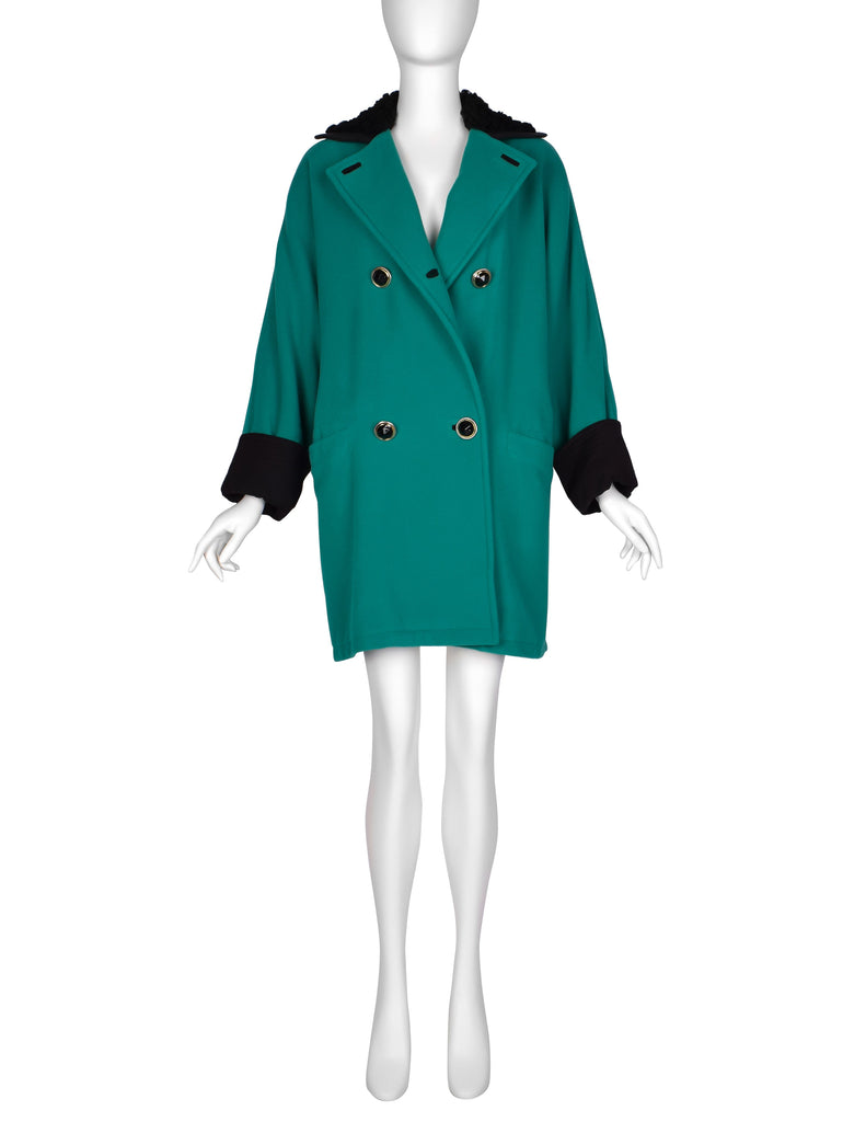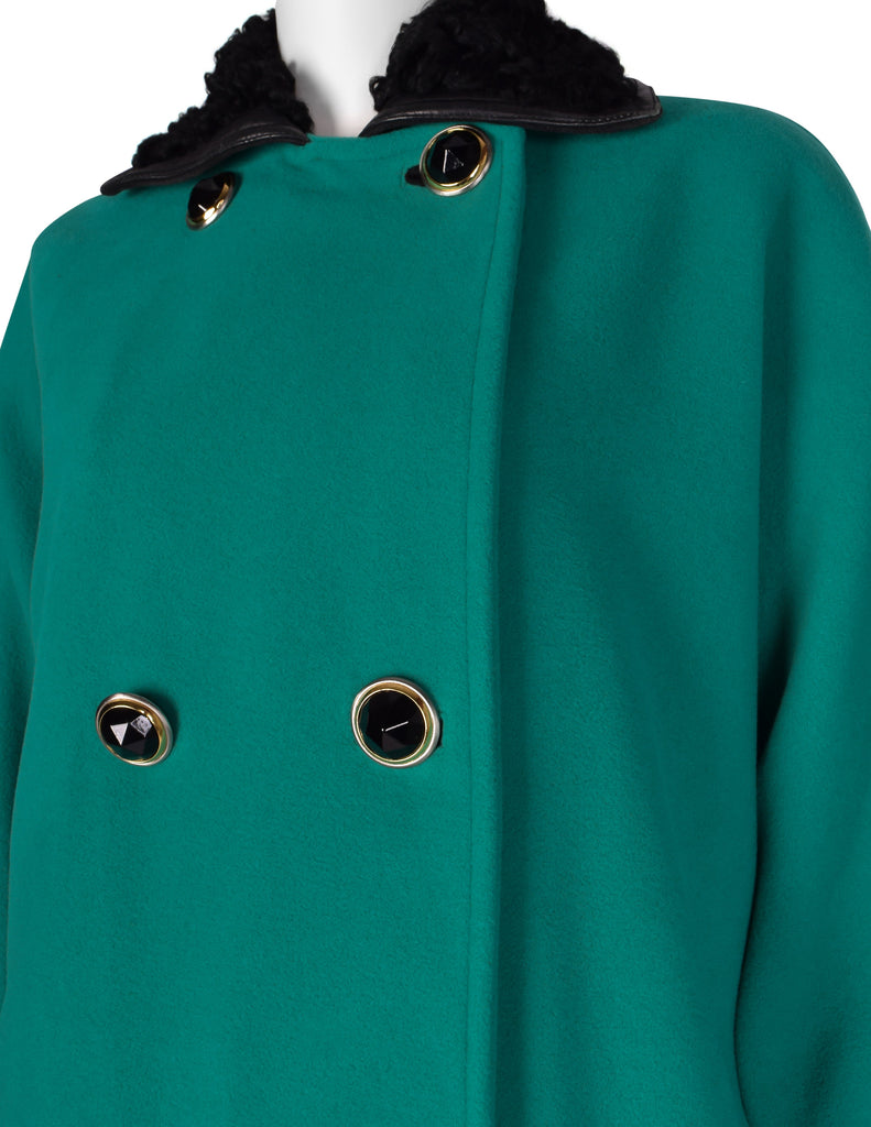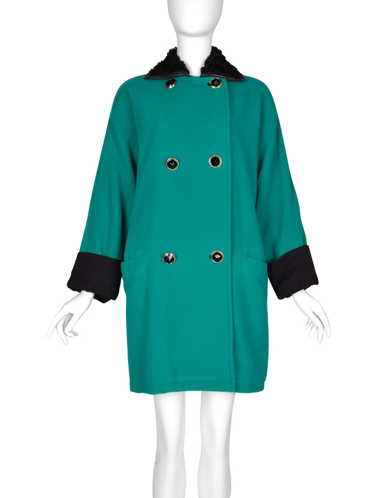 Gianni Versace Vintage 1990s Teal Wool Cashmere Shearling Collar Coat