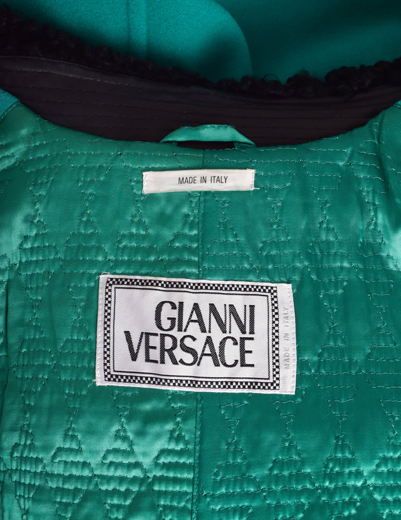 Fantastic vintage Gianni Versace coat from the early 1990s. Bold, teal green wool and cashmere blend. Black fabric cuffs with stitched details, matching martingale at backside with coordinating buttons. Leather trimmed collar with curly shearling, and suede underside. Double breasted closure at front with large silver, gold, and black spike buttons. Amazing quilted satin lining. Saint lined pockets at front. Lightly padded shoulder. So very Versace!
