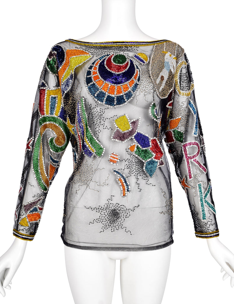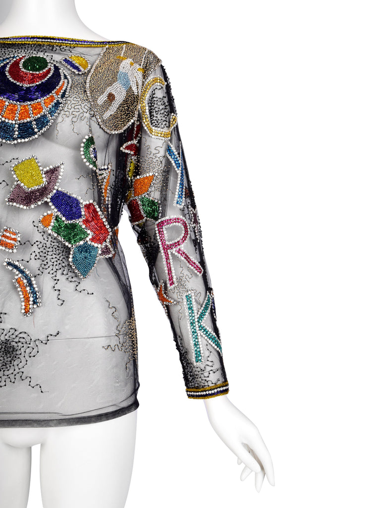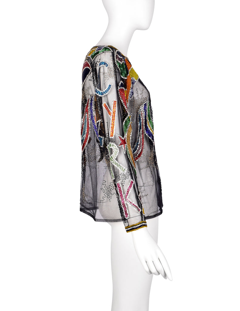 Extraordinary vintage Gianni Versace Couture top, from Fall/Winter 1989, shown here documented on the runway. This rare and magical piece features a central theme of CYRK (Circus) and has the most captivating sparkle and shine. A black, sheer mesh tulle, double layered, completely hand embellished in the highest quality beading, crystals, and flat back rhinestones. Wide boatneck. Long sleeve. A remarkable piece of fashion history.