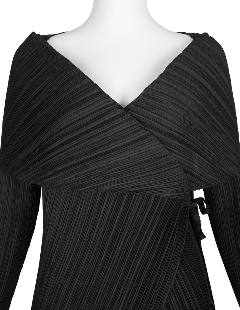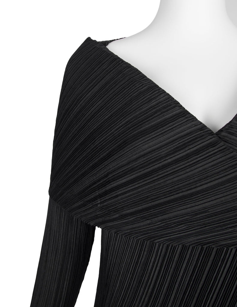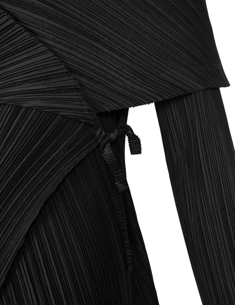 - Densely pleated silk-blend that expands like an accordion to the body.
