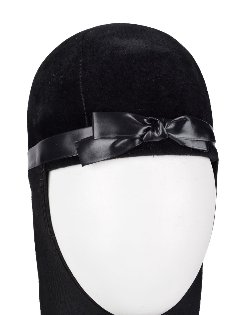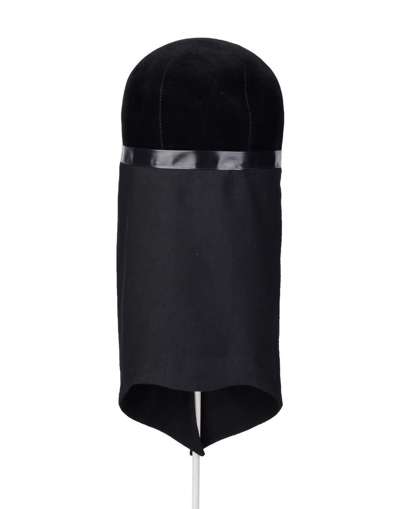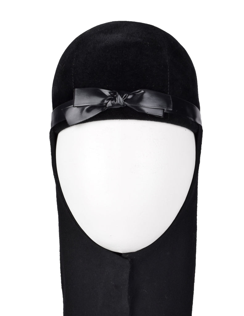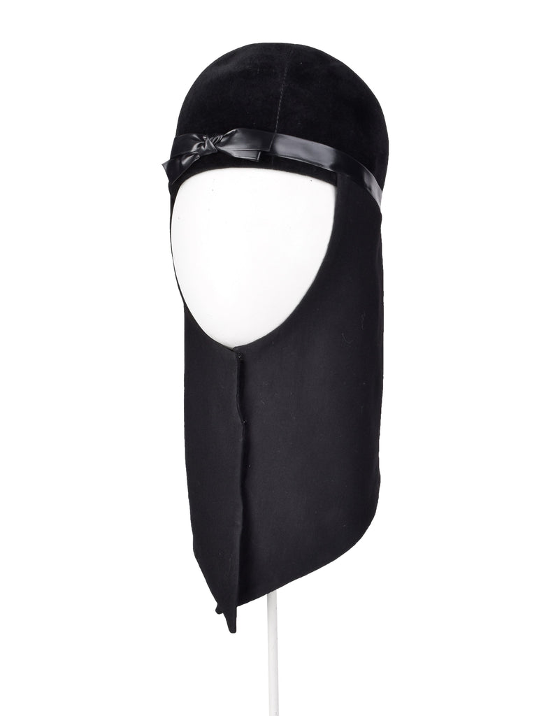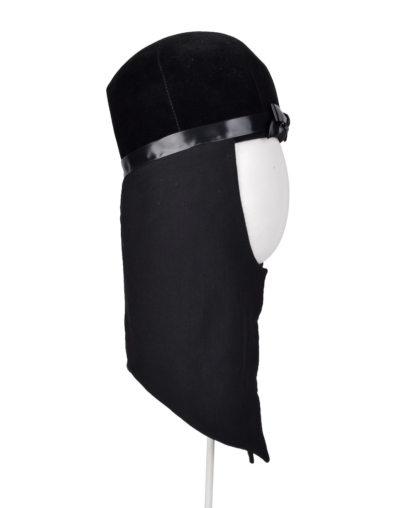 Rare and incredibly special vintage 1960s hat by Jacques Philippe. This is an insanely cool piece, embodying the essence of 1960s fashion. Rounded velvet upper with a shiny satin ribbon bow trimmer that almost feels like faux-leather. Attached, a wool neck piece that tapers toward the chest, curves the chin, and snaps closed at the front.