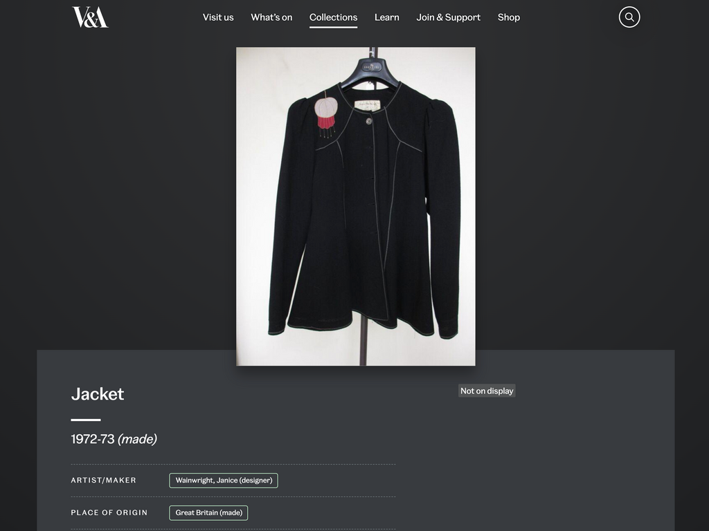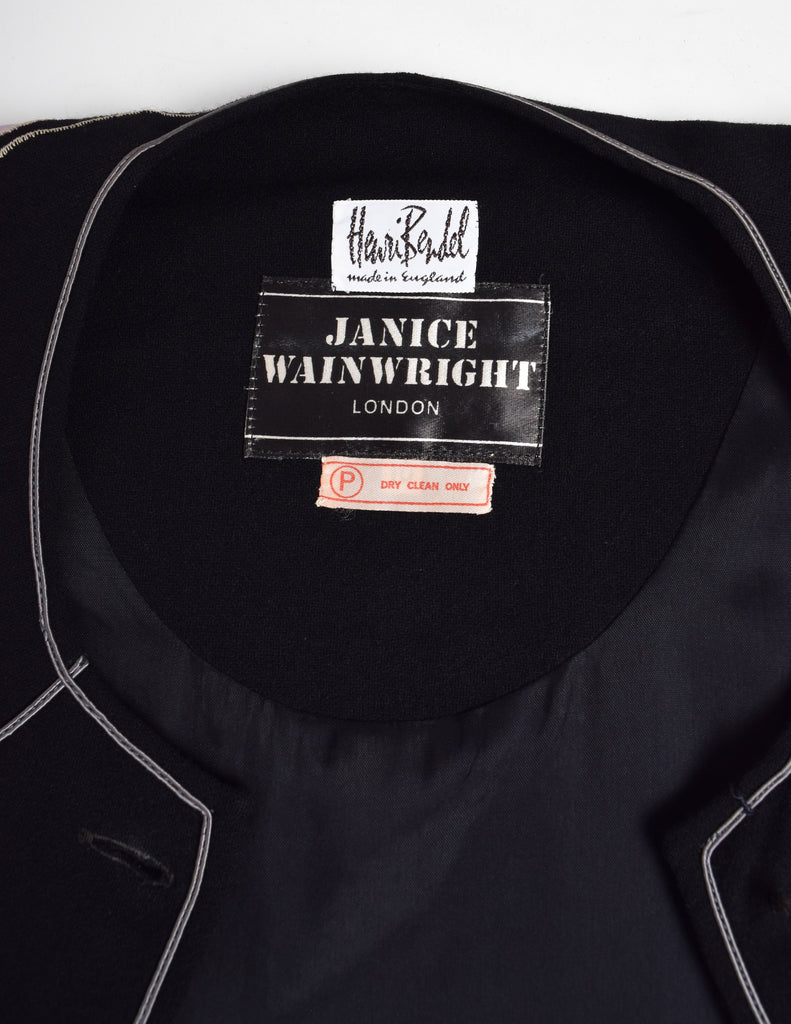 Stunning vintage Janice Wainwright jacket, circa 1972-73, as seen here as part of the V&A museum's collection. This beautiful piece comes in a medium-weight wool crepe, black, with a floral and bird silk applique and embroidery at the front and back, in a gorgeous color palette. Grey silken cord details along the seams throughout. Grey abalone button up front closure. Lightly padded shoulder for structure. Gorgeous fit at the bust that sort of flares out at the hem. Acetate lining at body, unlined sleeves.