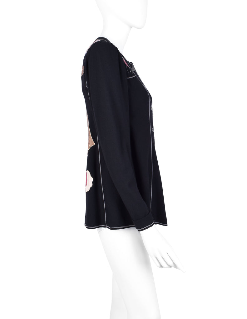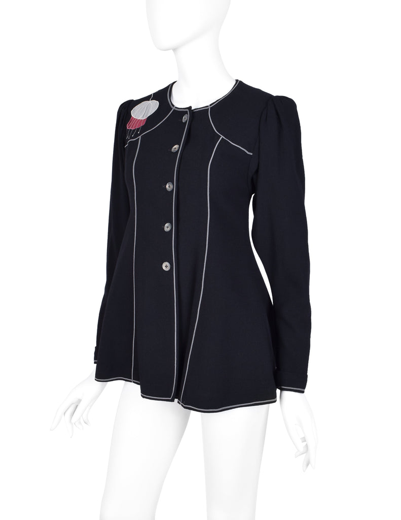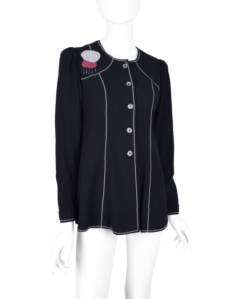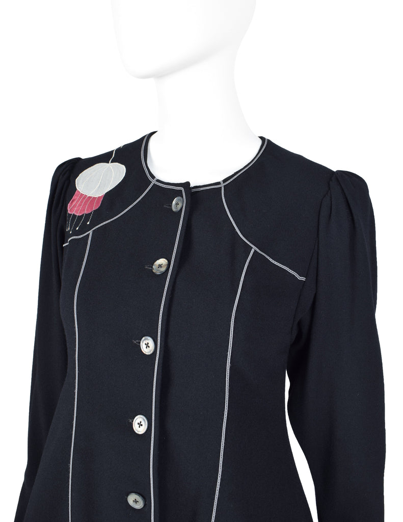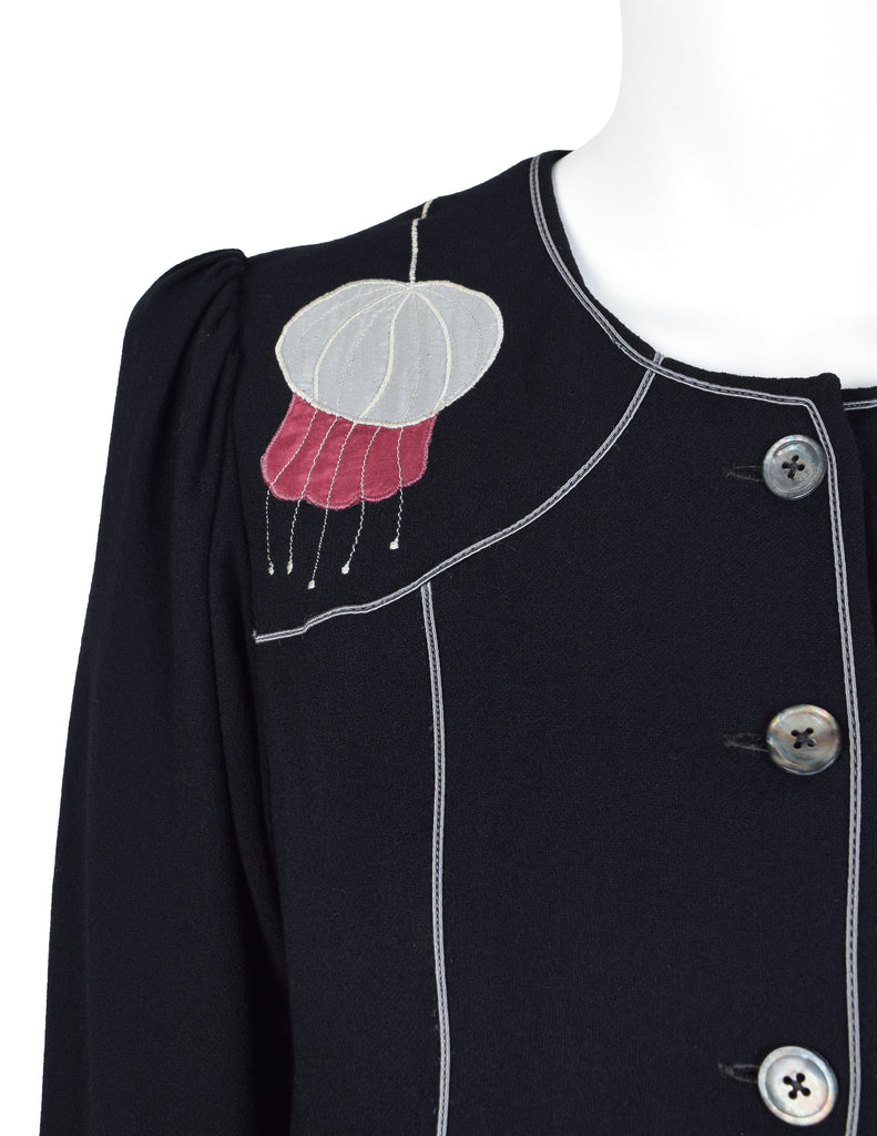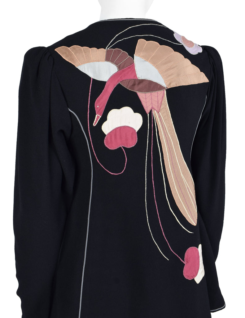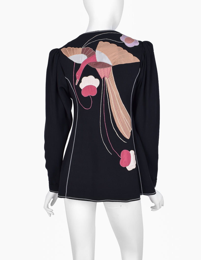 Janice Wainwright Vintage 1972-73 Bird Flower Applique Black Wool Crepe Jacket